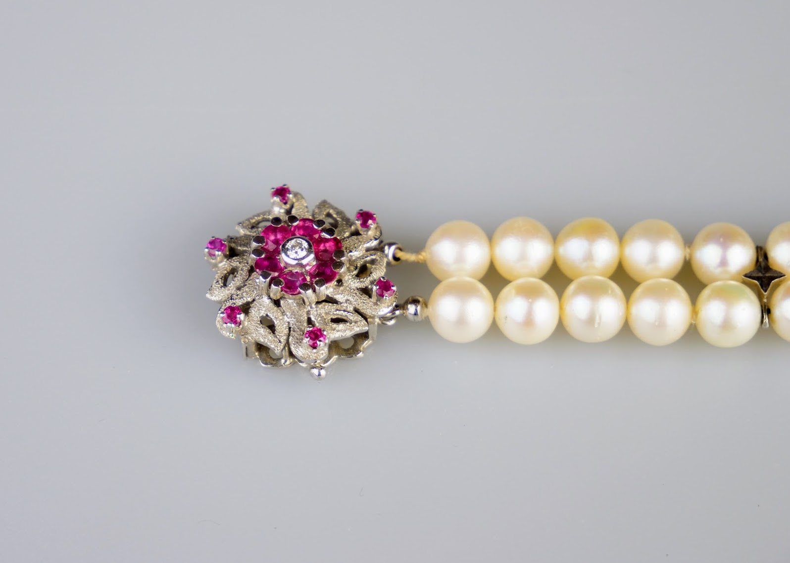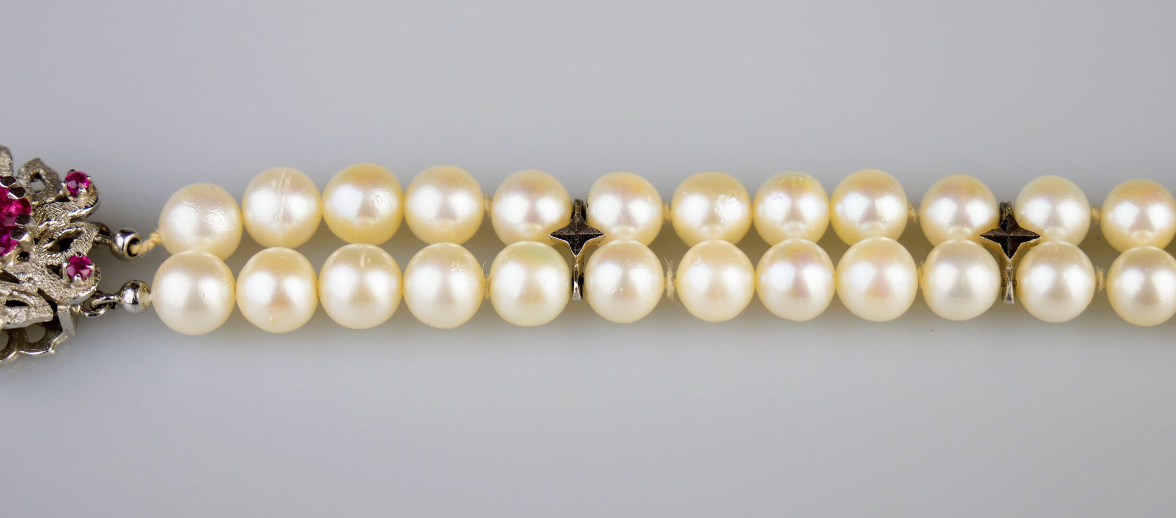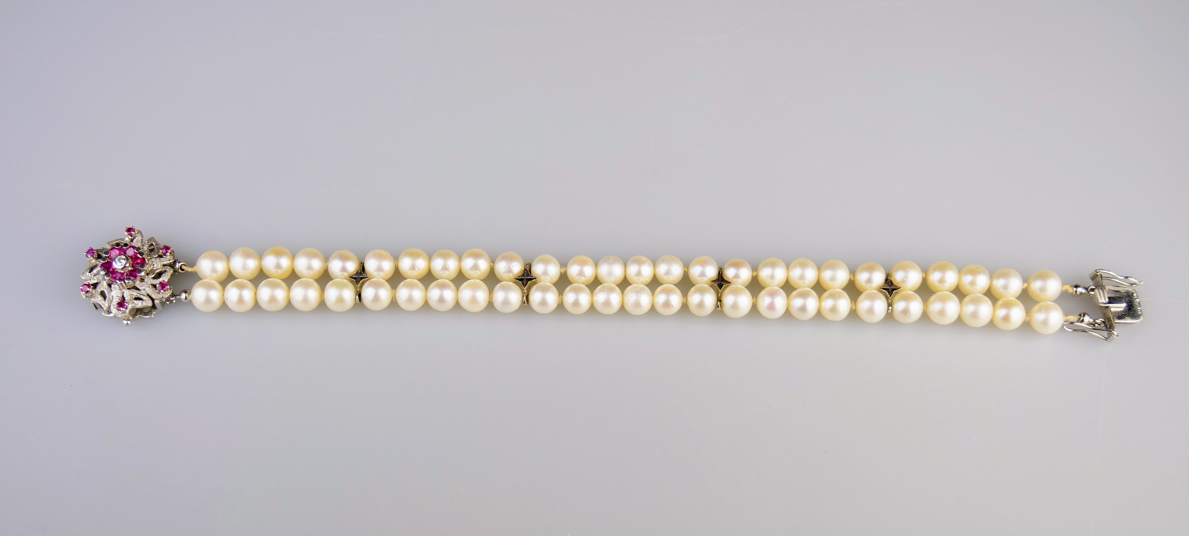 Dvouřadý perlový náramek se zapínáním a přepážkami z bílého zlata. Uzávěr osazen diamantem briliantového brusu o velikosti 0,1 ct a dvanácti rubíny. Celková hmotnost Au 26,28 g/585/1000, punc labuť (Z-58). Západní Evropa, třetí čtvrtina 20. století. Délka 20 cm, šířka 2 cm, průměr uzávěru 2 cm.