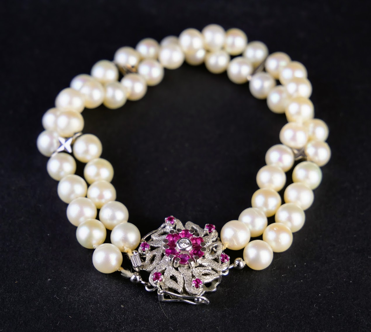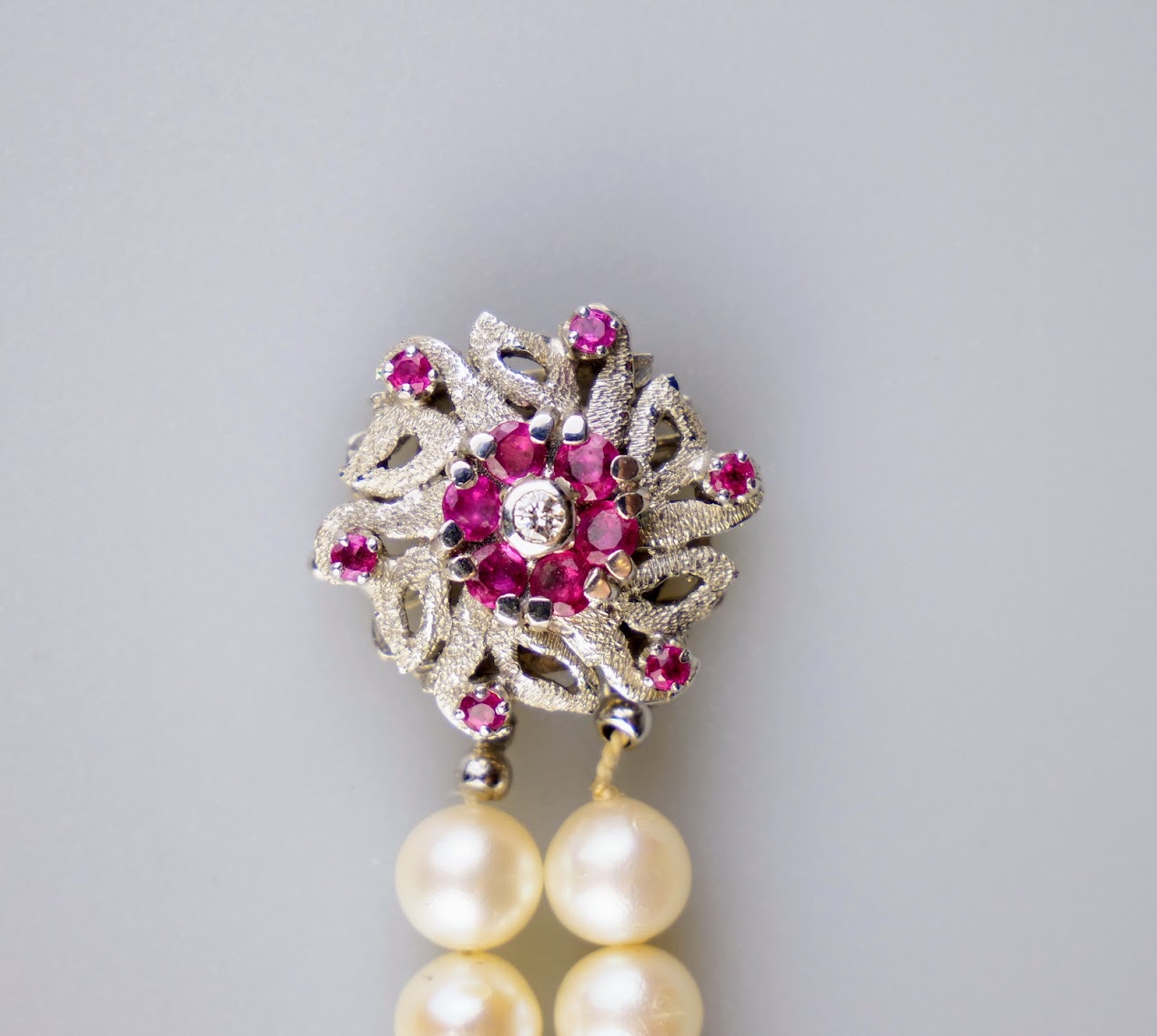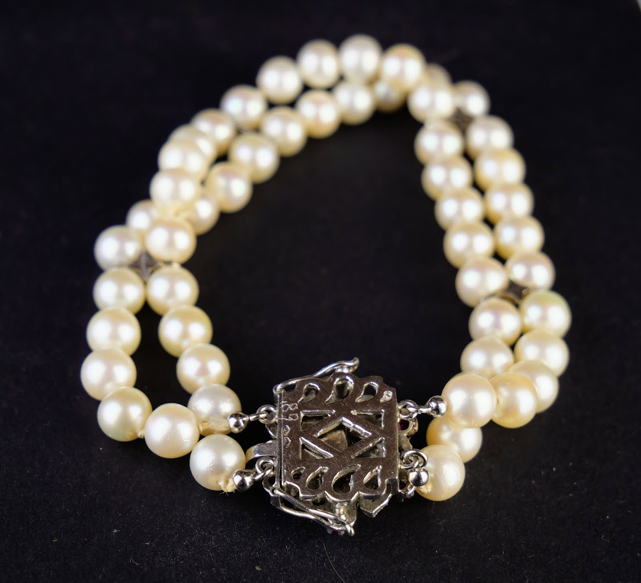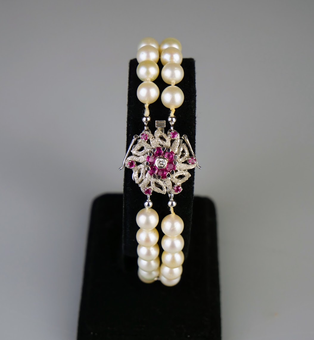 Dvouřadý perlový náramek se zapínáním a přepážkami z bílého zlata. Uzávěr osazen diamantem briliantového brusu o velikosti 0,1 ct a dvanácti rubíny. Celková hmotnost Au 26,28 g/585/1000, punc labuť (Z-58). Západní Evropa, třetí čtvrtina 20. století. Délka 20 cm, šířka 2 cm, průměr uzávěru 2 cm.