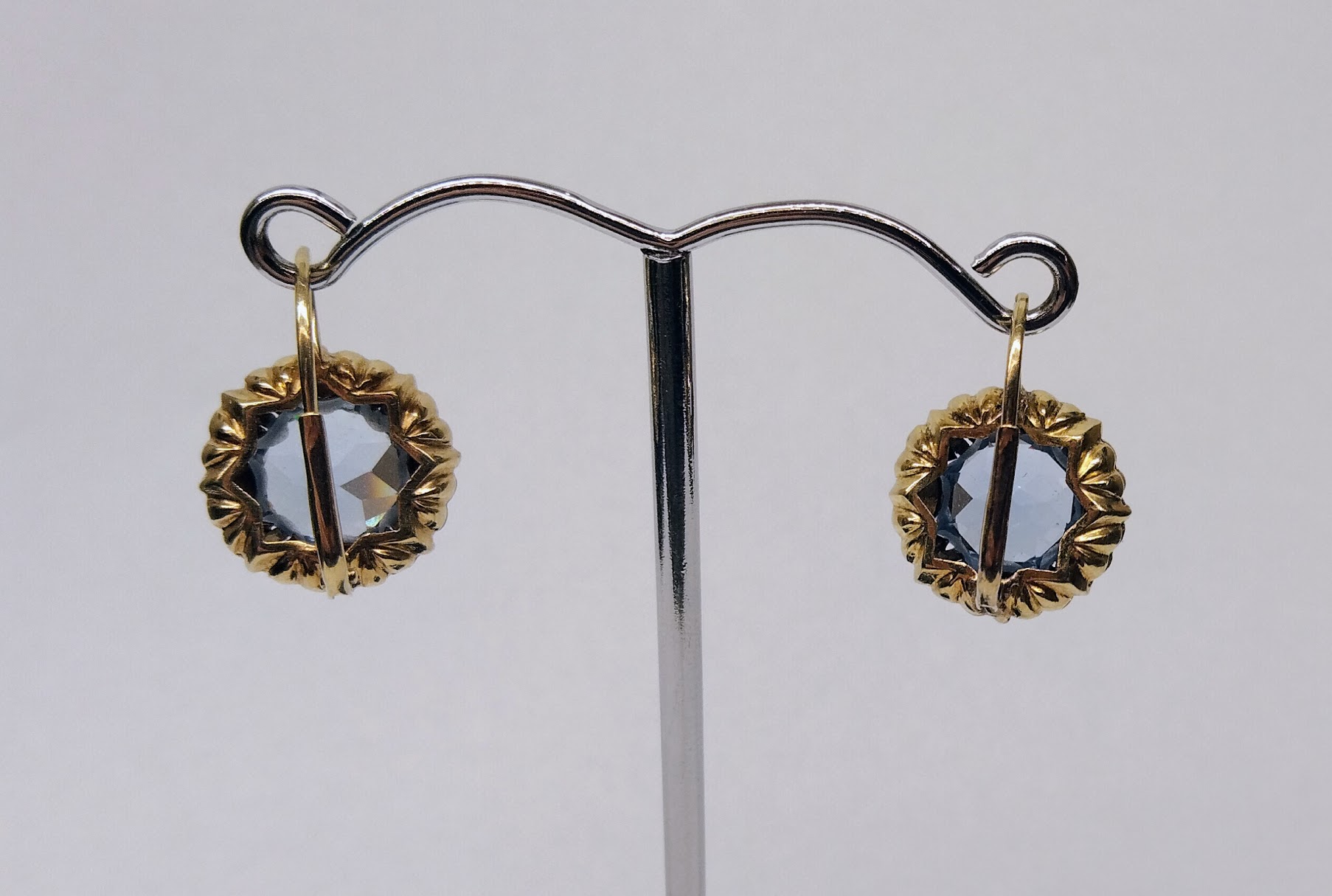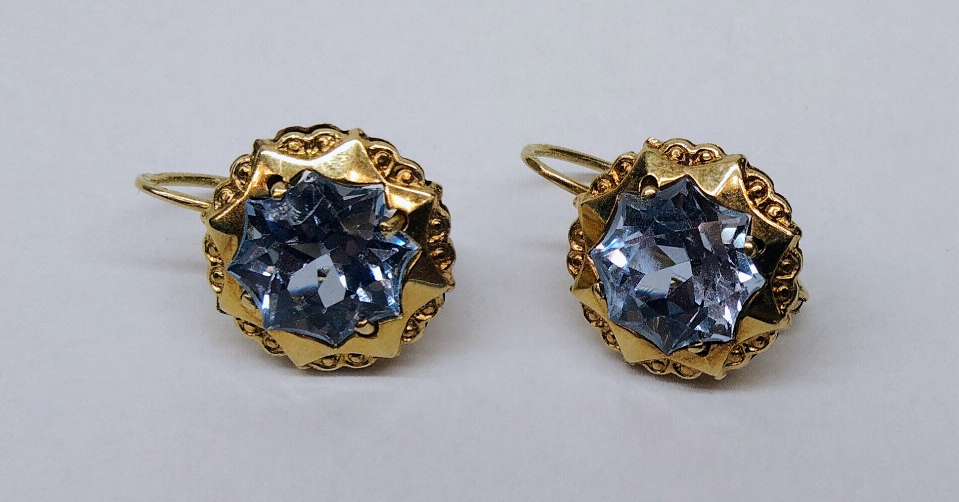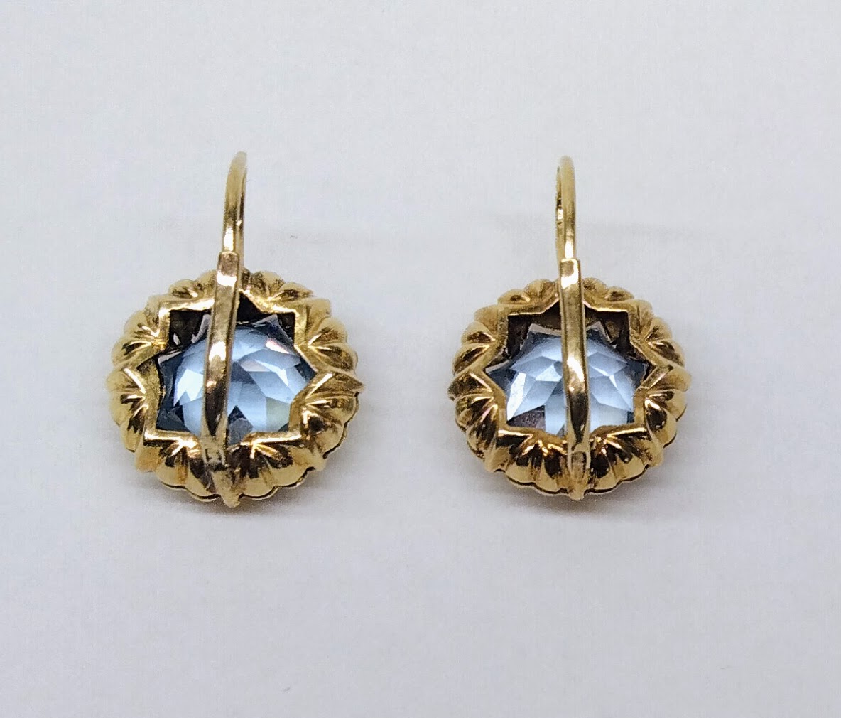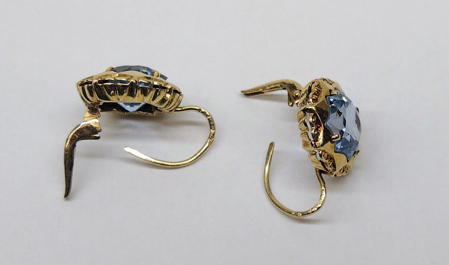 Zlaté art-deco náušnice s blankytně modrými syntetickými kameny. Celková hmotnost 4,72 g, Au 585/1000, punc lev (Z – 45), ryzostní číslo, značka výrobce v kartuši PA. Klasické pevné patentní zapínání, velmi dobrý stav. Republika Československá, první třetina 20. století. Délka náušnic s háčkem 1,9 cm, bez háčku 2,2 cm.