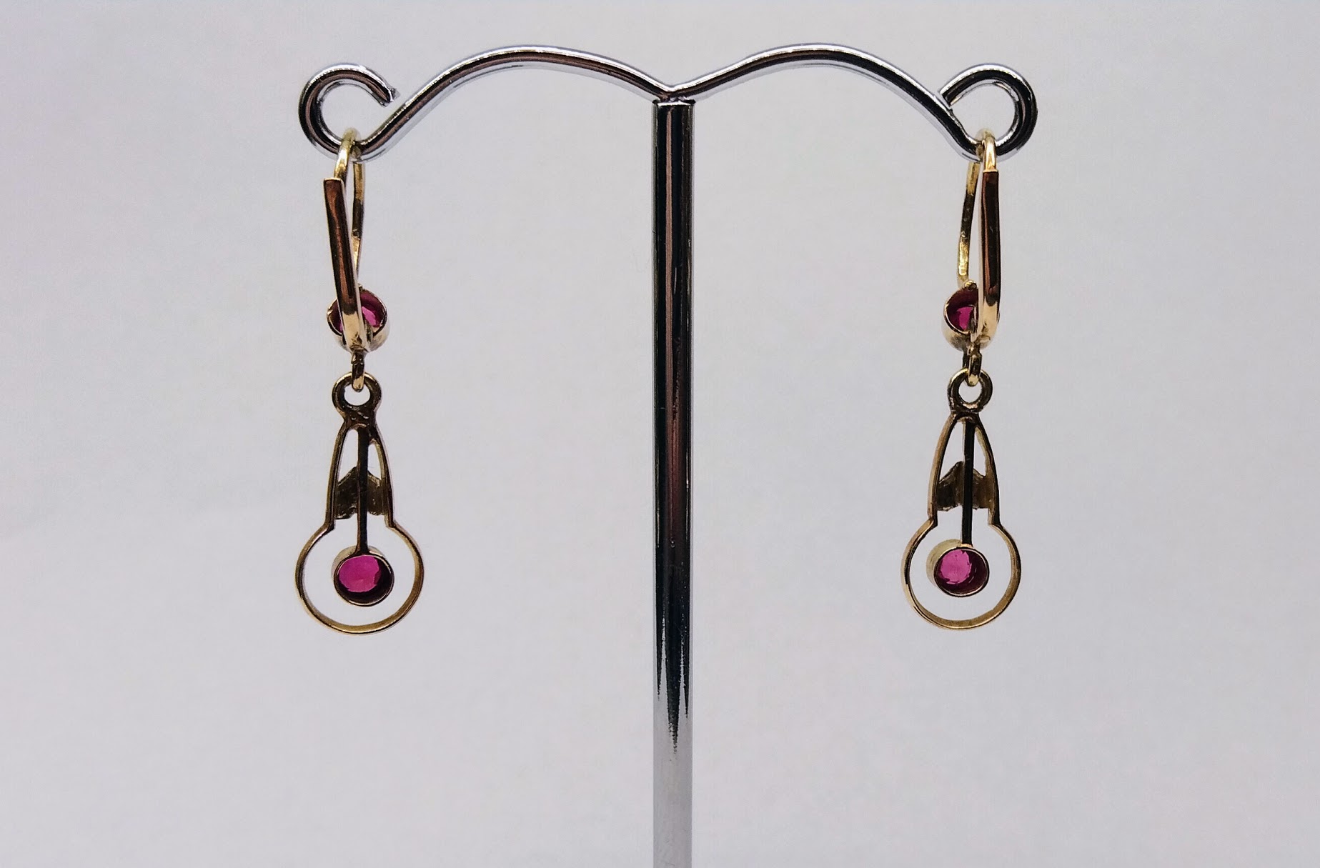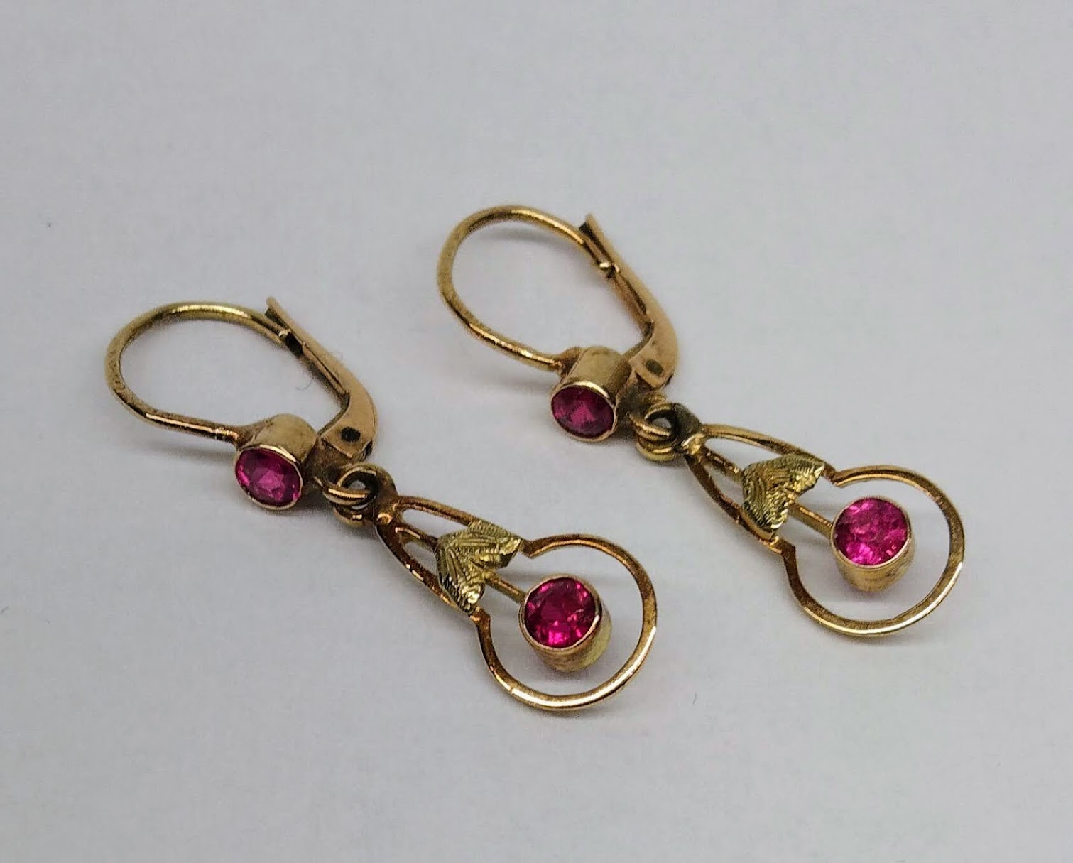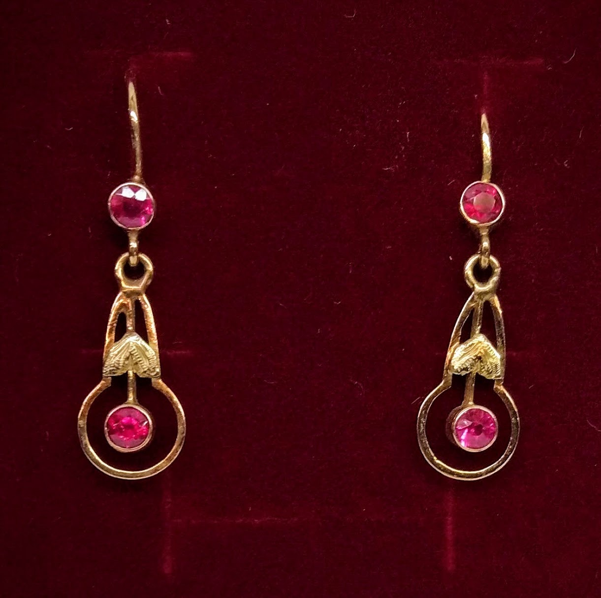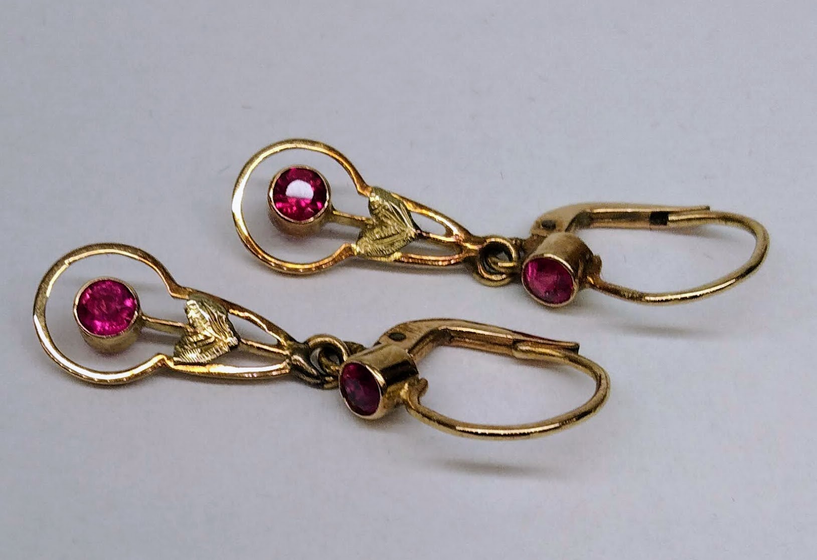 Zlaté pozdně secesní náušnice se syntetickými rubíny. Celková hmotnost 2,11 g, Au 580/1000, punc čejka (Z – 36). Klasické pevné patentní zapínání, velmi dobrý stav. Republika Československá, první třetina 20. století. Celková délka náušnic s háčkem 3,2 cm, bez háčku 2,2 cm, šířka 0,8 cm.
