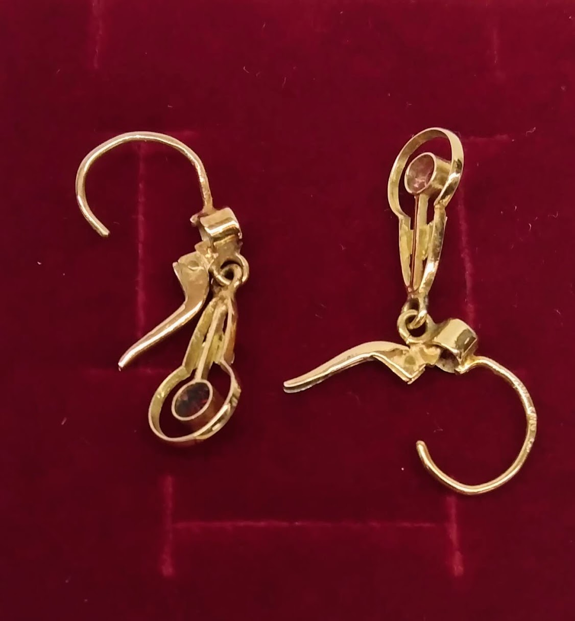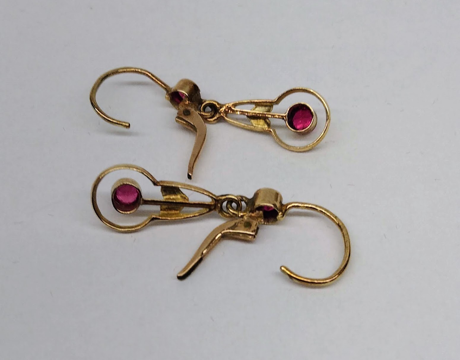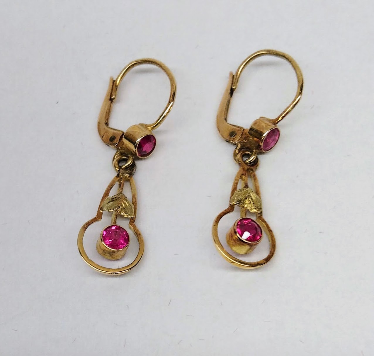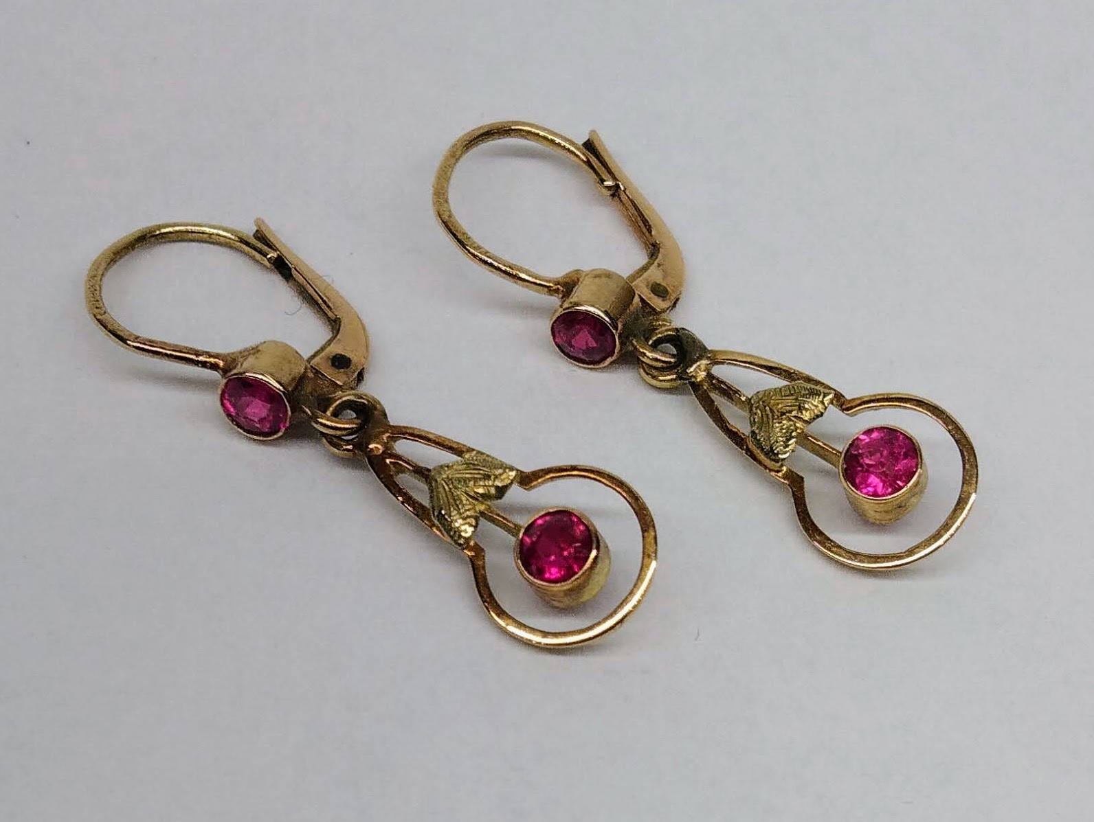 Zlaté pozdně secesní náušnice se syntetickými rubíny. Celková hmotnost 2,11 g, Au 580/1000, punc čejka (Z – 36). Klasické pevné patentní zapínání, velmi dobrý stav. Republika Československá, první třetina 20. století. Celková délka náušnic s háčkem 3,2 cm, bez háčku 2,2 cm, šířka 0,8 cm.