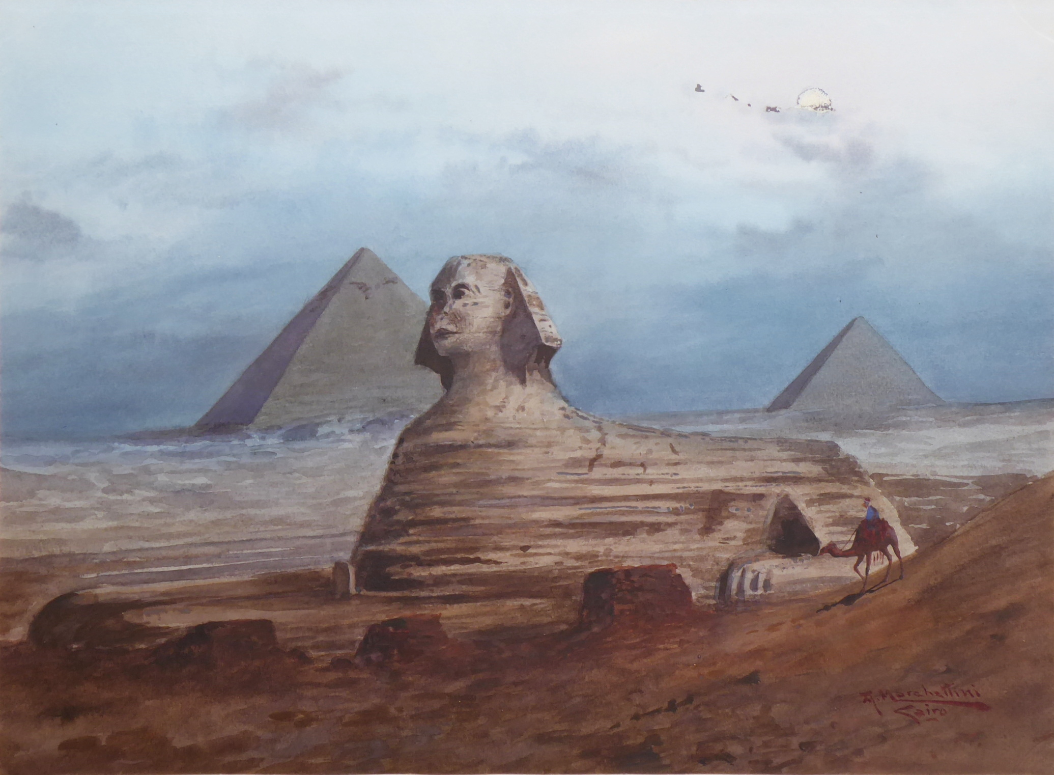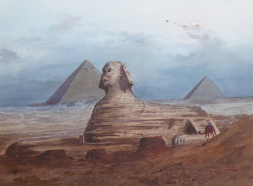 Akvarel a kvaš na papíru 31 cm x 44 cm. Signováno vpravo dole a nápis Cairo (Káhira). Velká sfinga v Gíze spolu s pyramidami zachycená před více jak sto lety. Ve zlaceném rámu dekorovaném reliéfními florálními ornamenty, s paspartou a sklem. Egypt, Káhira 1890 – 1920. Celkový rozměr s rámem 48 cm x 61 cm.