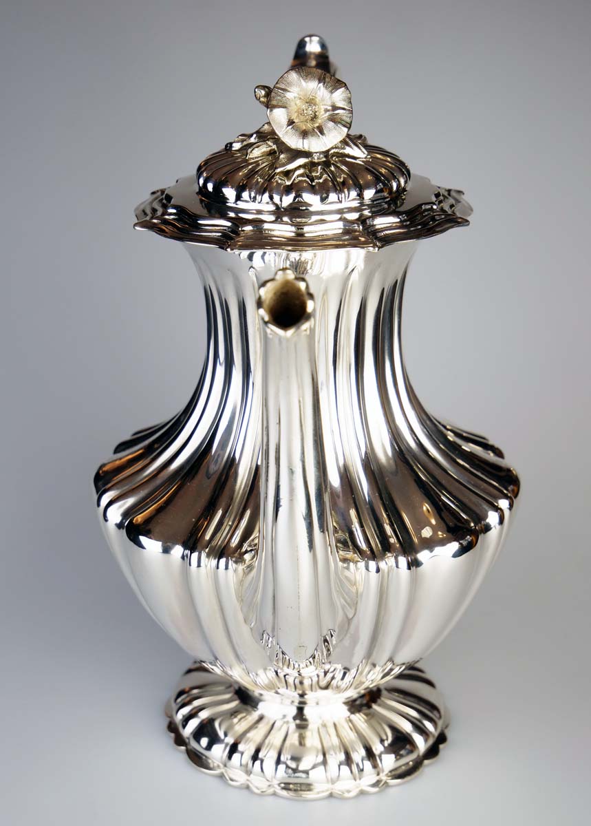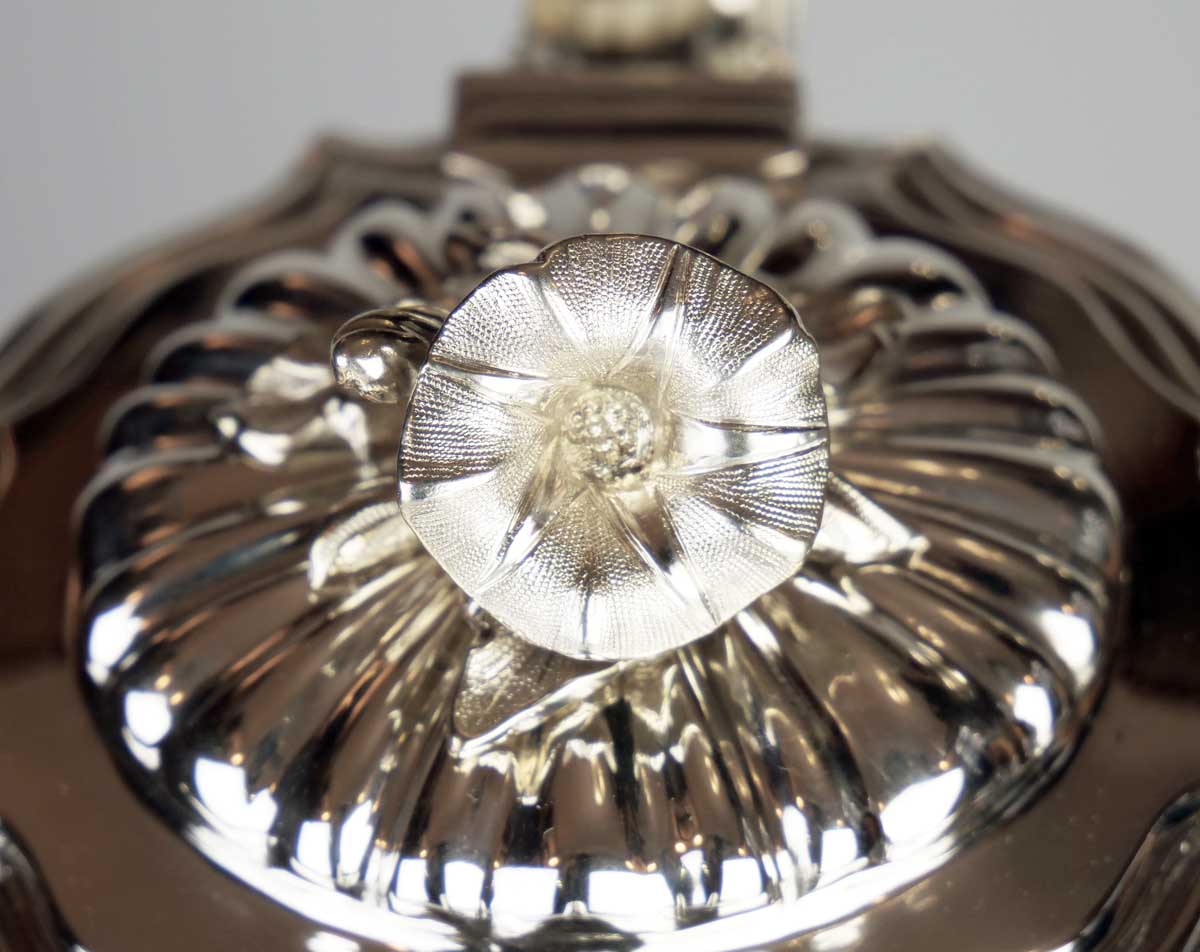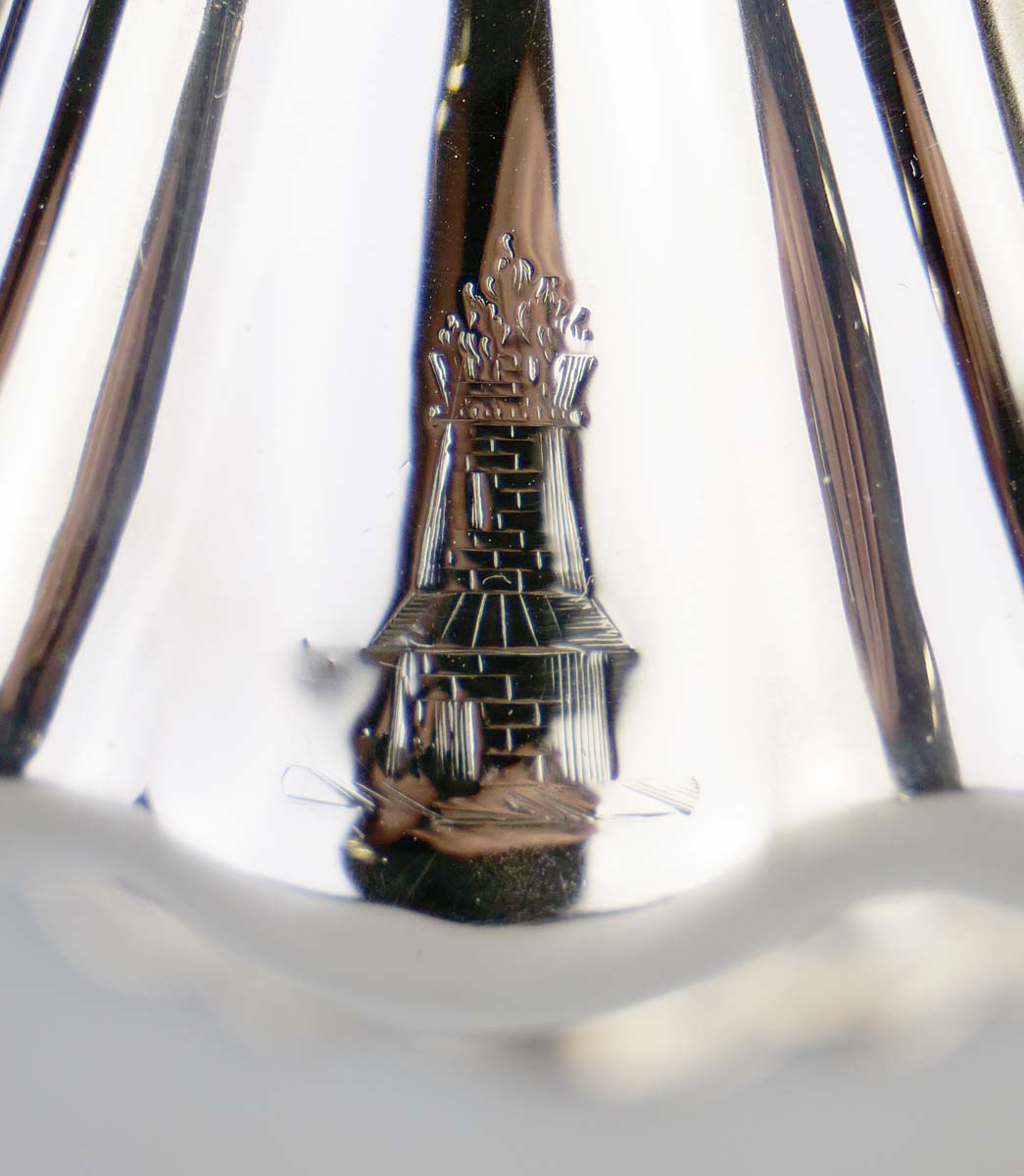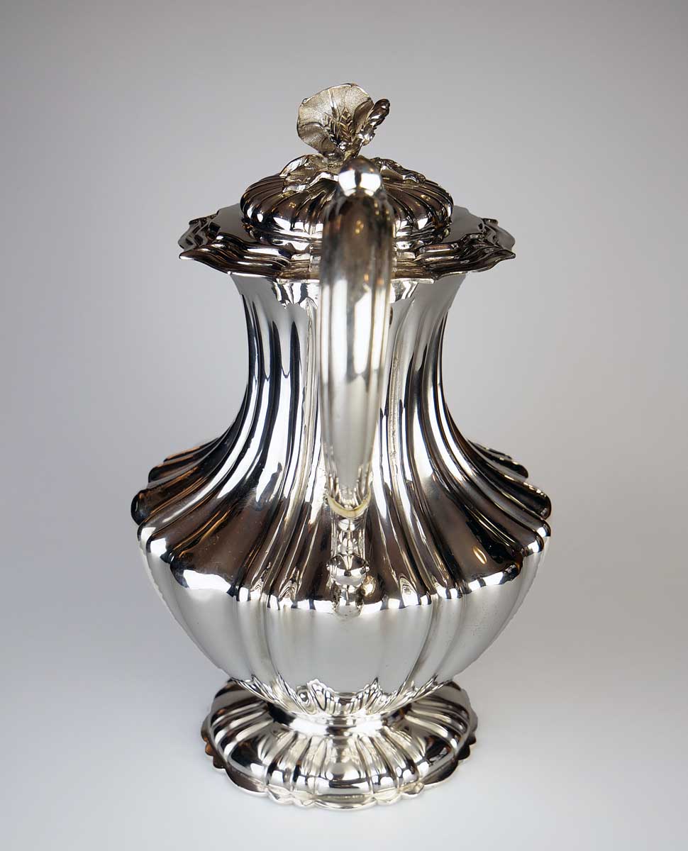 stříbrná konvice s víkem z dílny londýnského stříbrníka Johna Jamse Keitha, tepané sterlingové stříbro, na stranách vyryté zobrazení dávných majáků, Ag btto 840,00 g/925/1000, Anglie, Londýn, rok 1875, dobové puncovní značky s mistrovskou značkou; výška 23 cm, šířka s úchytem 26, průměr 15 cm