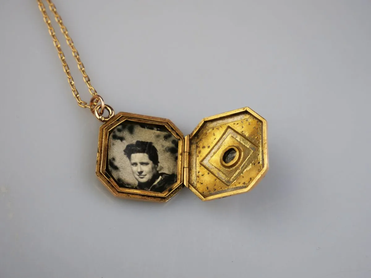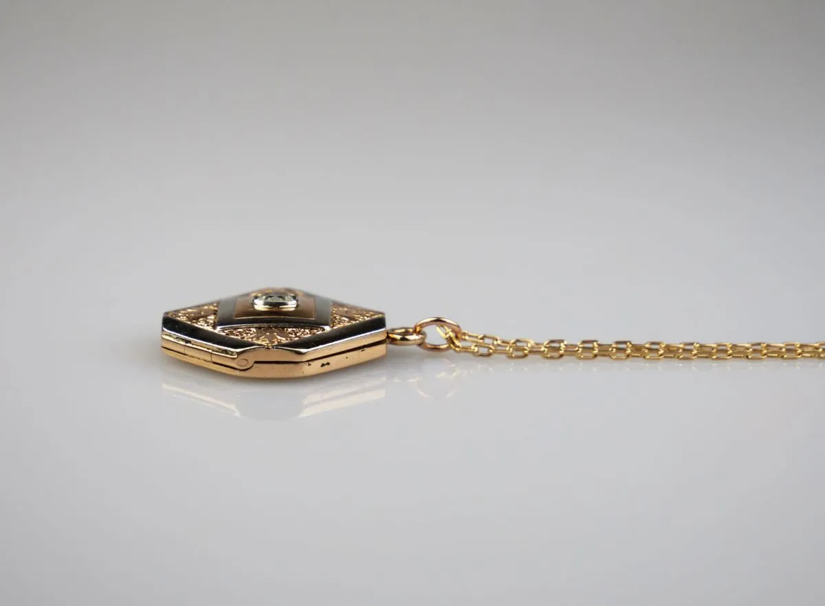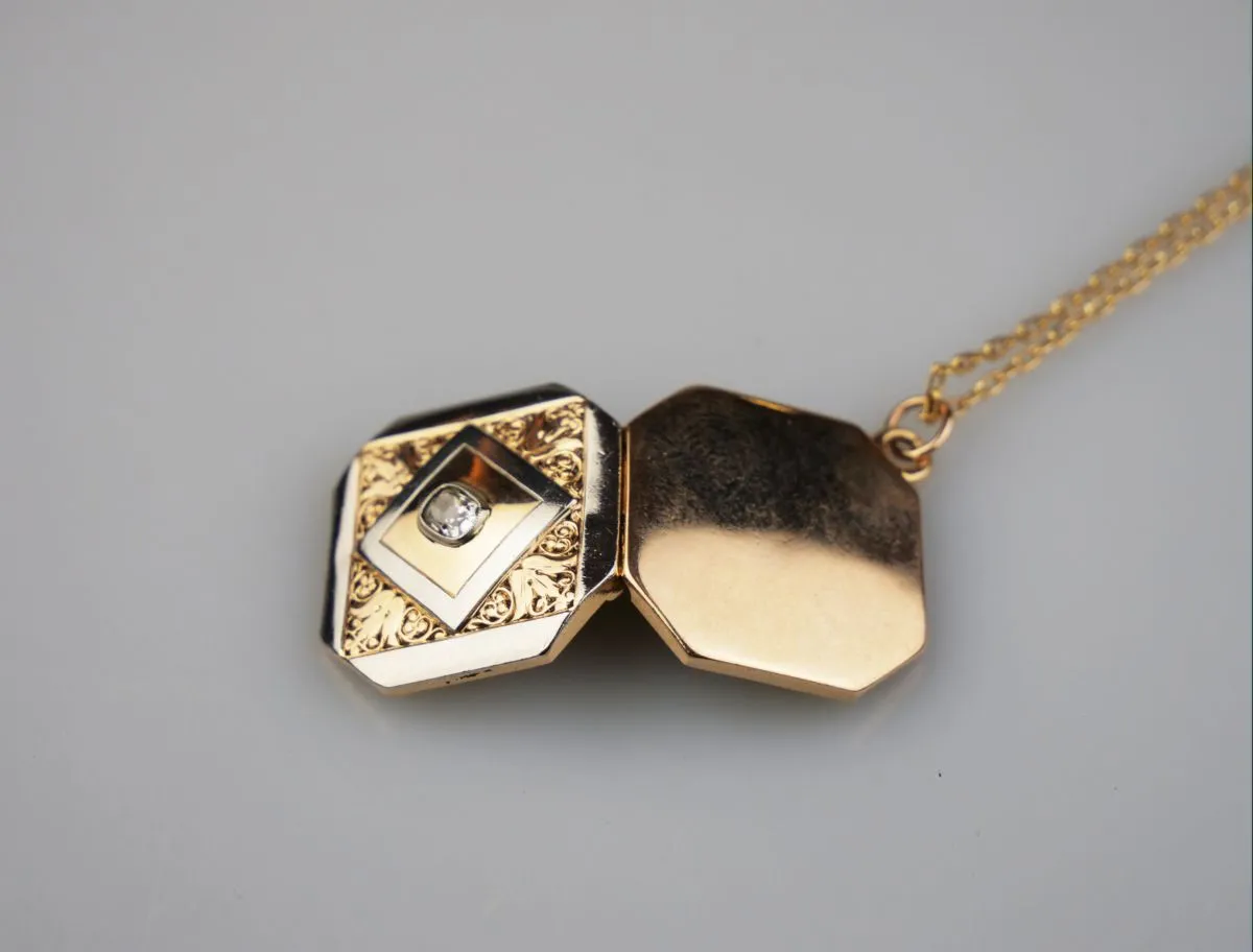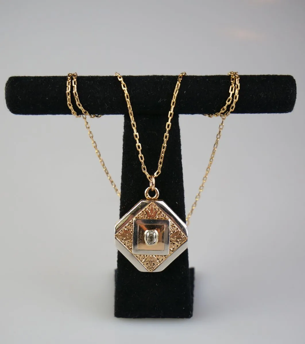otvírací přívěsek oktagonálního tvaru ze zlata a platiny, centrální diamant starého oválného briliantového brusu o hmotnosti cca 0,2 ct, v rozích jemně prolamovaný stylizovaný florální dekor, Au+Pt btto 8,75 g/580+950/1000, střední Evropa, kolem r. 1920, pozdější zlatý řetízek Au 3,87 g/585/000, rozměr přívěsku 2,4 x 2,4 cm, délka řetízku 46 cm; atest Puncovního úřadu