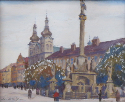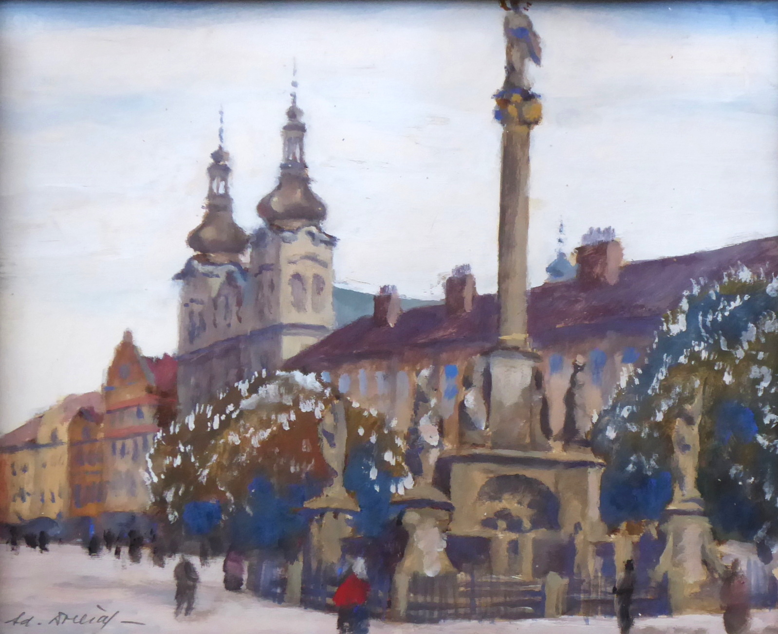Olej na kartonu 19,5 x 23 cm. Signováno vlevo dole. Autor: Adolf Doležal (1898-1978) český malíř starobylých zákoutí města Hradec Králové a jeho okolí, známý též krajinomalbou oblasti Východních Čech. Pohled rušné Velké náměstí v Hradci Králové s barokním Mariánským (morovým) sloupem a kostelem Nanebevzetí Panny Marie. Široký klenutý stříbrný rám se sklem. Československo 1926 – 1930. Celkový rozměr s rámem 33 x 36,5 cm.