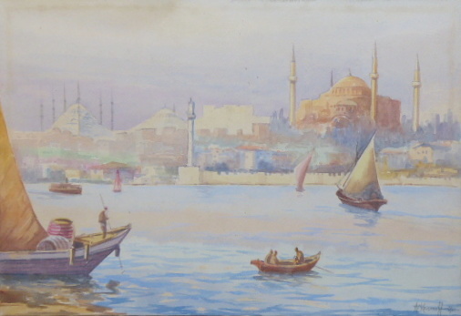 Akvarel na papíru 29 cm x 42 cm. Signováno vpravo dole. Pohled na Bospor, průliv mezi Černým a Marmanským mořem, na jehož obou březích se rozkládá Istanbul. Velké plachetnice a malé loďky v popředí a v pozadí monumentální chrám Svaté Moudrosti Hagia Sofia. V profilovaném rámu nazlátlé barevnosti, s paspartou a sklem. Turecko, Istanbul 1920 – 1940. Celkový rozměr s rámem 43 cm x 57 cm.