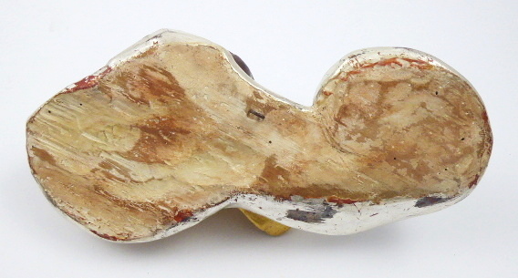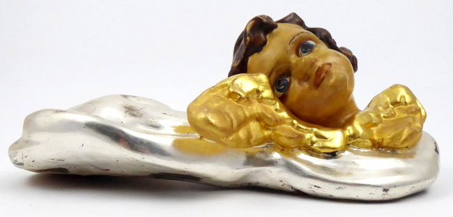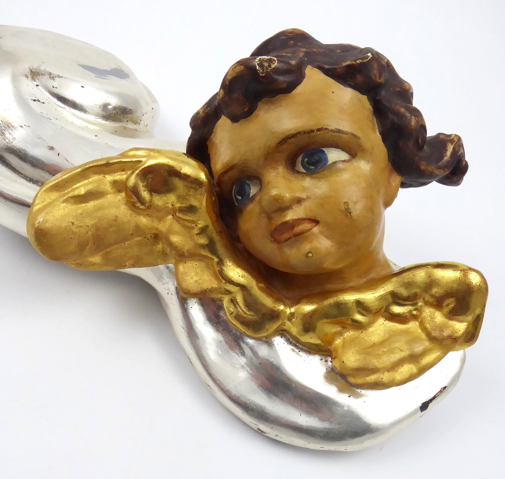 Dřevořezba, polychromie, zlacení, stříbření. Přiloženo osvědčení Národního památkového ústavu České republiky. Dřevořezba hlavy anděla s kadeřavými hnědými vlasy na stříbrném oblaku. Andílek má hlavu skloněnou na levou stranu s obličejem s výraznýma modrýma očima a karmínovými rty. Krček anděla přechází ve stylizovaná zlacená rozevřená křídla. Zadní strana dřevořezby plochá. Střední Evropa, 19. století. Výška 34 cm.
