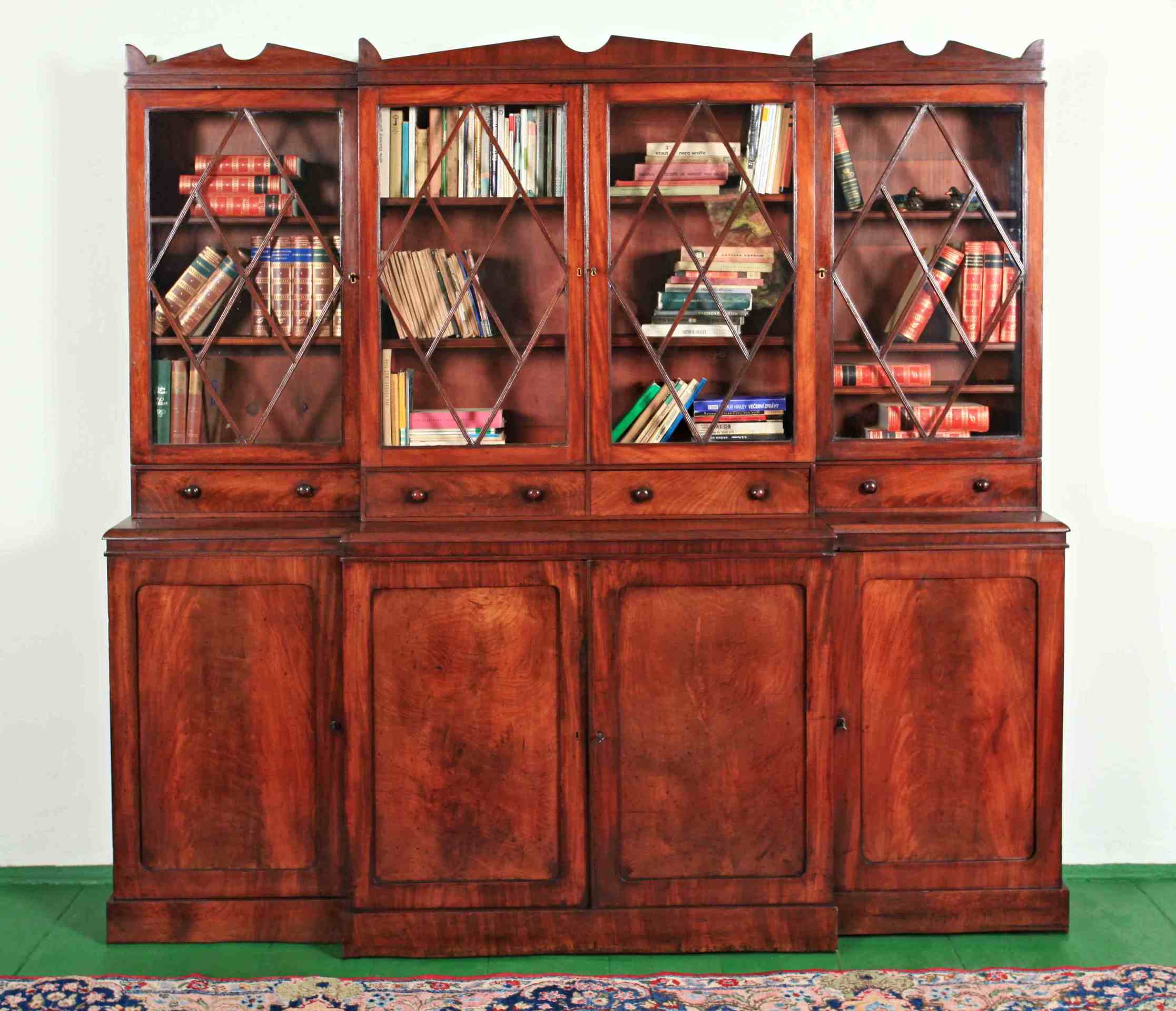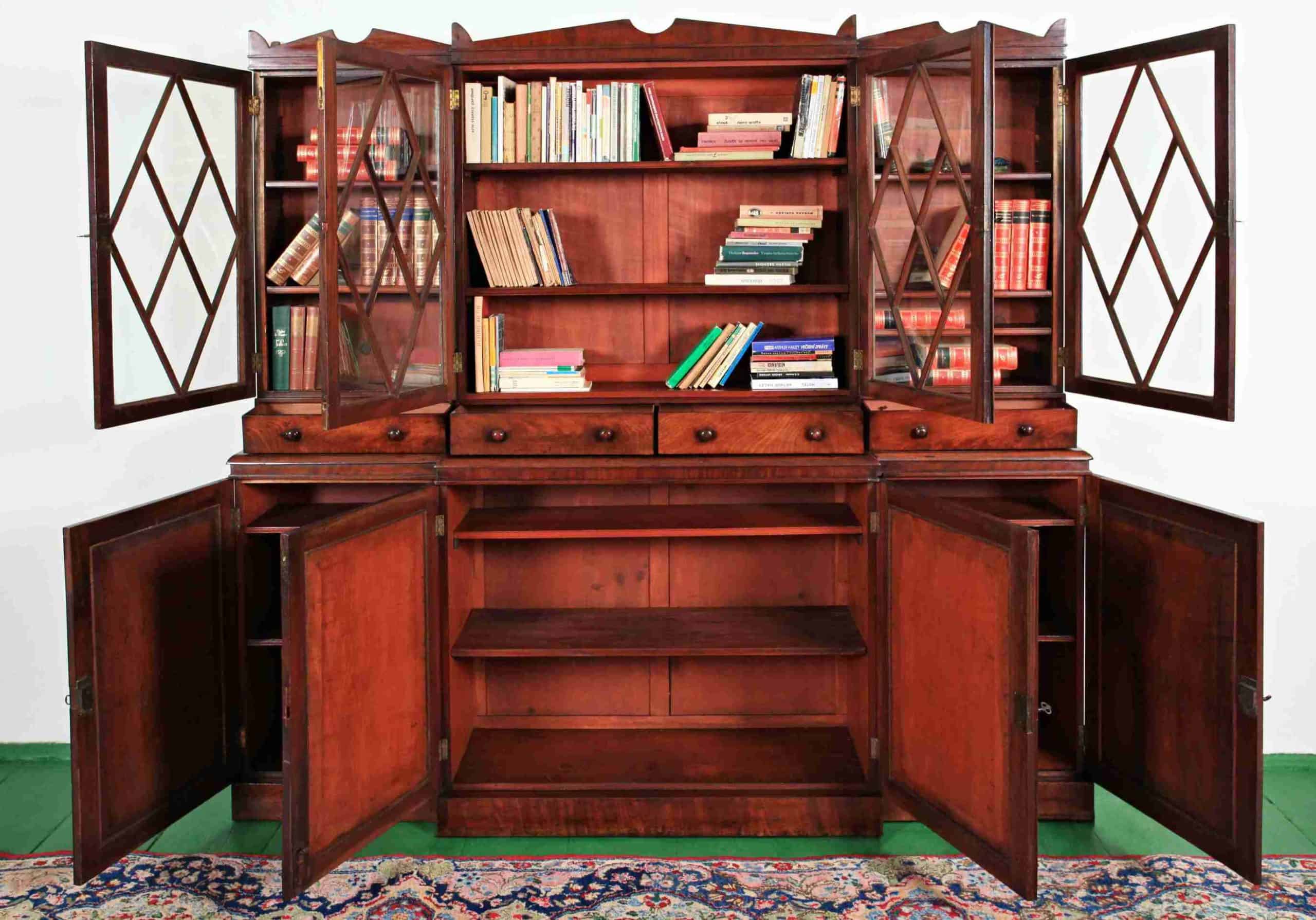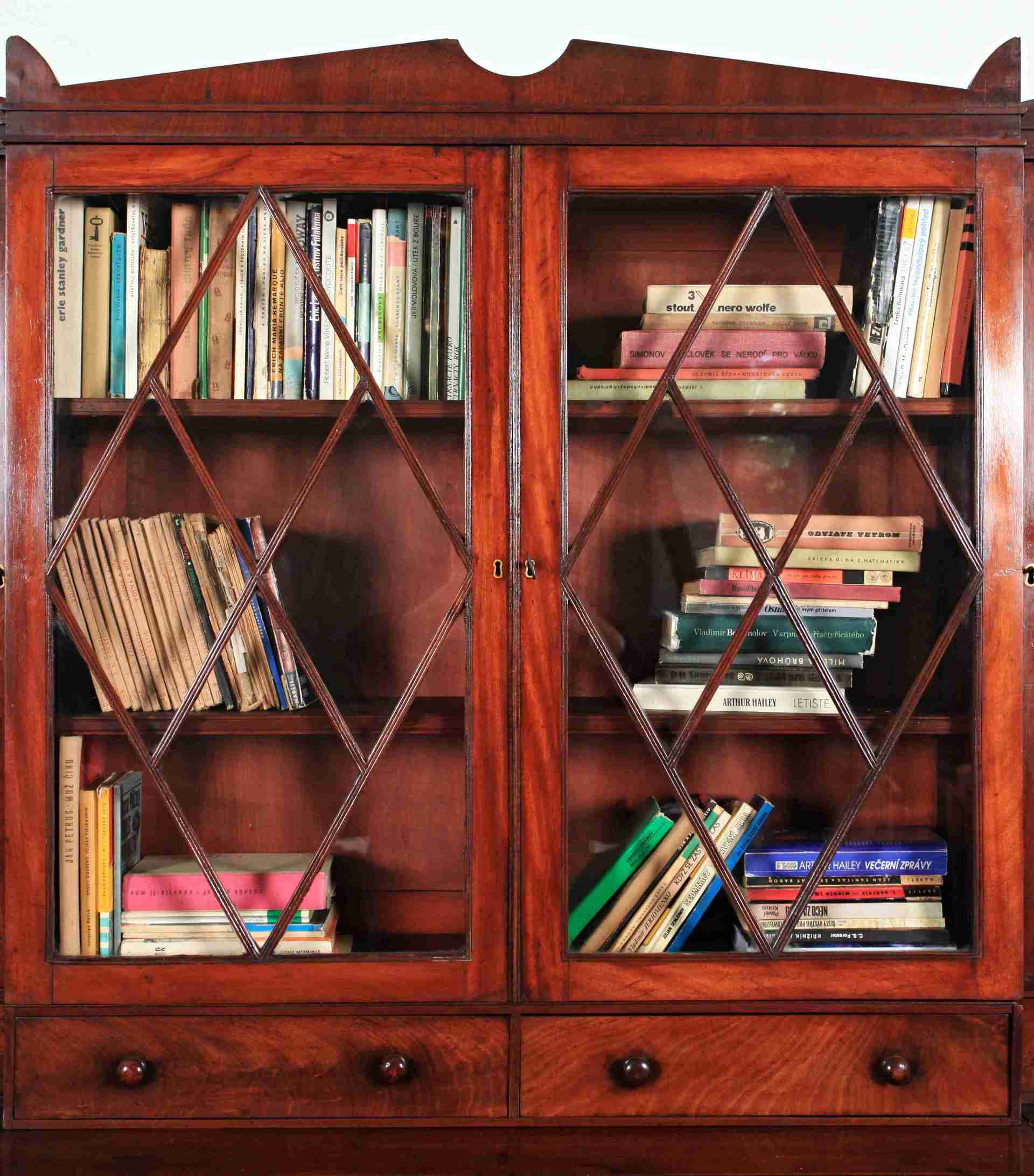 Čtyřdvéřové provedení s prosklenou vrchní částí a uzavřenou spodní částí. Knihovna z poloviny 19. století. Mahagonový masiv. Výškově nastavitelné police. Zámečky jsou funkční a klíčky součástí. Knihovna je v původním, velmi dobrém stavu, bez červotoce. Knihovnu je možné pro převoz rozebrat na nekolik malých dílu (složení trvá cca 15 minut).