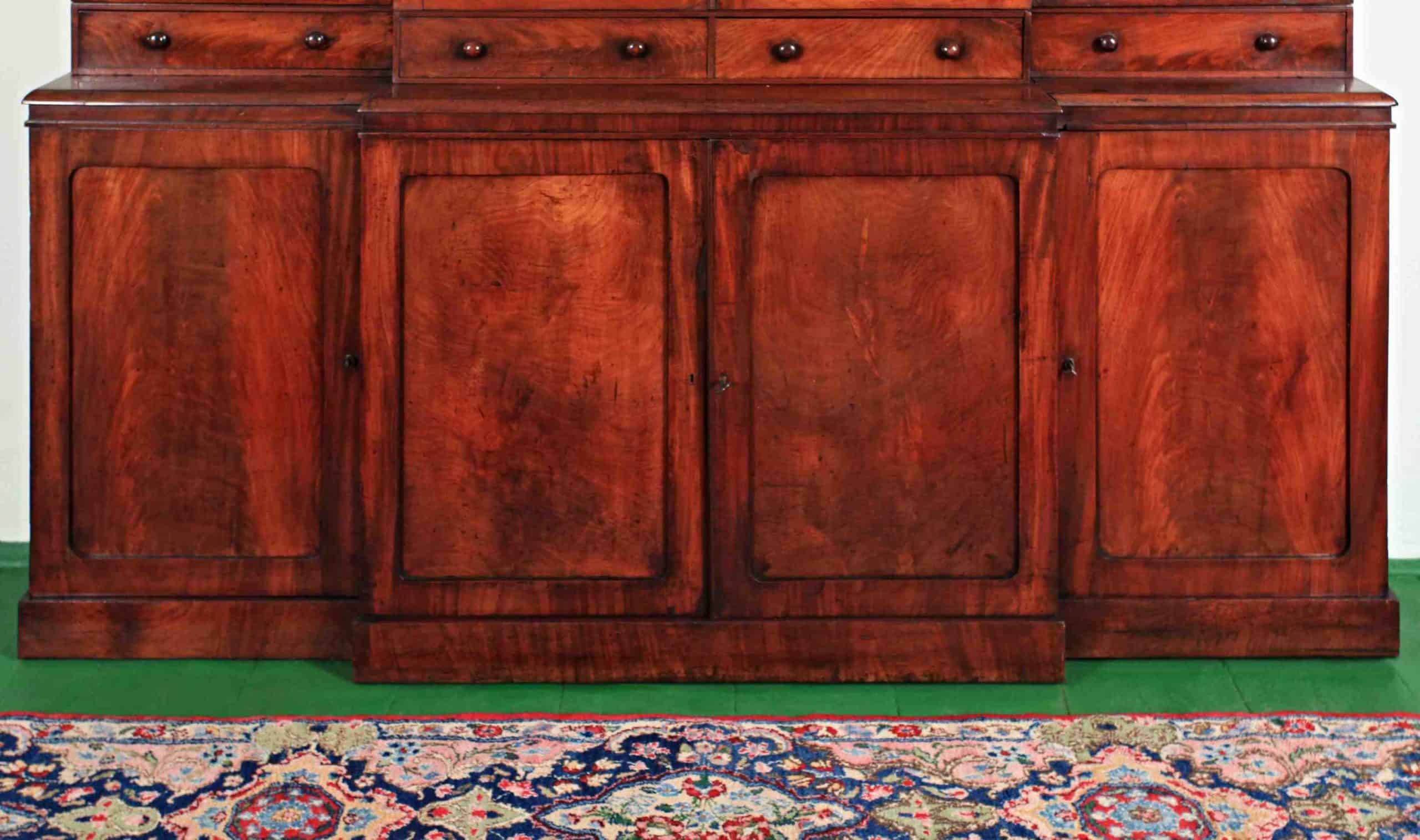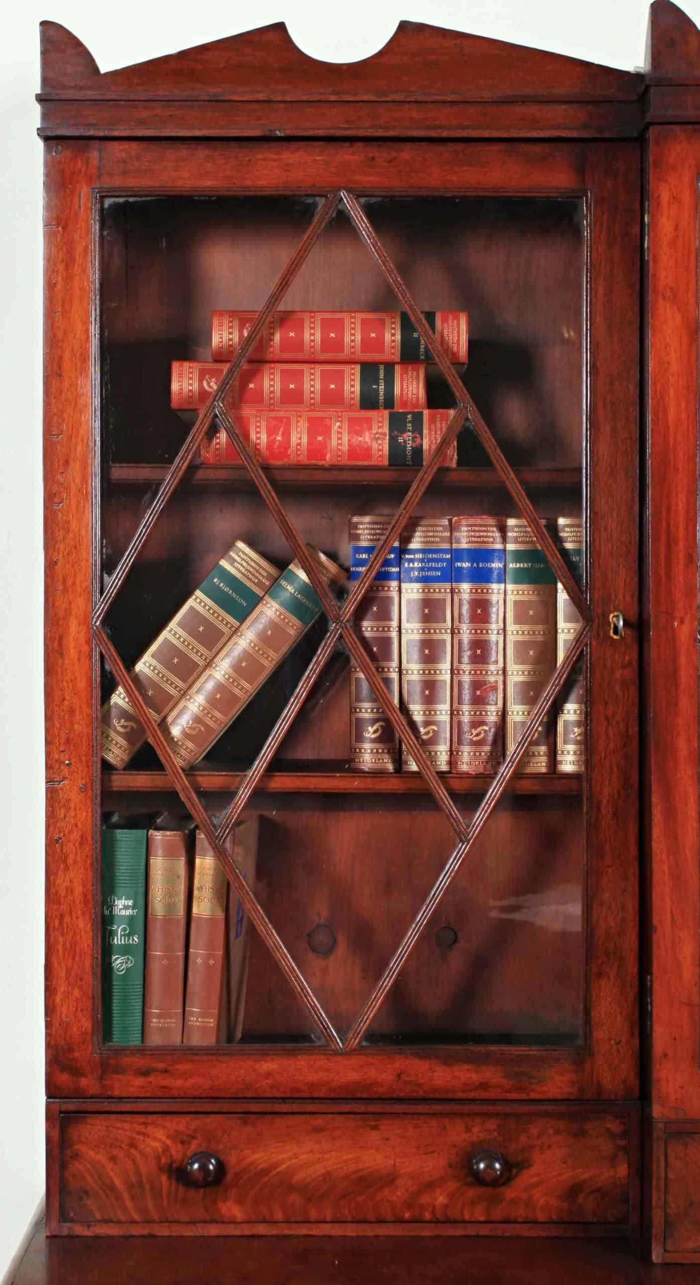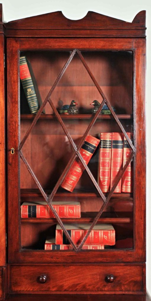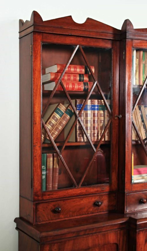 Čtyřdvéřové provedení s prosklenou vrchní částí a uzavřenou spodní částí. Knihovna z poloviny 19. století. Mahagonový masiv. Výškově nastavitelné police. Zámečky jsou funkční a klíčky součástí. Knihovna je v původním, velmi dobrém stavu, bez červotoce. Knihovnu je možné pro převoz rozebrat na nekolik malých dílu (složení trvá cca 15 minut).