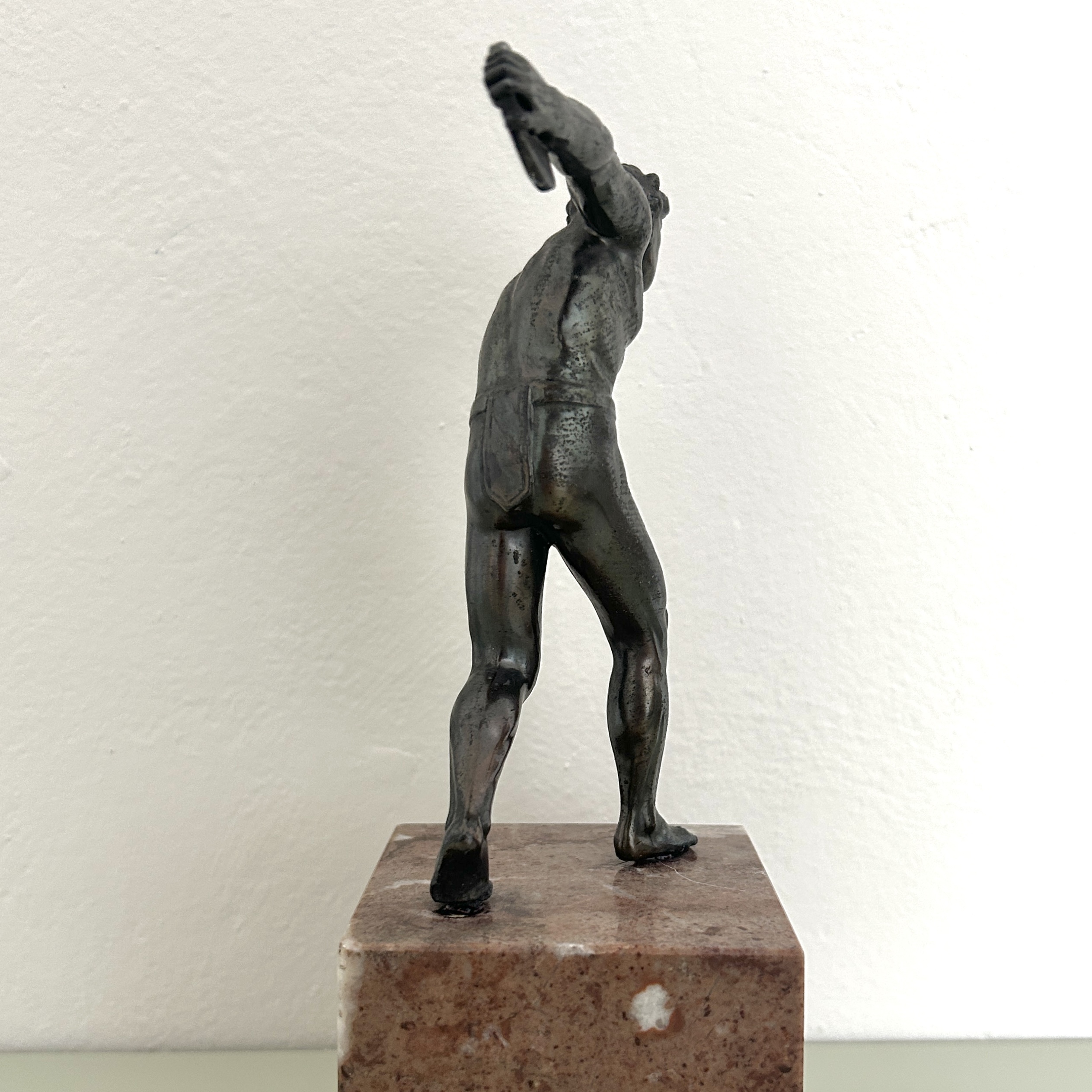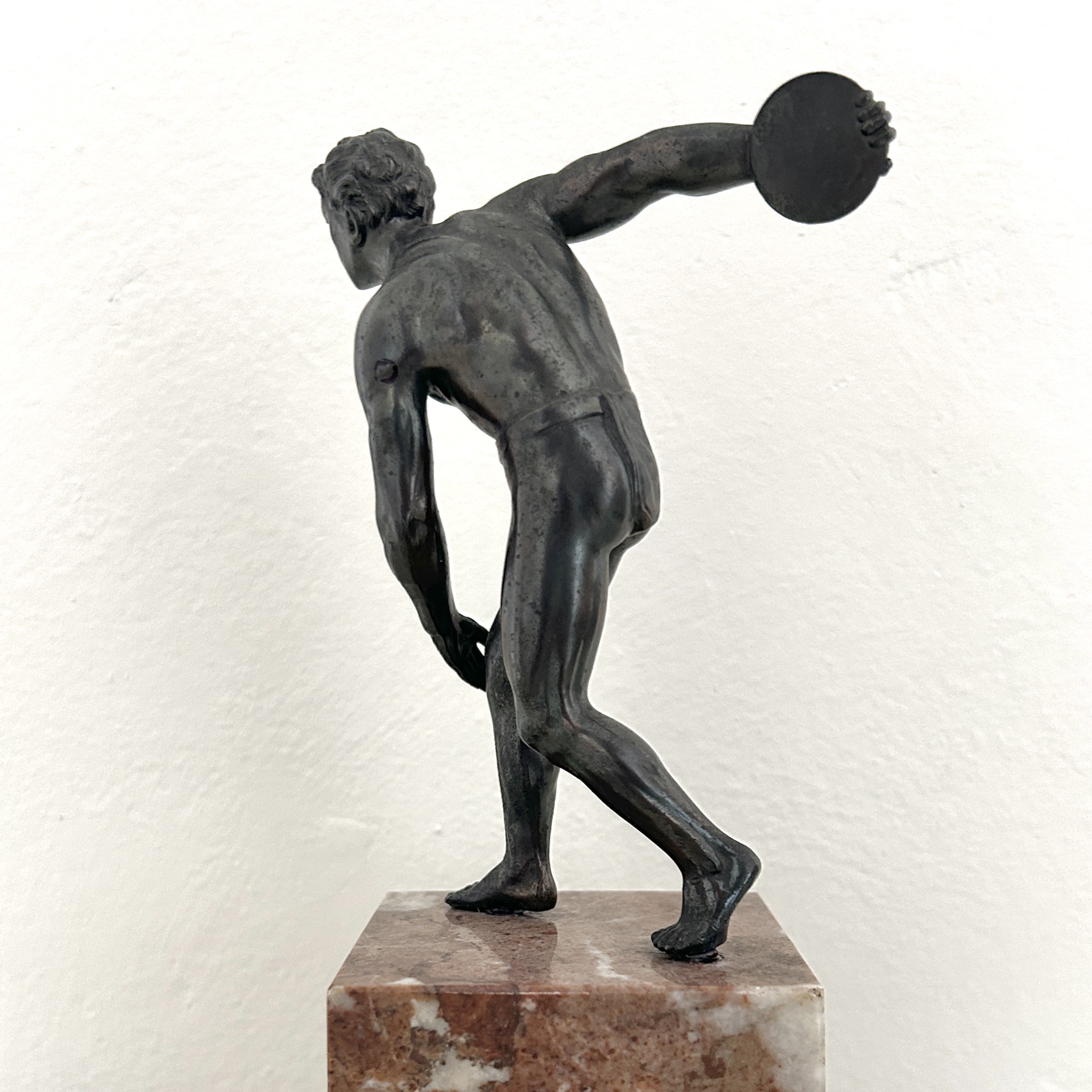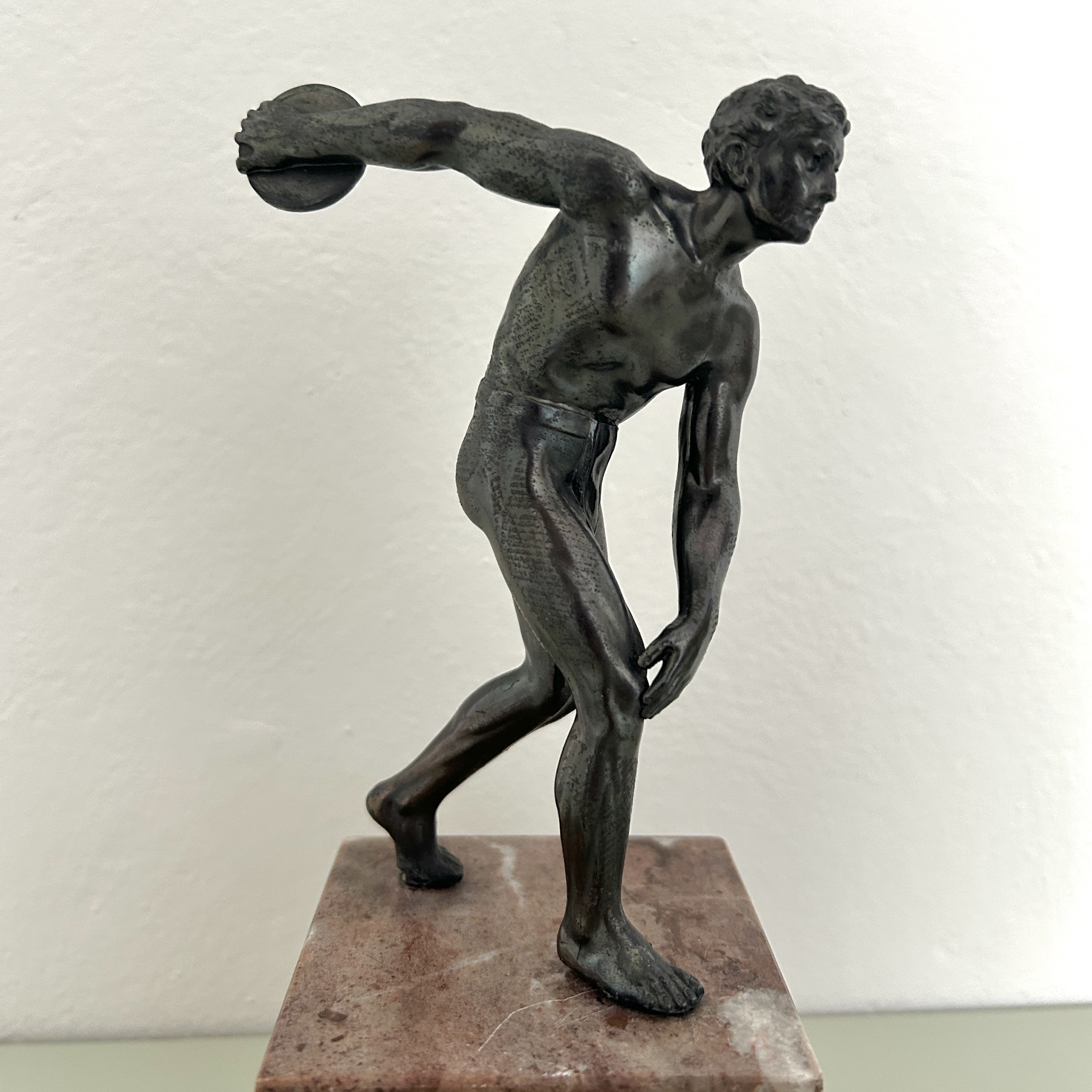 Stolní menší socha postavy Diskobola, realisticky modelovaná figura v antikizujícím pojetí a bederní rouškou, inspirováno kanonickou plastikou stejného názvu od Myróna (okolo 450 př. n. l.). Připevněno na hranolovém podstavci. Kvalitní ukázka užité plastiky, patrně tuzemská výroba z 20. až 30. let 20. století.