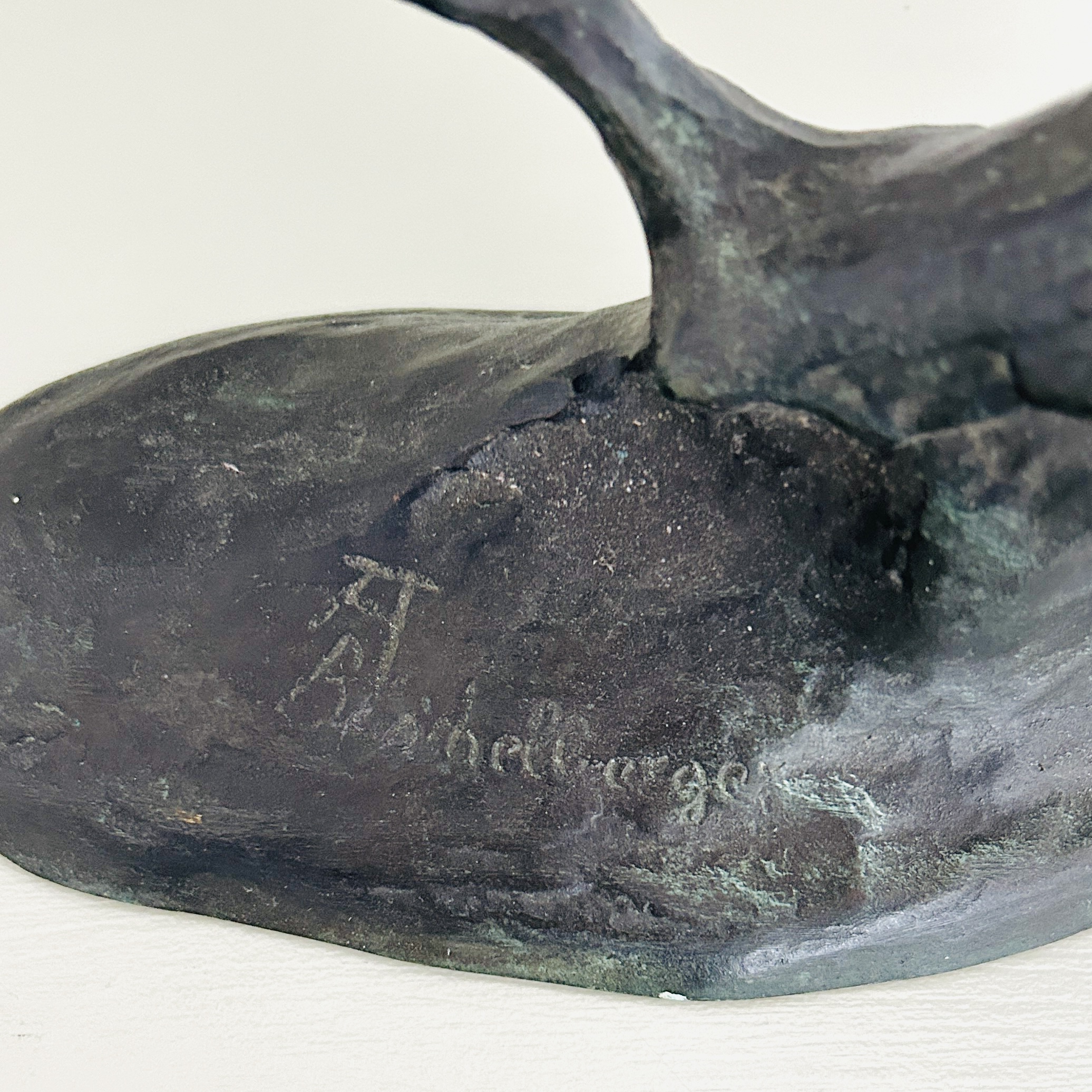 Bronz tmavě patinovaný. Signováno frontálně na podstavci „A. Büschelberger“. Výška 26,5 cm, délka 34 cm, šířka 10 cm. V zachovalém stavu.