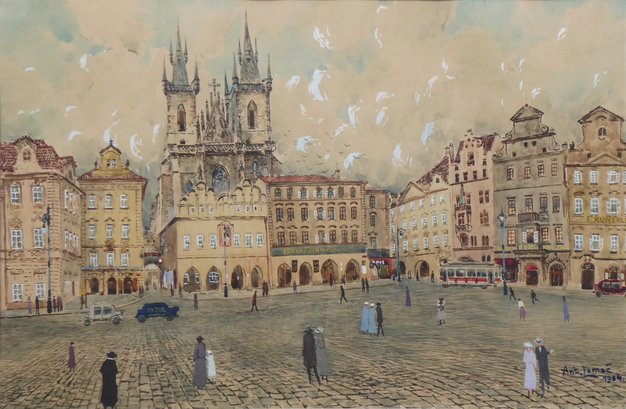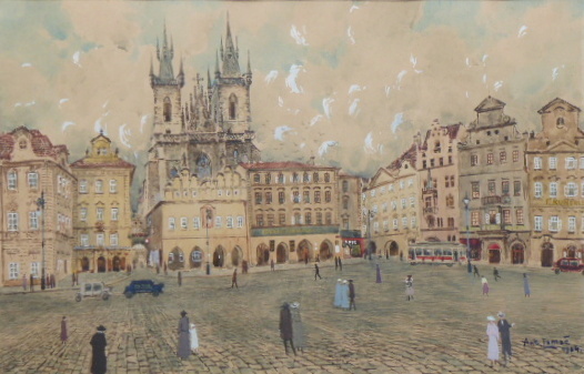 Akvarel a kvaš na papíru 27 cm x 43 cm. Signováno vpravo dole s datací 1994. Autor: Antonín Lamač (?-?). Nostalgická vzpomínka na staré dobré časy první republiky zachycující Staroměstské náměstí v Praze. V jednoduchém užším rámu s paspartou a sklem. Česká republika, rok 1994. Celkový rozměr 40,5 cm x 55,5 cm.