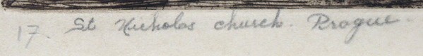 Lept na papíru 317 mm x 245 mm. Signováno vpravo dole tužkou a vpravo dole monogramem v tisku. Vlevo dole tužkou St. Nicholas Church, Prague. Výhled na věže Chrámu svatého Mikuláše z Nových zámeckých schodů. Originální zlatý rám s paspartou a sklem. Československo, Praha, 30. až 40. léta minulého století. Celkový rozměr s rámem 524 mm x 405 mm.