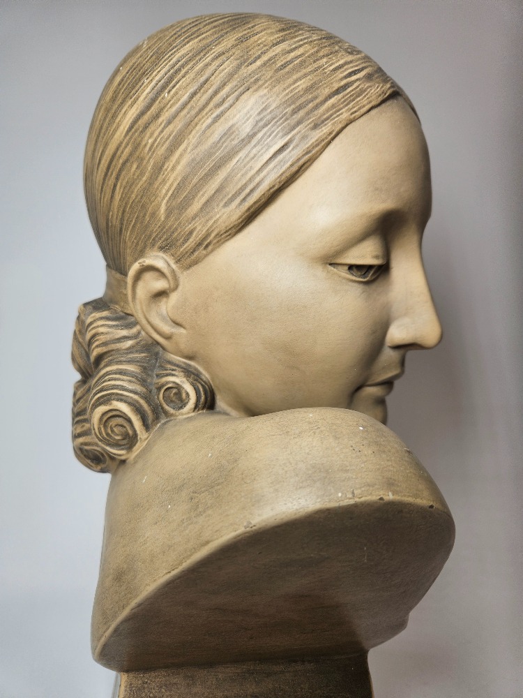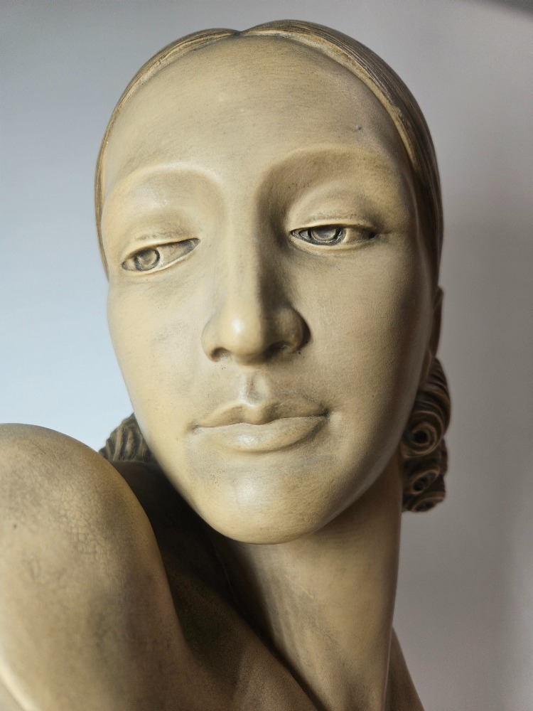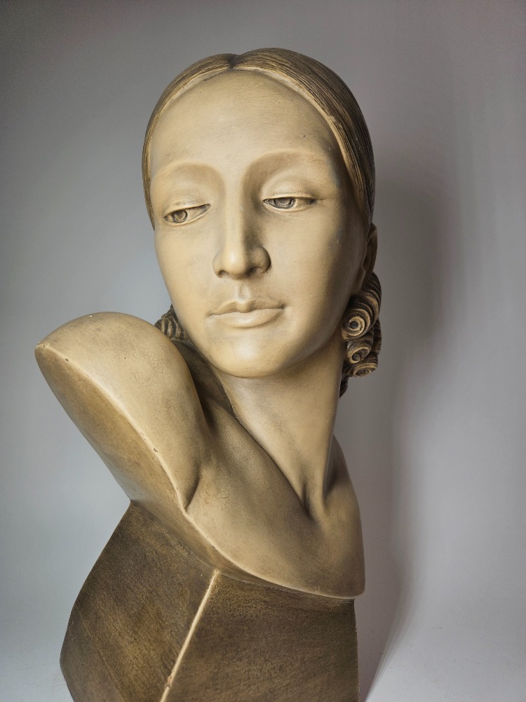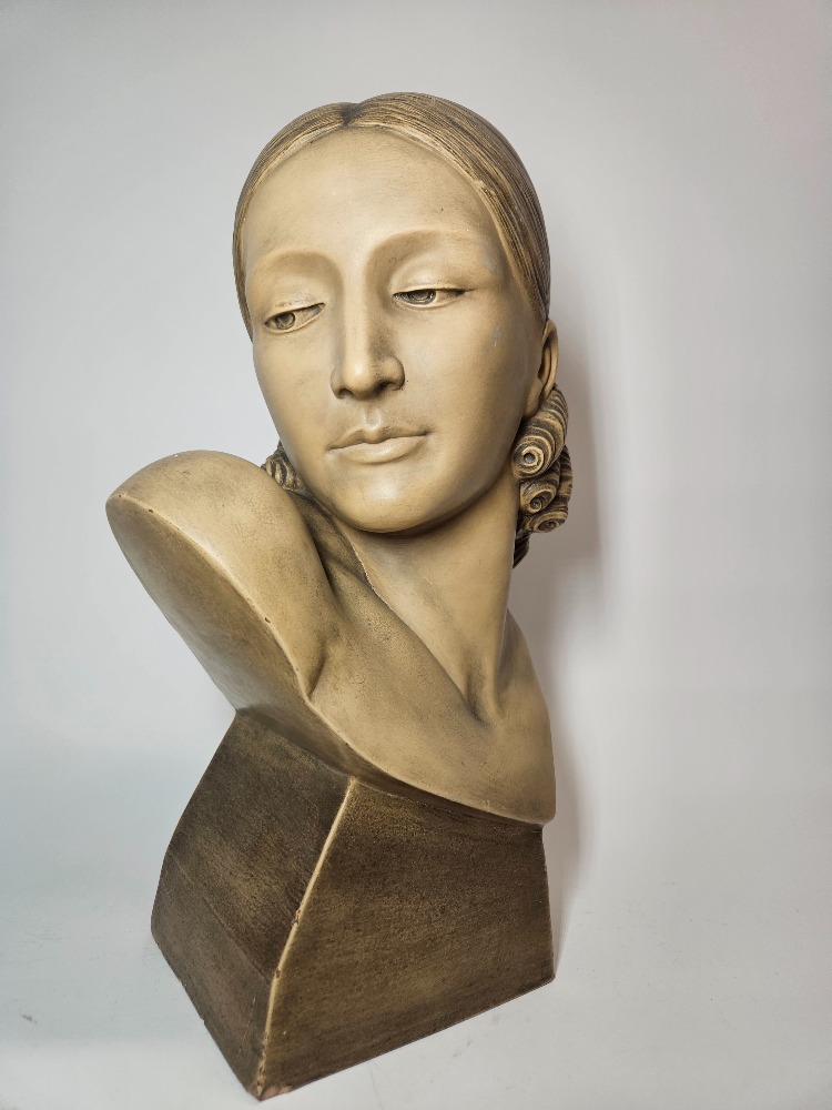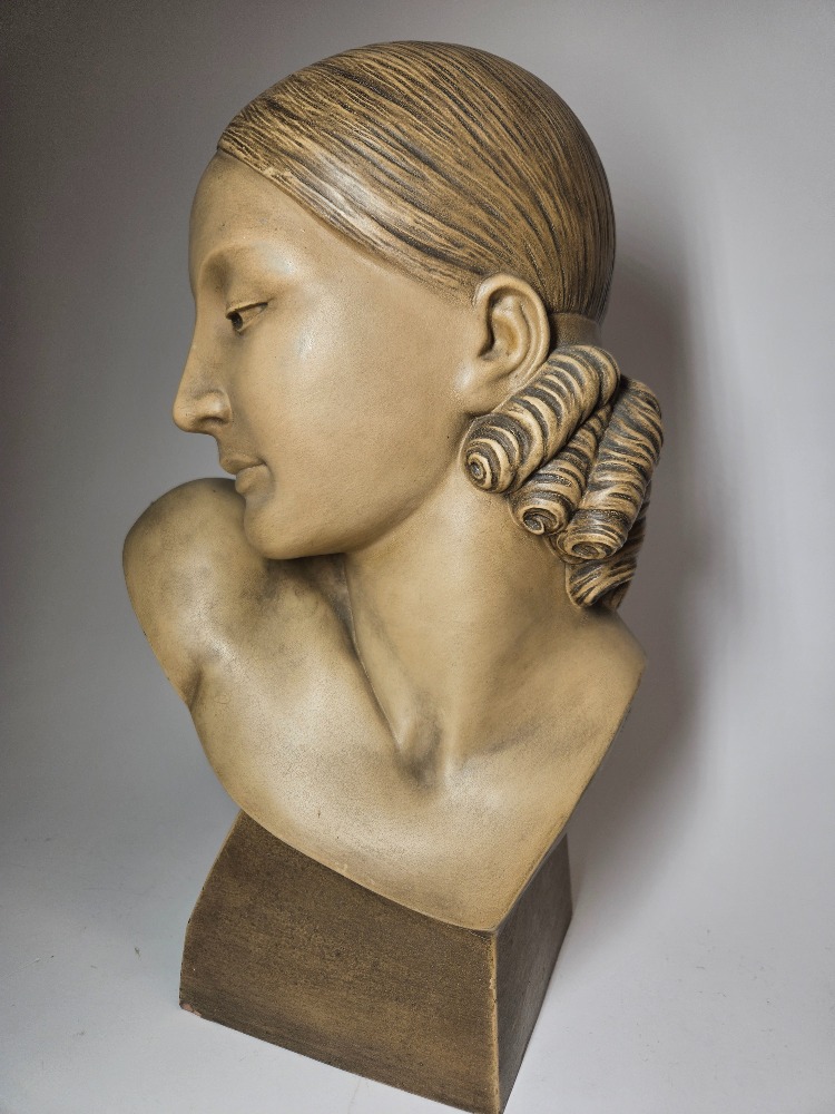 Tato stylová art deco busta ženy z 30. let 20. století, vyrobená z terakoty, je dokonalým doplňkem interiéru. Stav je dobrý, pouze s malým odštěpkem na podstavci, viz fotografie. Sochař Bohumil Rezl se narodil 17. září 1899 v Čechách. V roce 1926 se přestěhoval do Paříže, kde začal vytvářet modely pro výrobu ve Villenauxe. V roce 1933 se přestěhoval do Villenauxe-la-Grande, aby pracoval v továrně. V roce 1951 se vrátil do Československa; výška 42 cm, šířka 22 cm