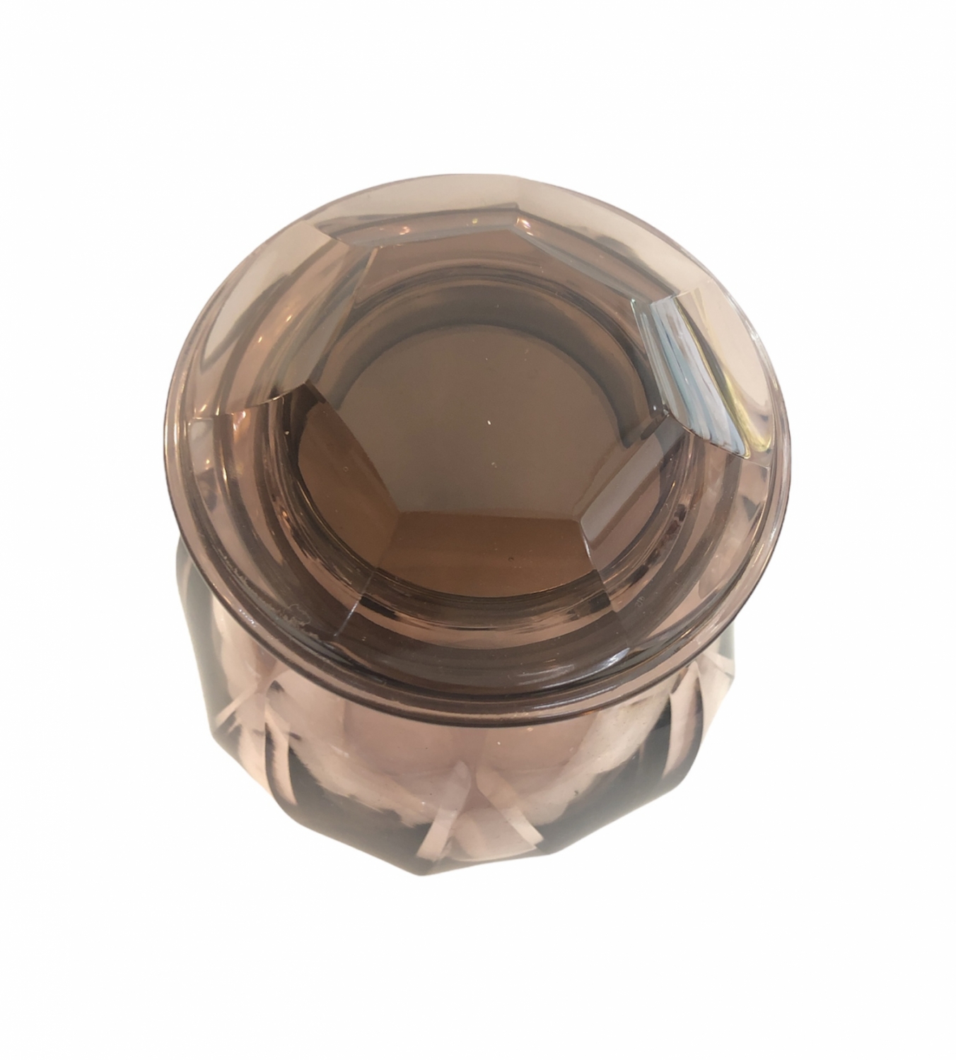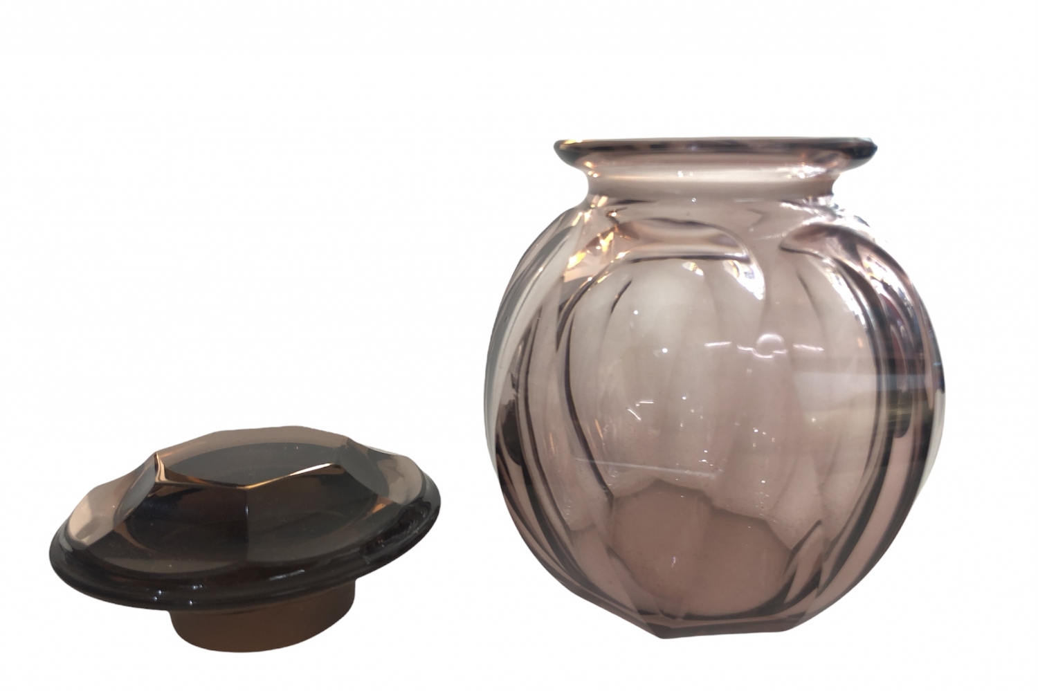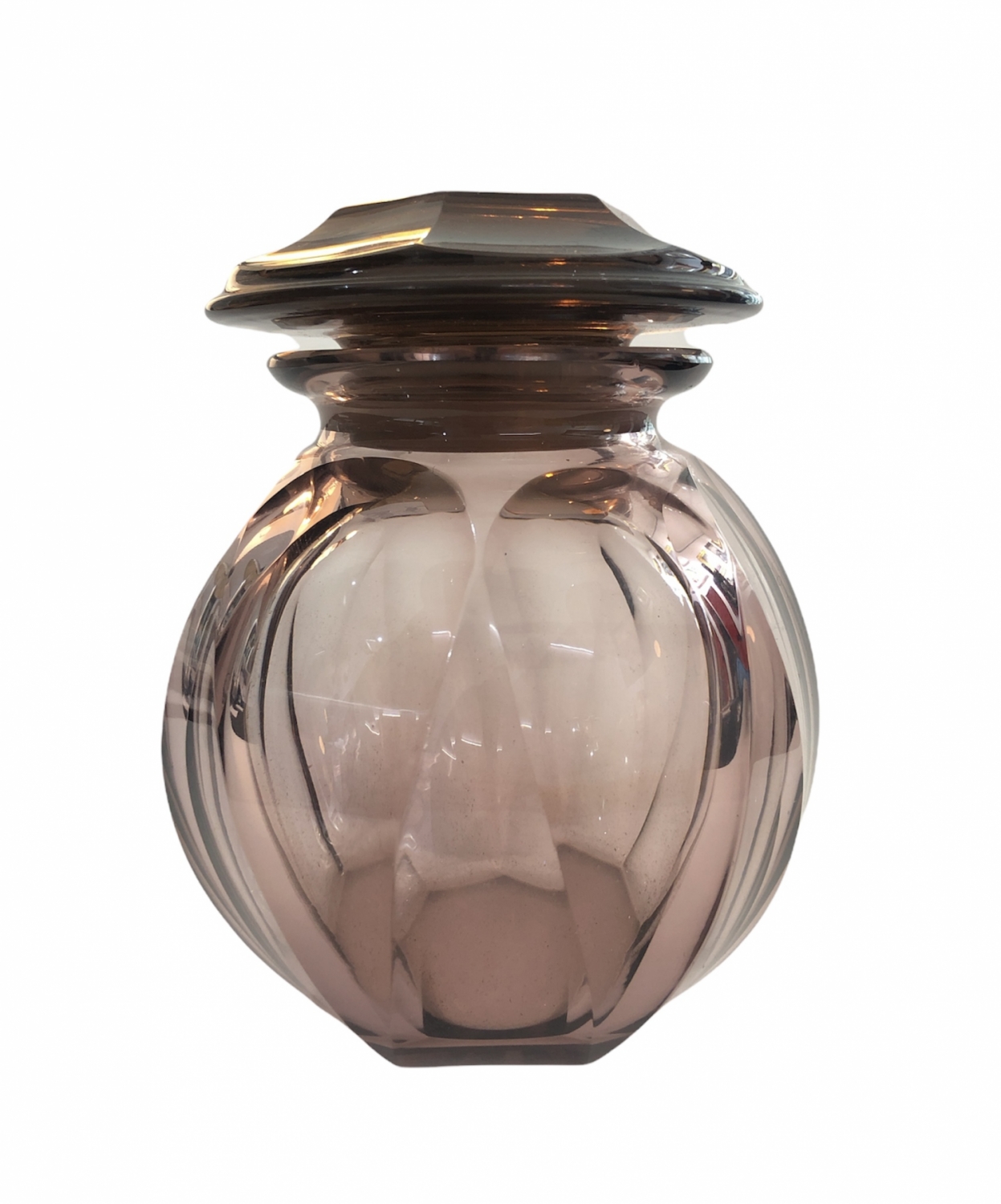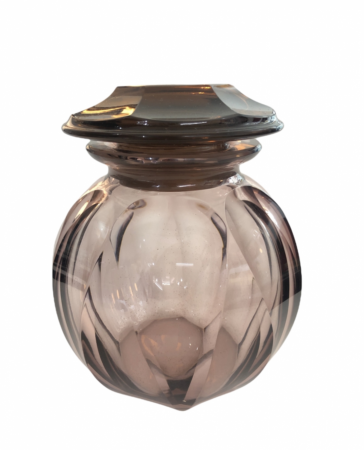 Art deco dóza z broušeného, světle fialového skla, se zátkou, Československo, 30. léta 20. století; výška se zátkou 13,5 cm, bez zátky 11,5 cm