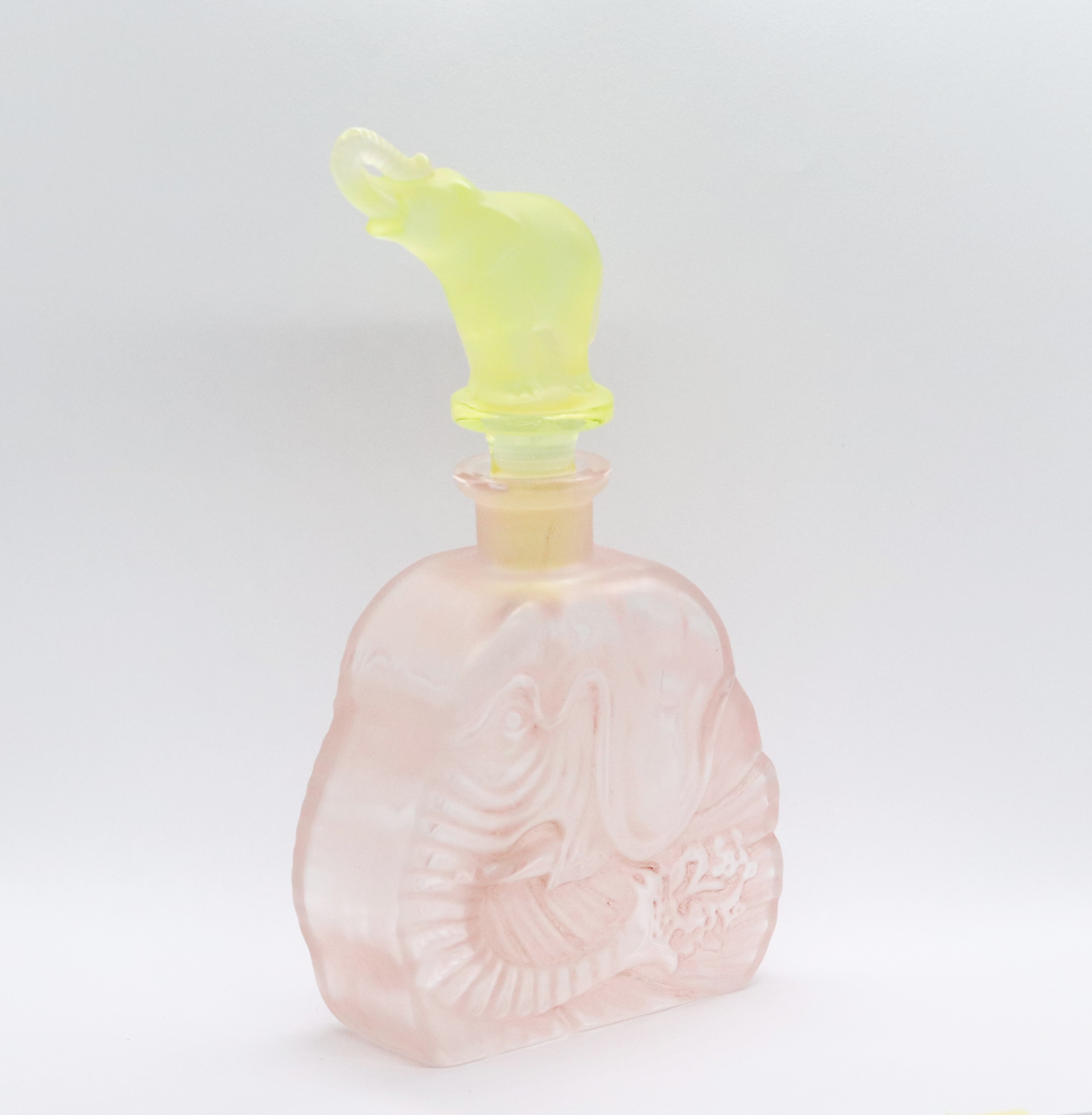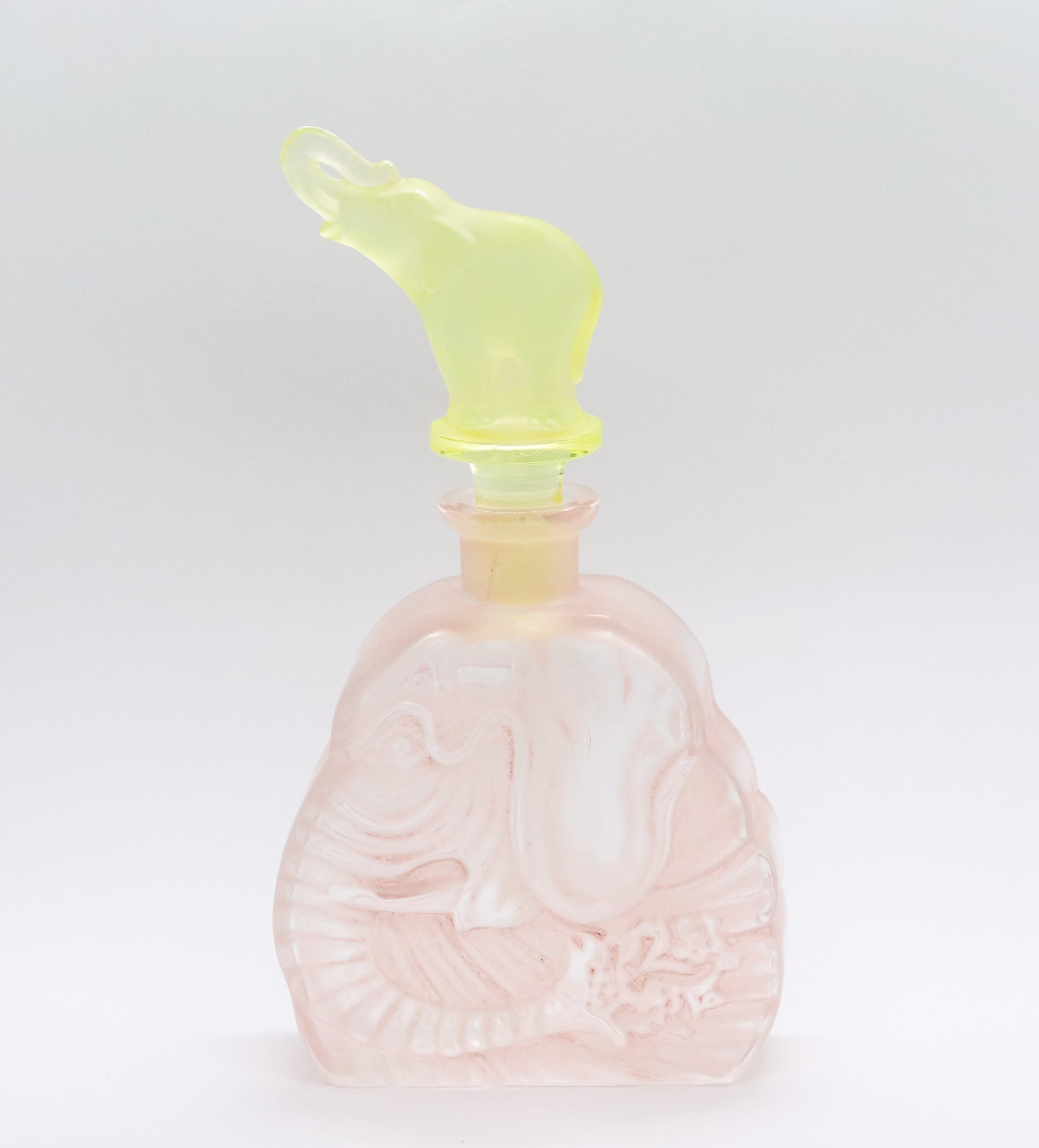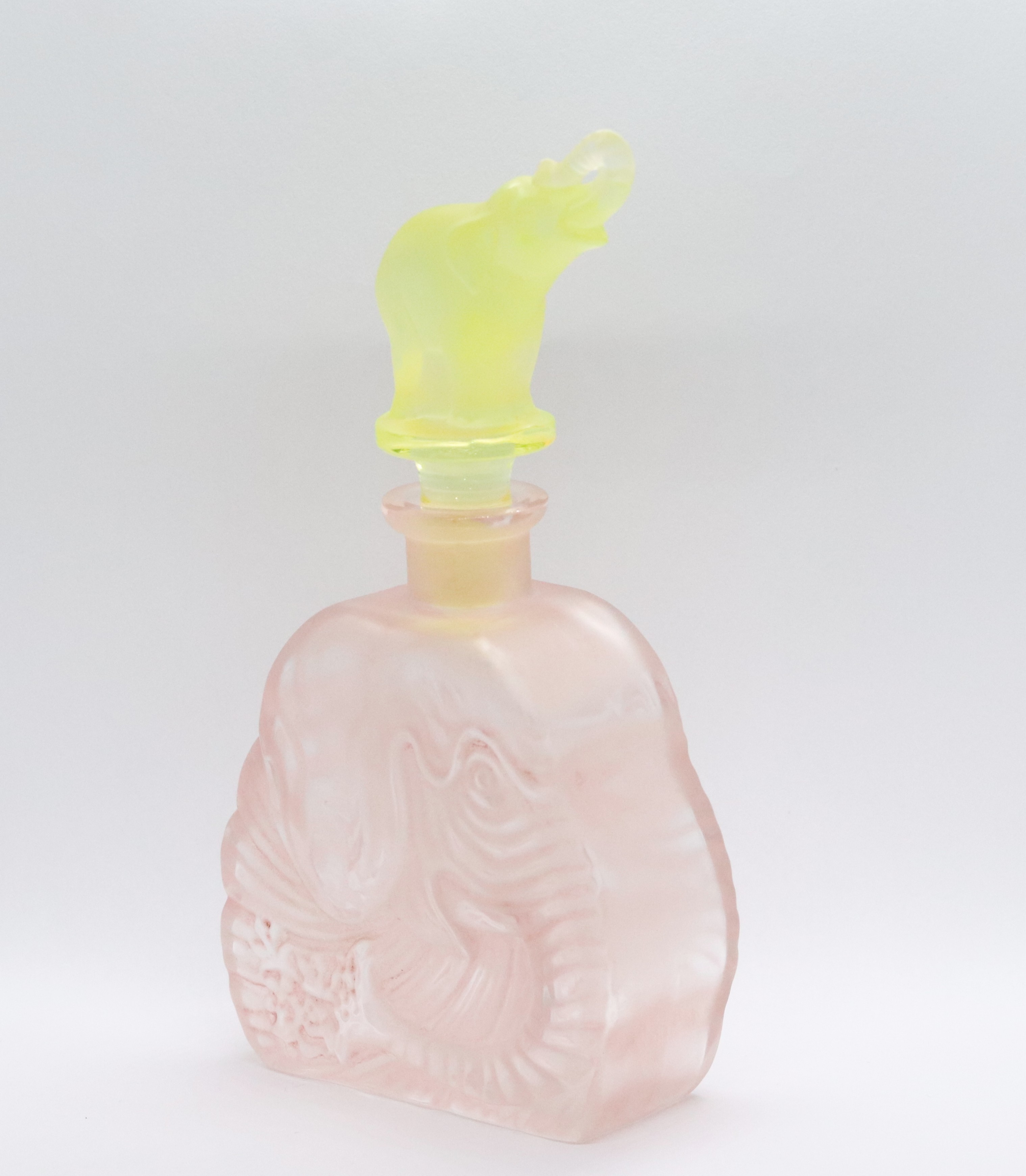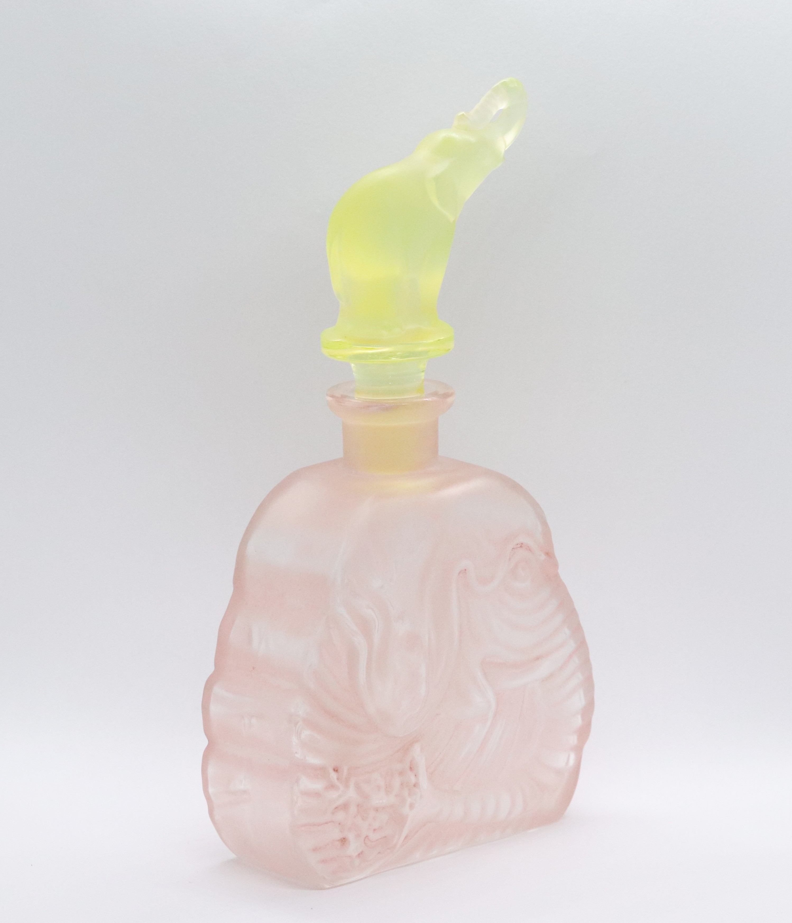 Art deco flakón na parfém ve tvaru slona, zátka s pipetou se slonem ze žlutého matného skla, podle návrhu Heinricha Hoffmanna, Československo, 30. léta 20. století; výška 15 cm, šířka 8 cm