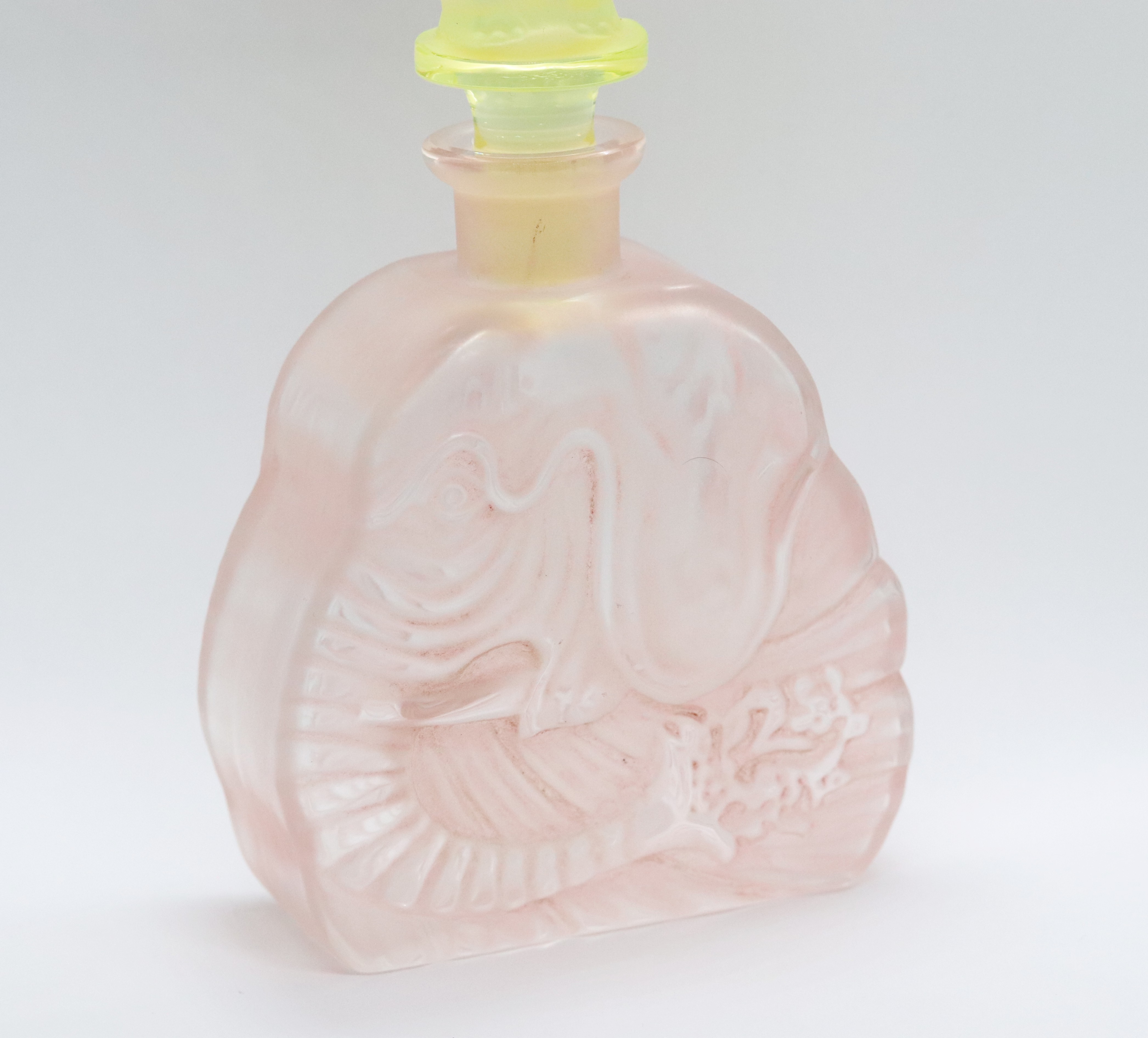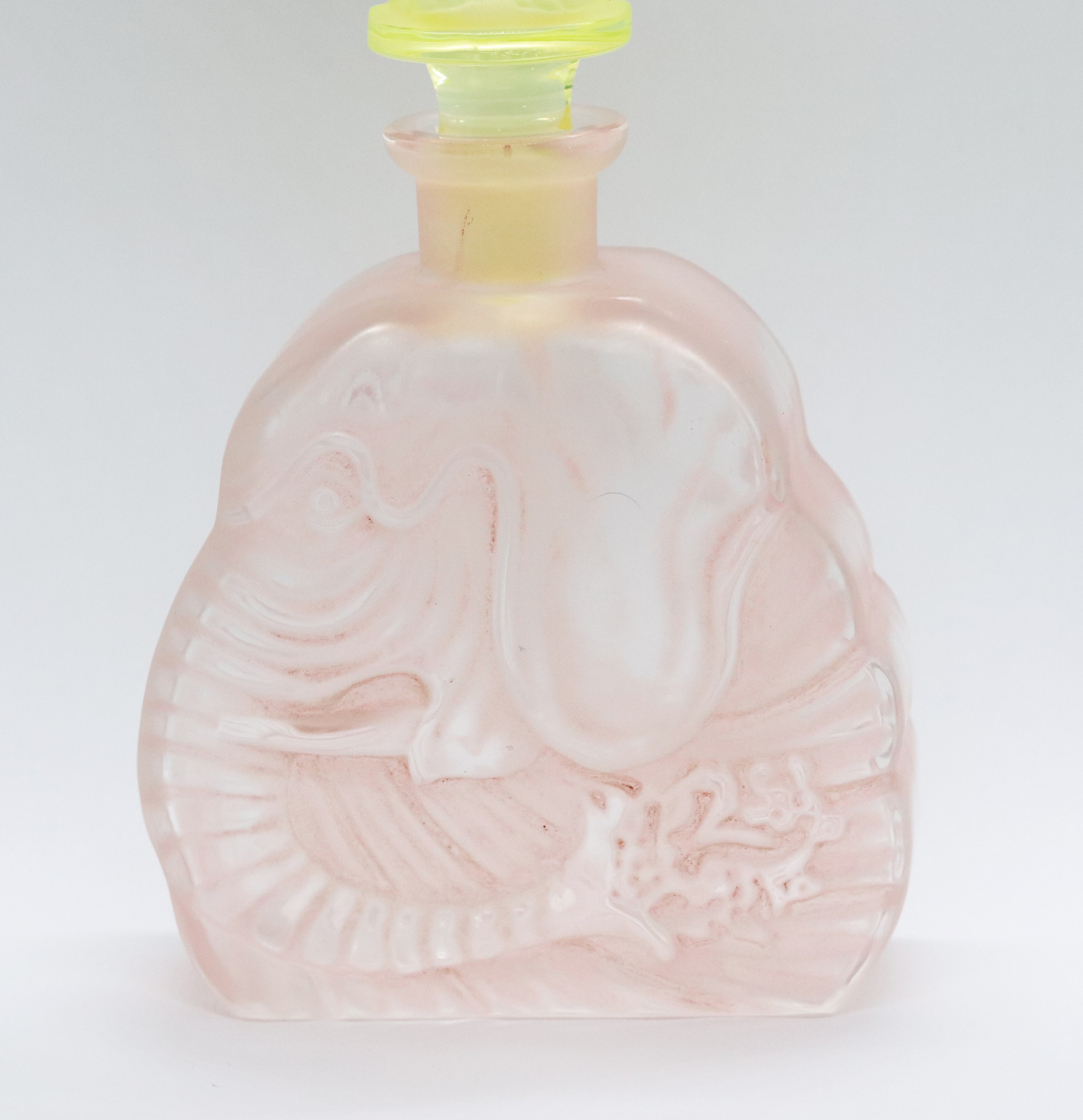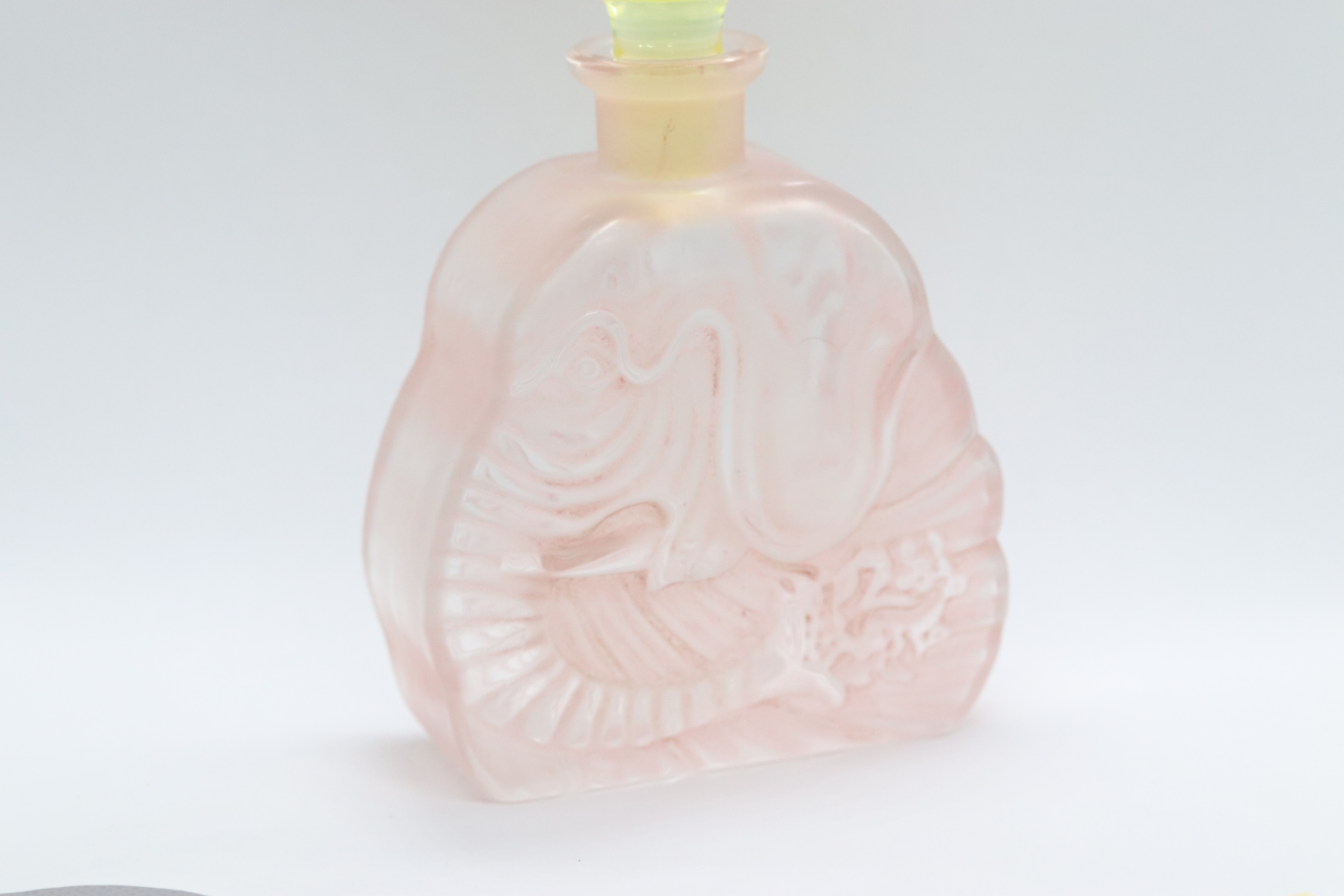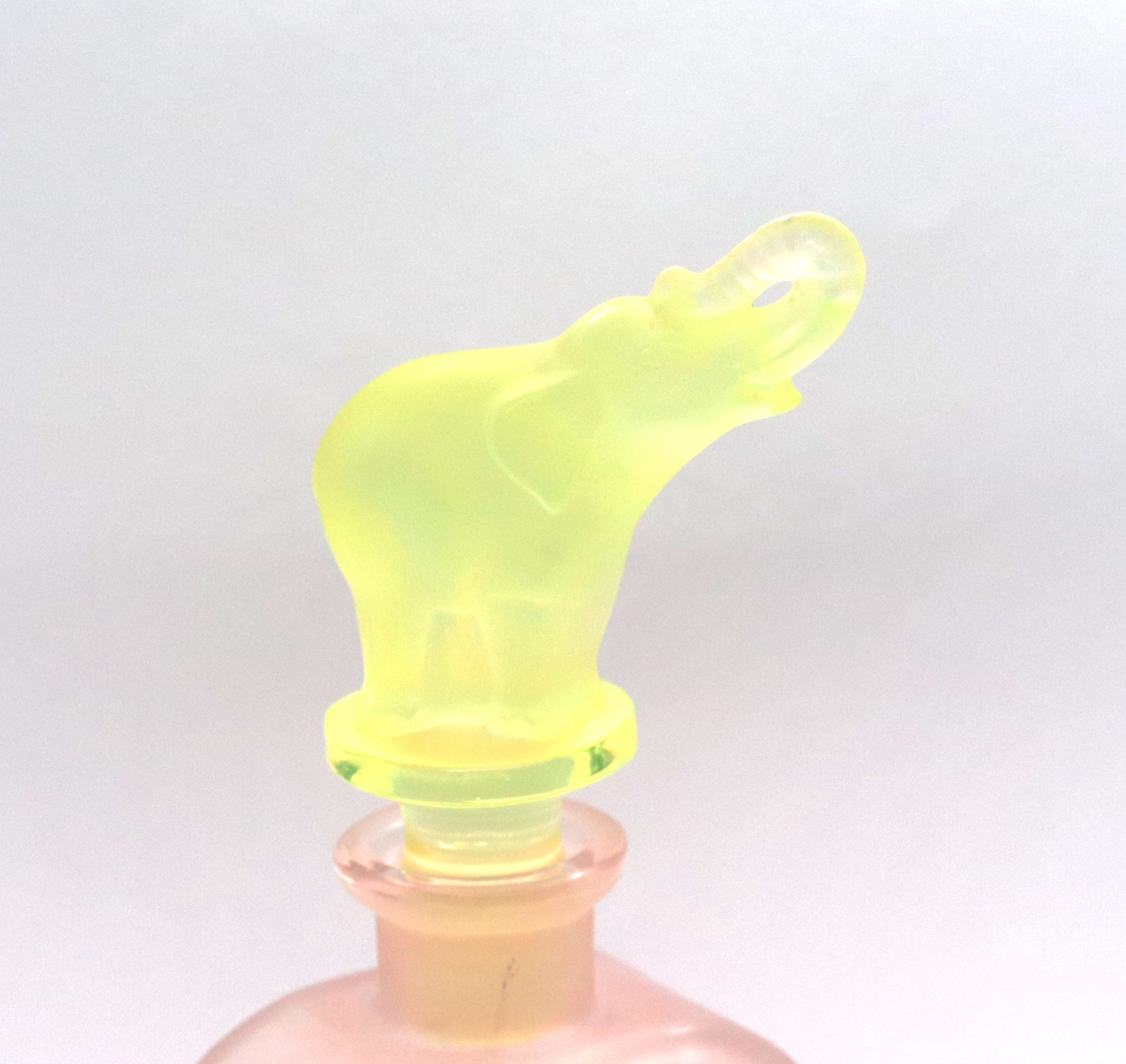 Art deco flakón na parfém ve tvaru slona, zátka s pipetou se slonem ze žlutého matného skla, podle návrhu Heinricha Hoffmanna, Československo, 30. léta 20. století; výška 15 cm, šířka 8 cm