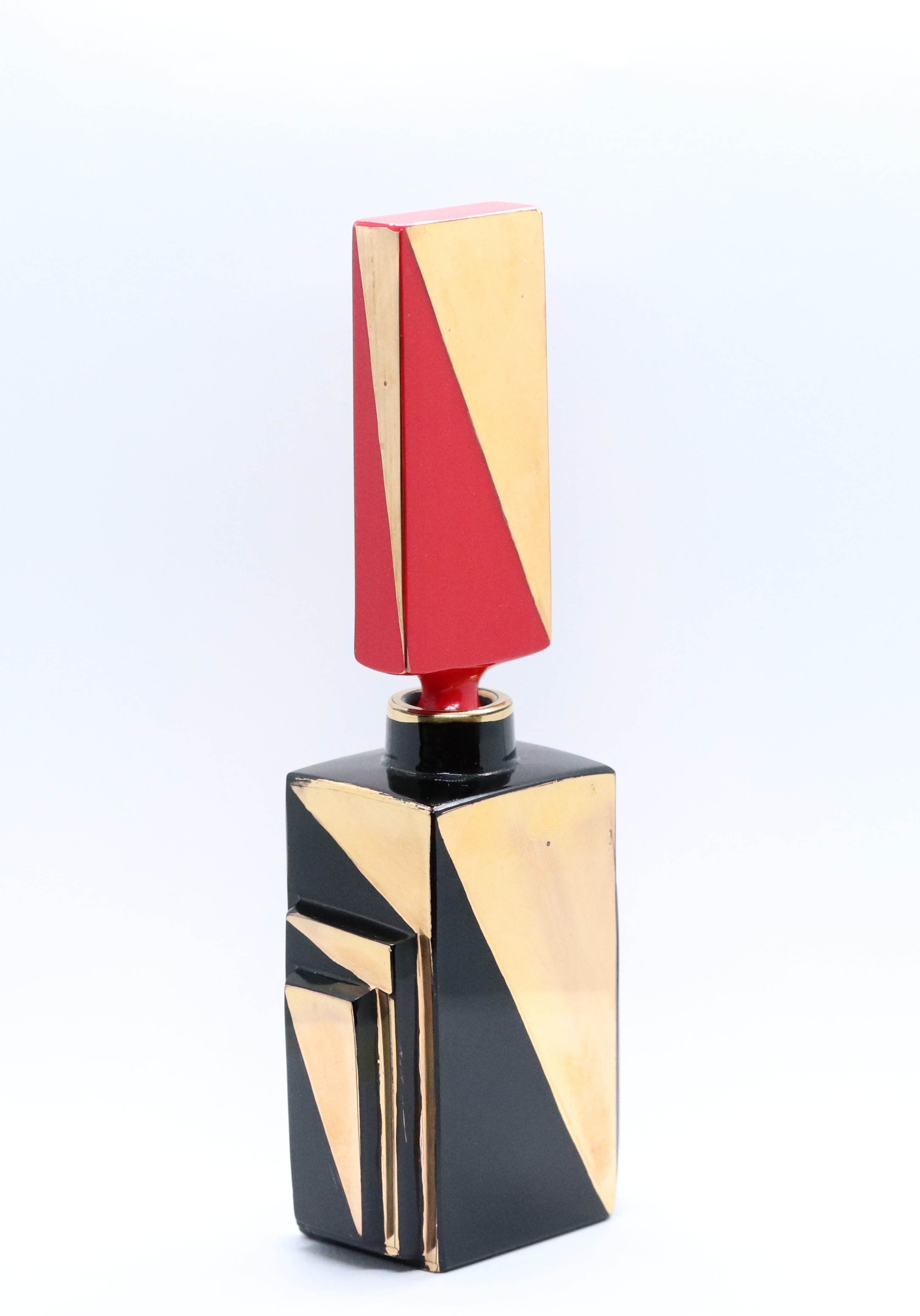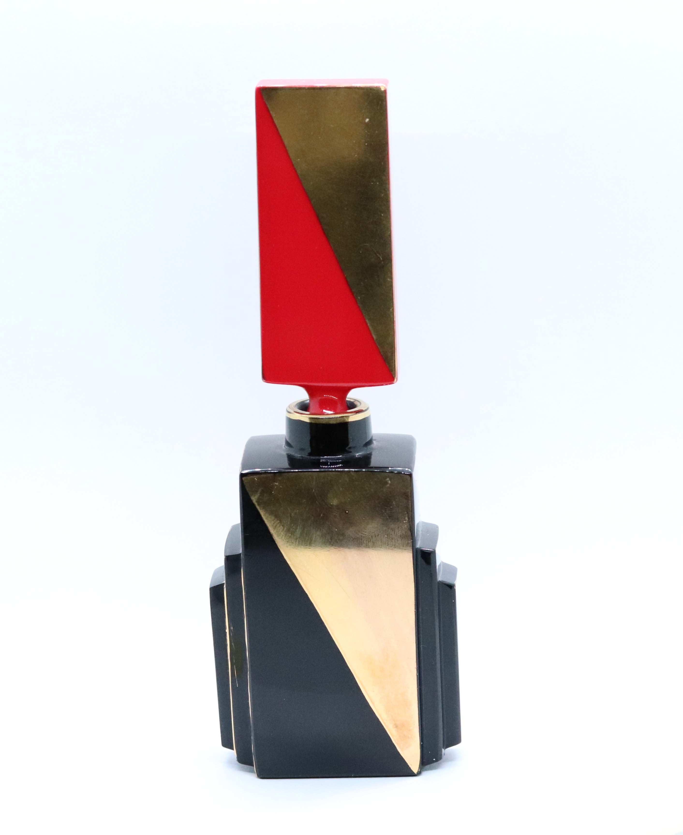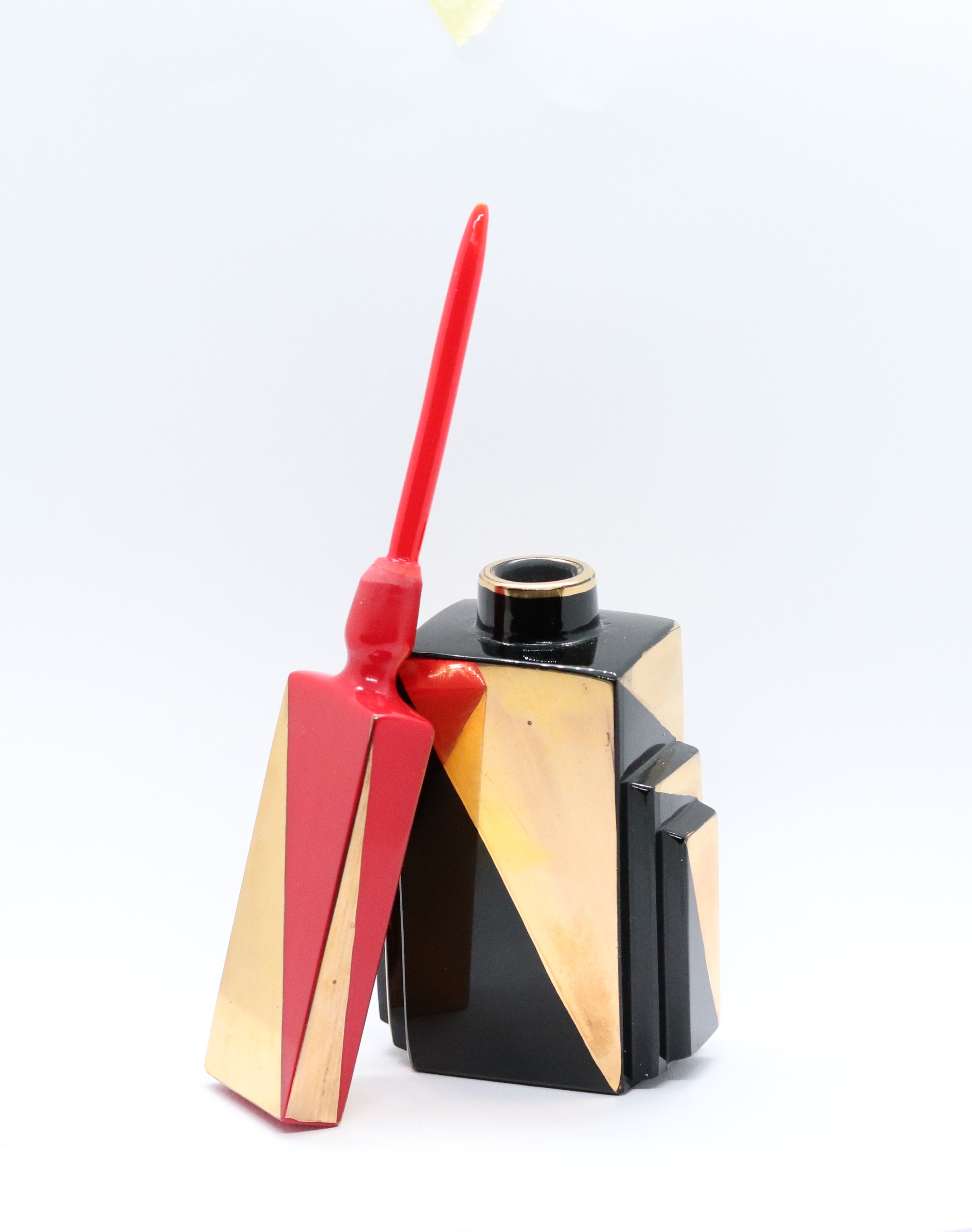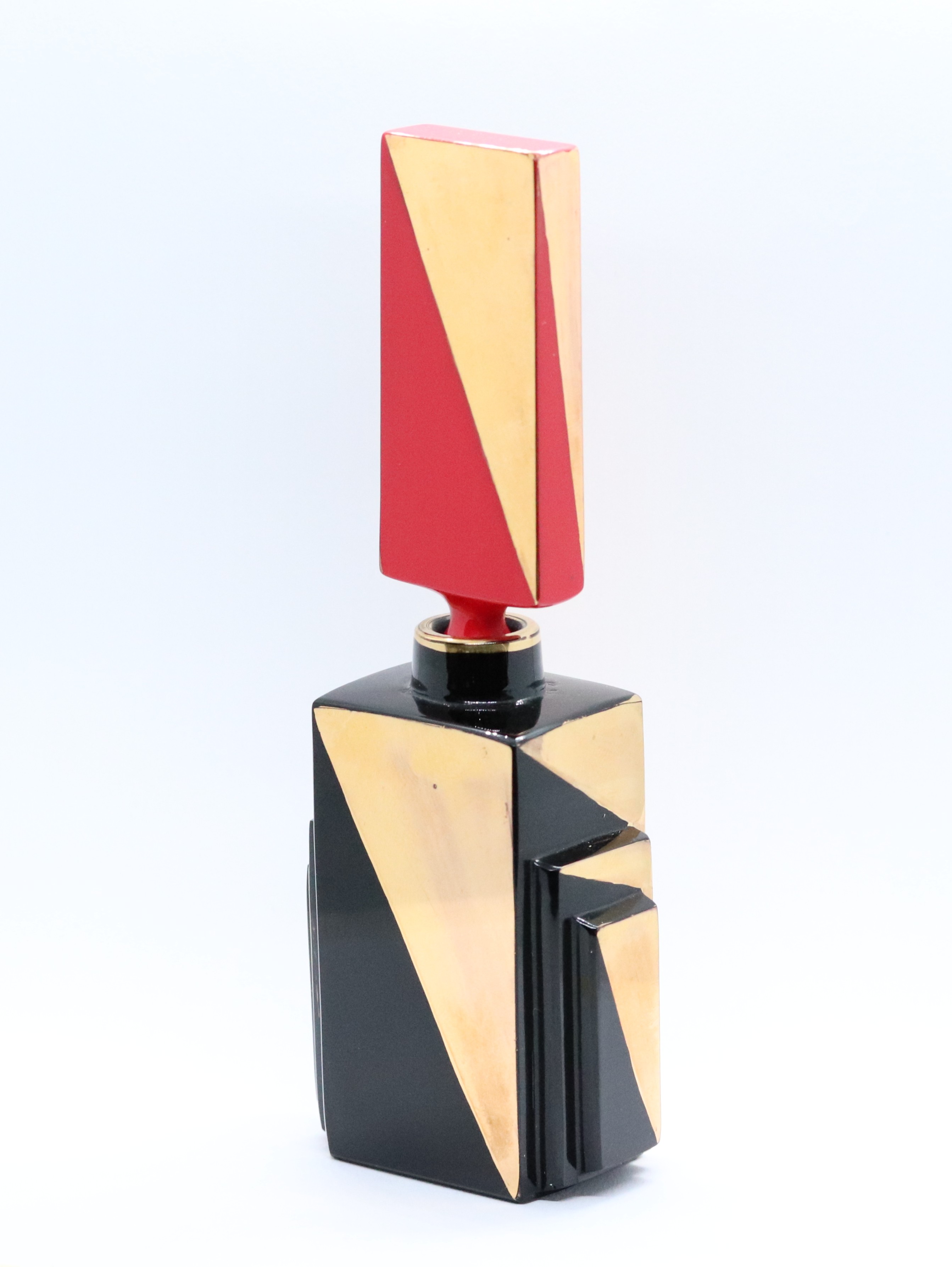 Art deco výjimečný skleněný flakón, s pipetou, zdobené zlatou, černou a červenou lazurou, Heinrich Hoffmann, Československo, 30. léta 20. století, sběratelský kousek; výška 15 cm, šířka 5 cm