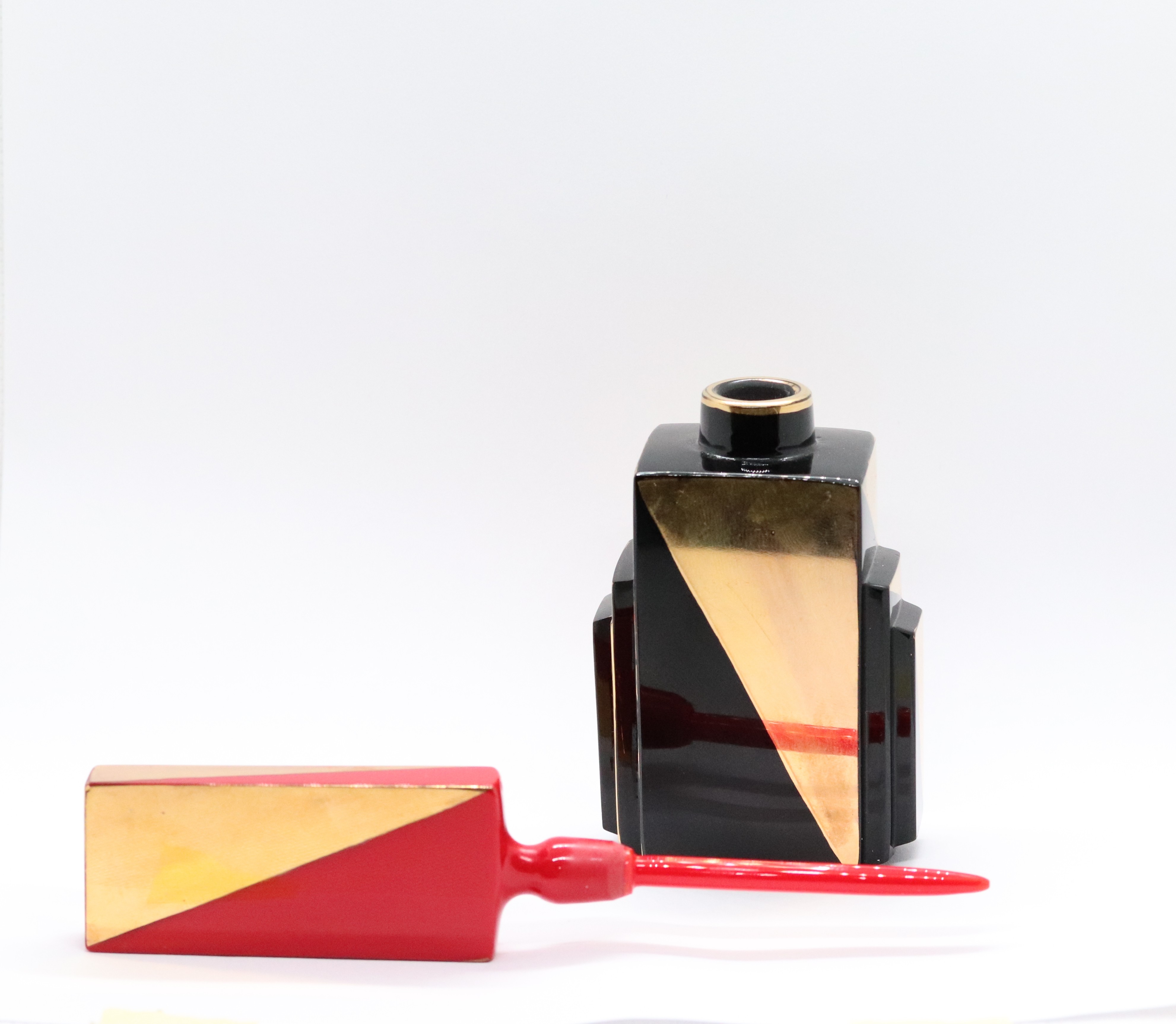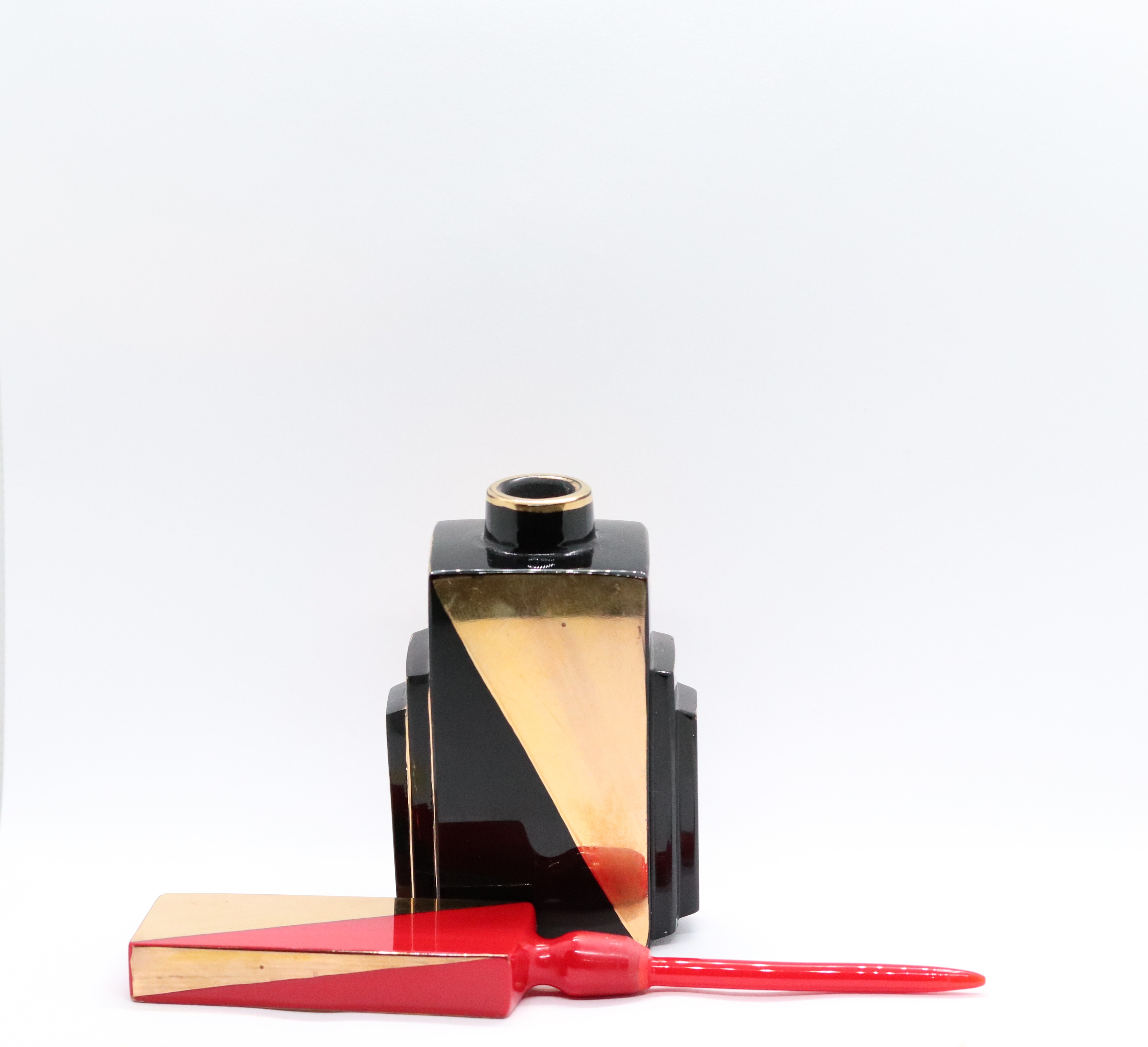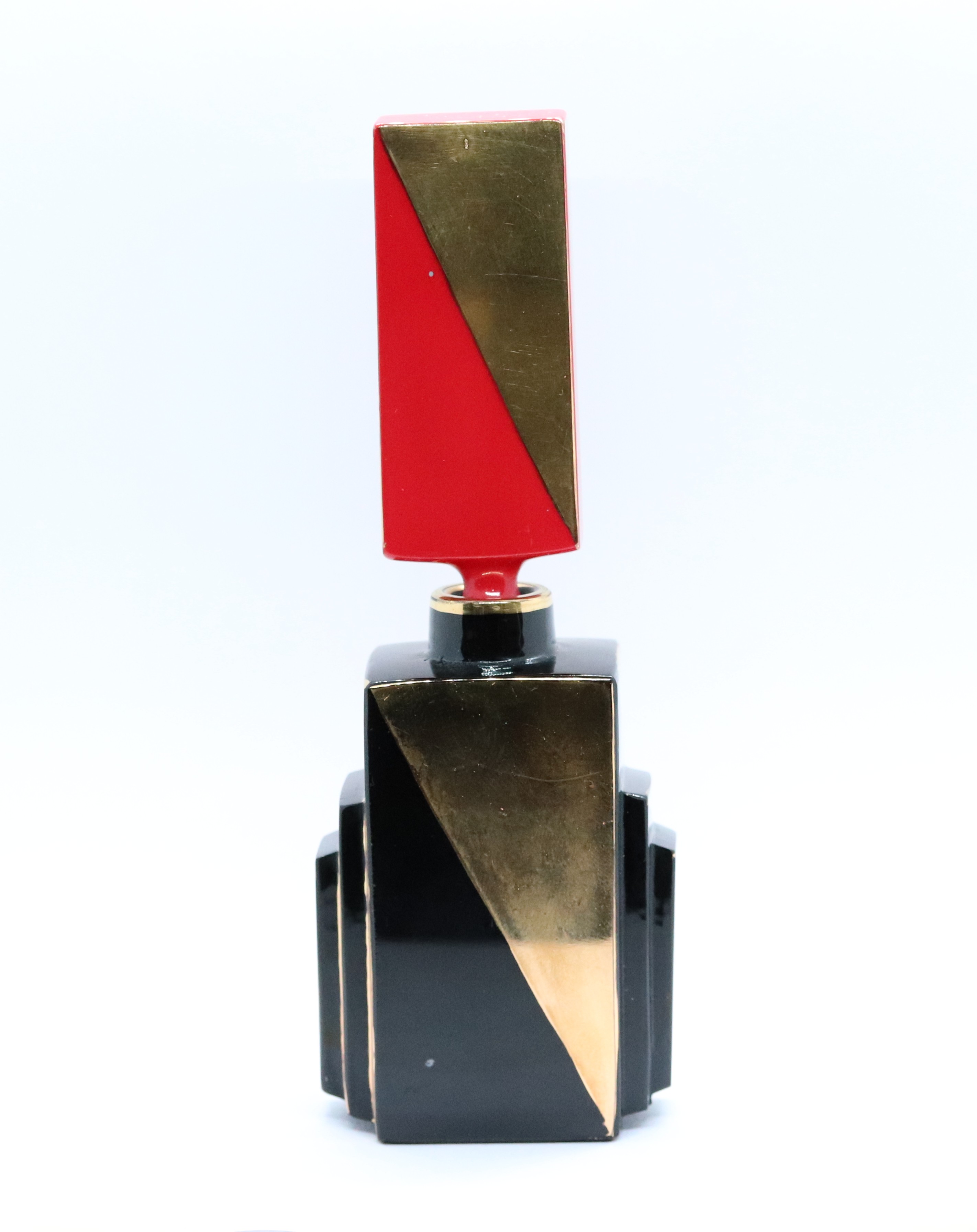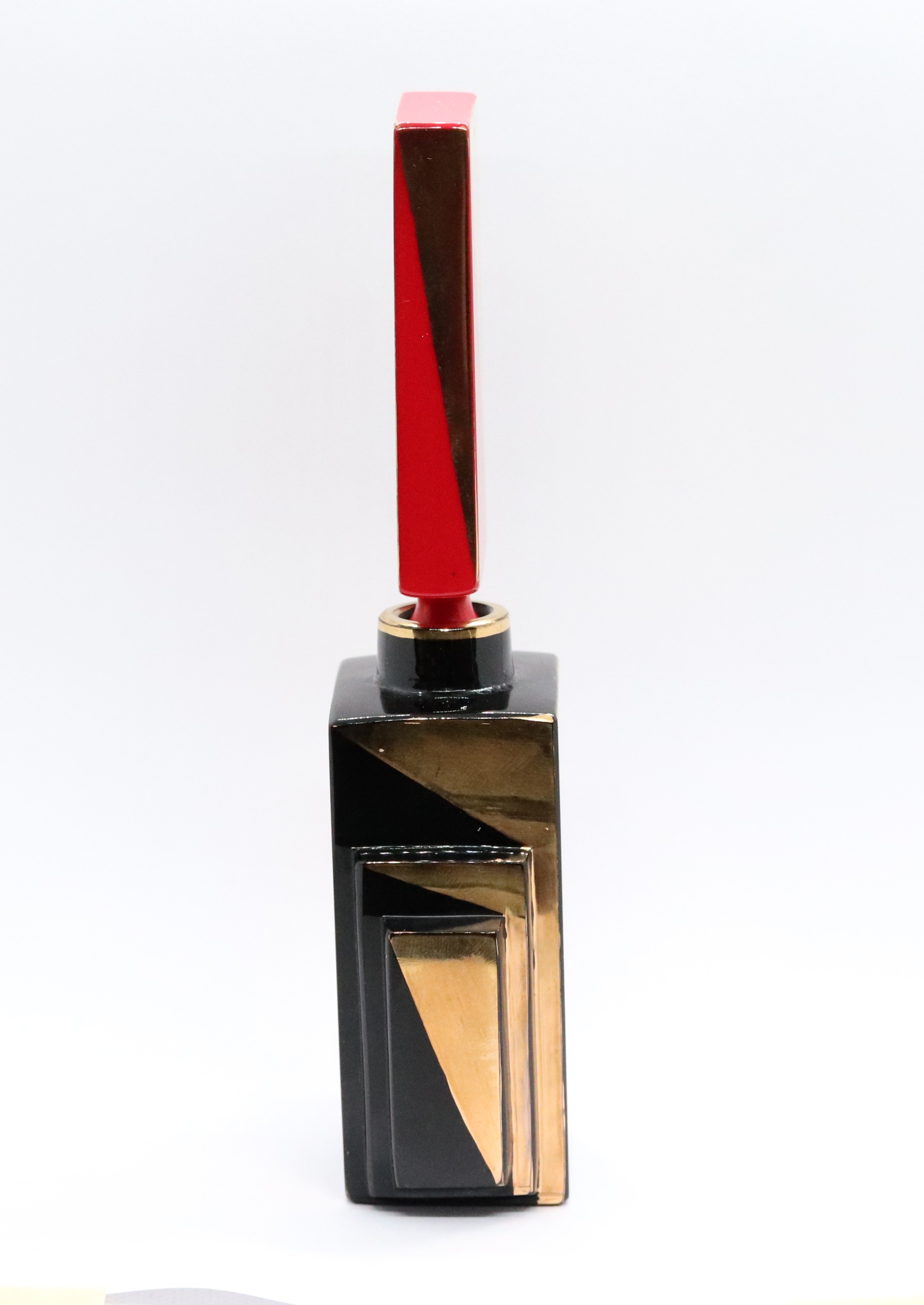 Art deco výjimečný skleněný flakón, s pipetou, zdobené zlatou, černou a červenou lazurou, Heinrich Hoffmann, Československo, 30. léta 20. století, sběratelský kousek; výška 15 cm, šířka 5 cm