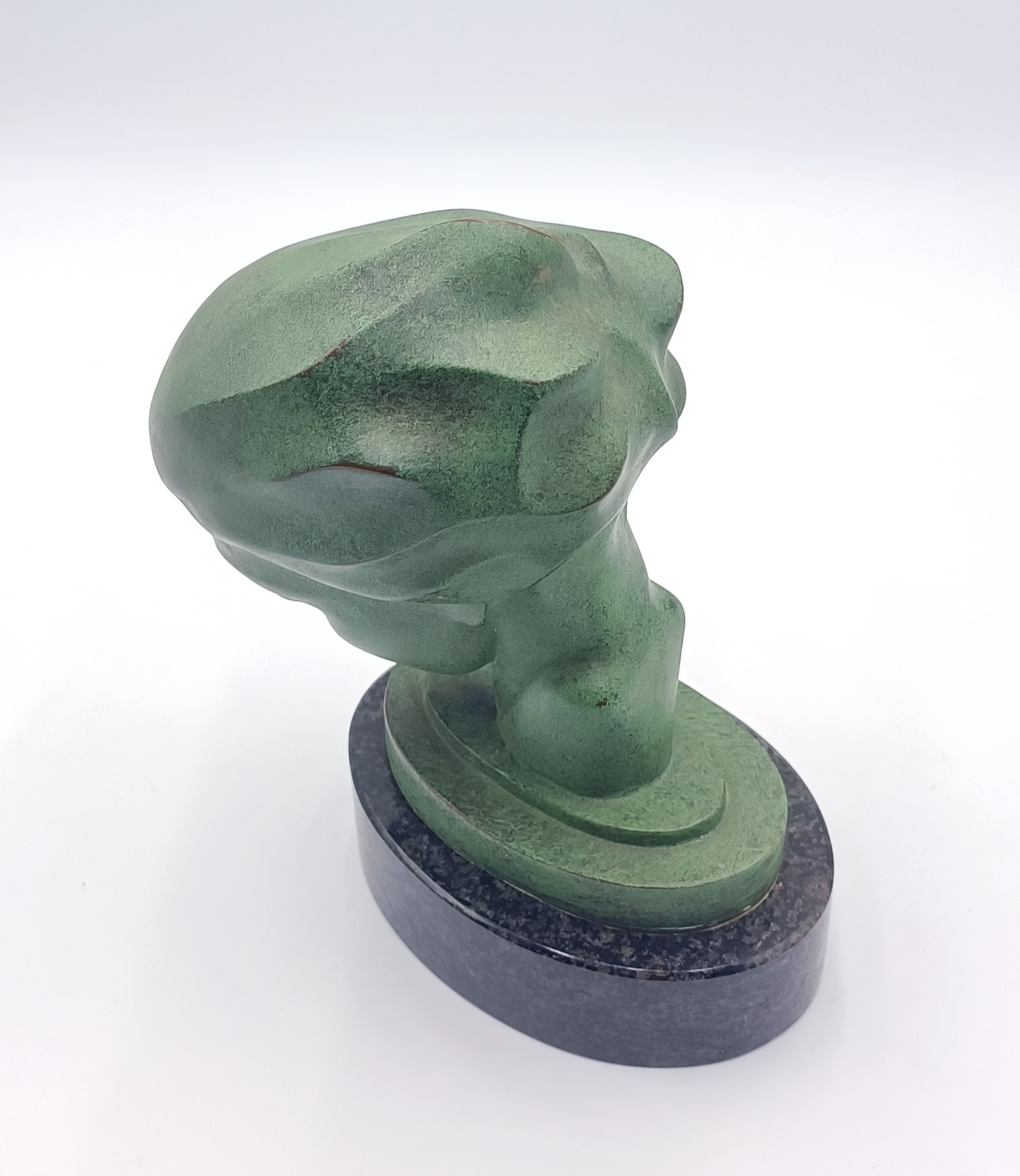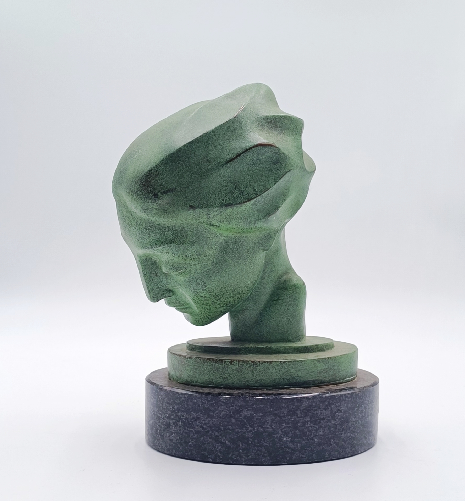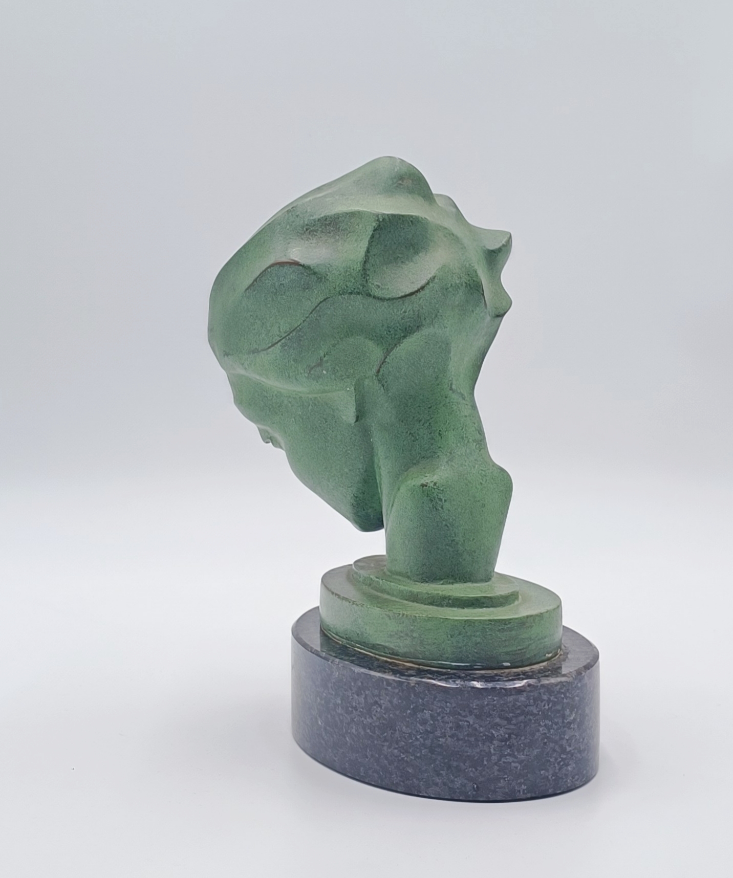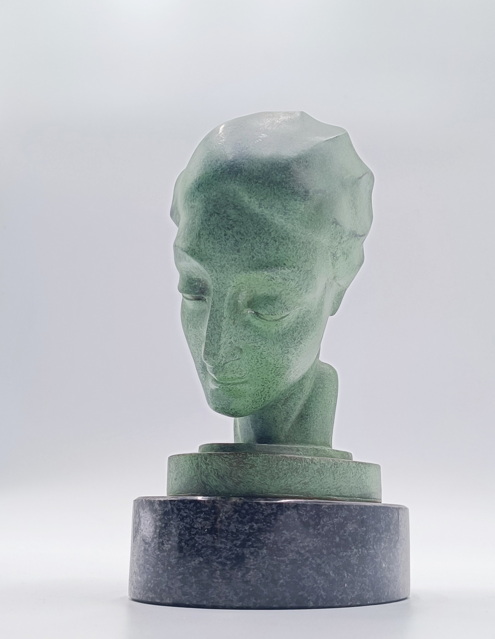Art deco hlava ženy s rozevlátými vlasy, patinovaný bronz, na žulovém podstavci, Československo, 30. léta 20. století (existuje tato hlava v keramice se signaturou J. Kříž, 31); výška 26 cm, šířka podstavce 12 cm, délka 17,5 cm