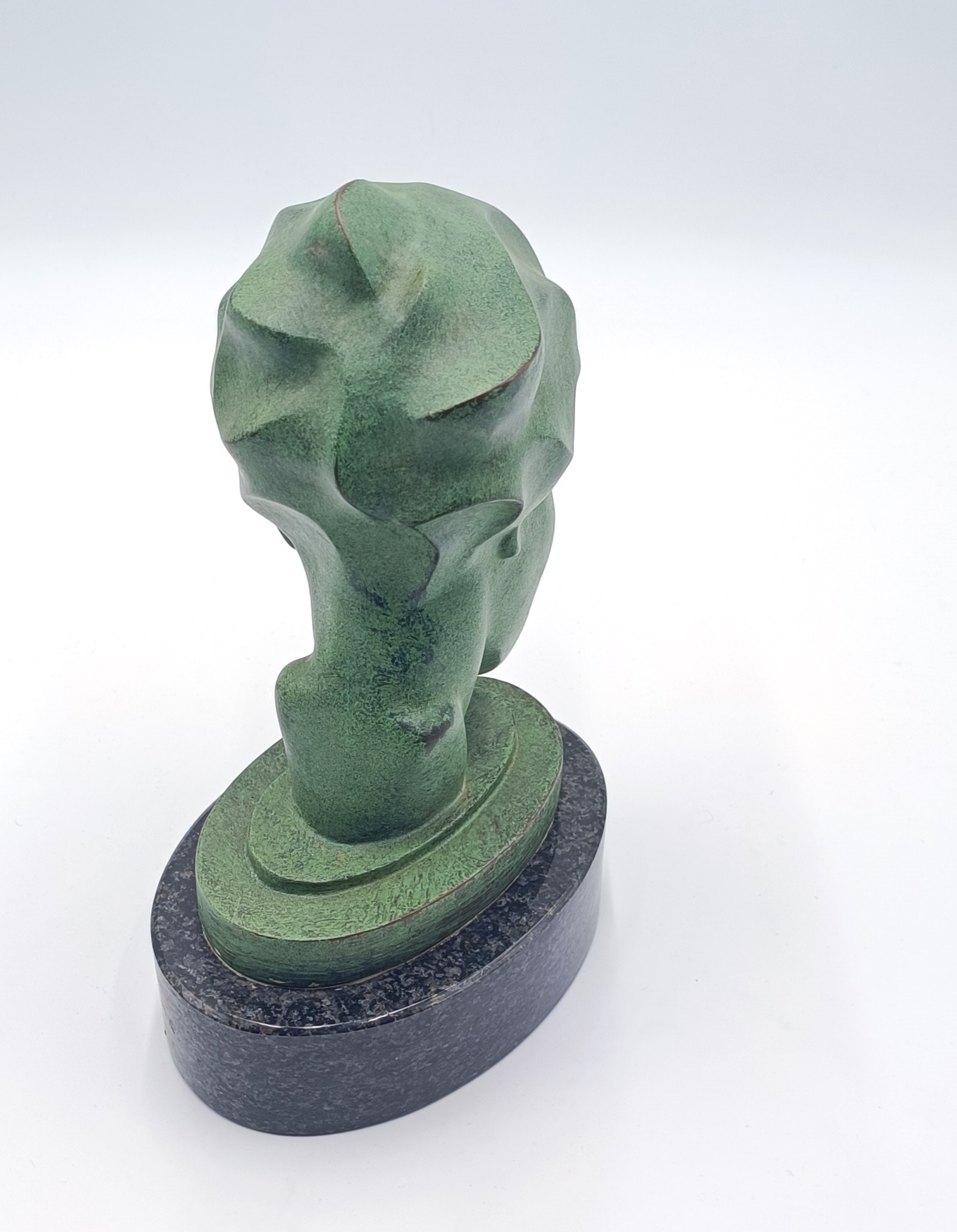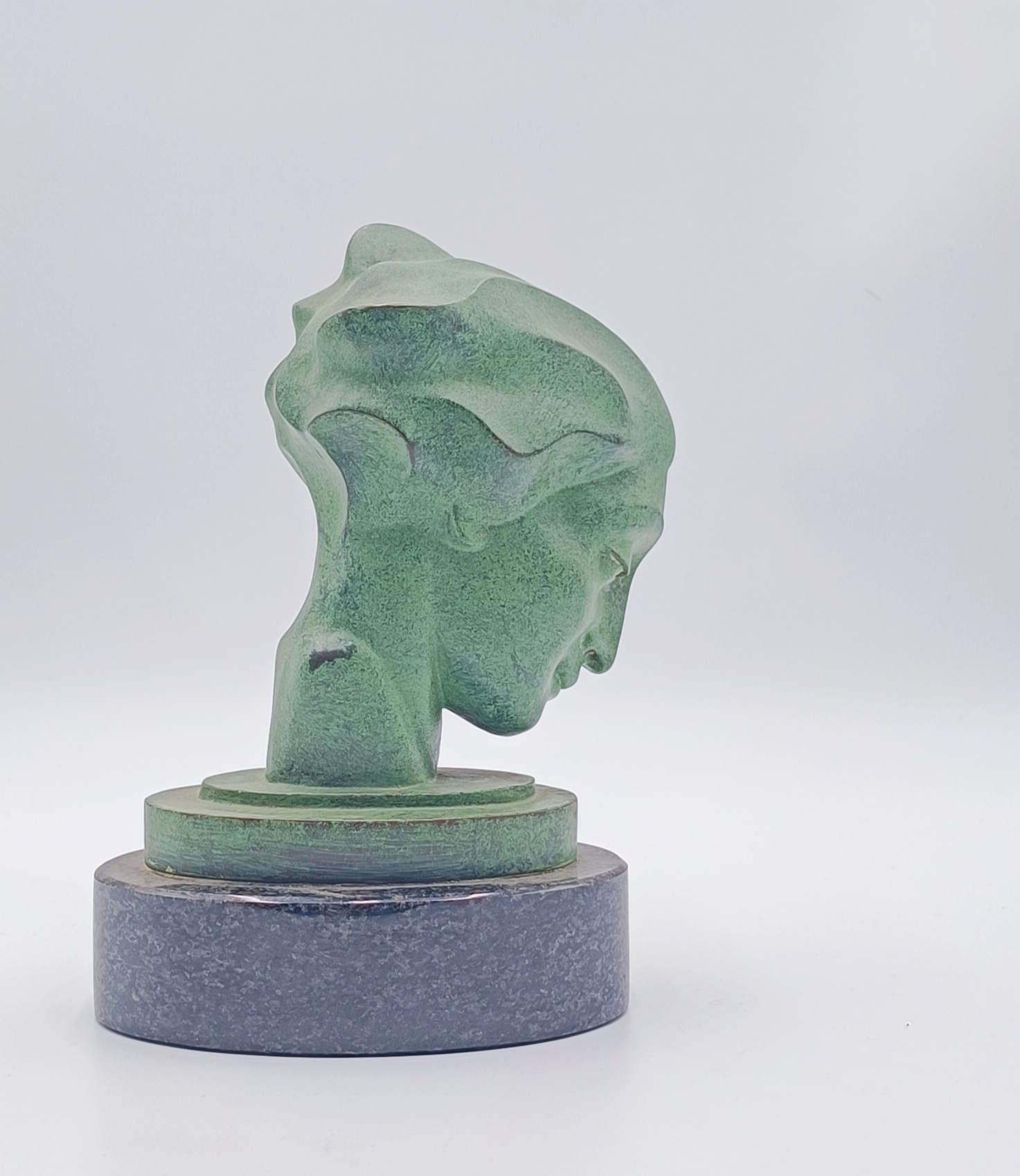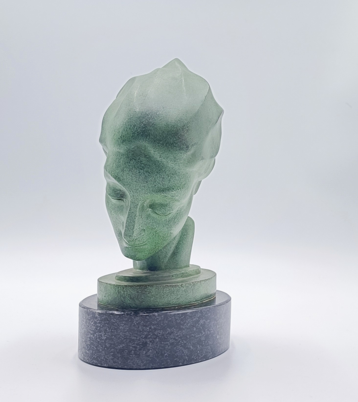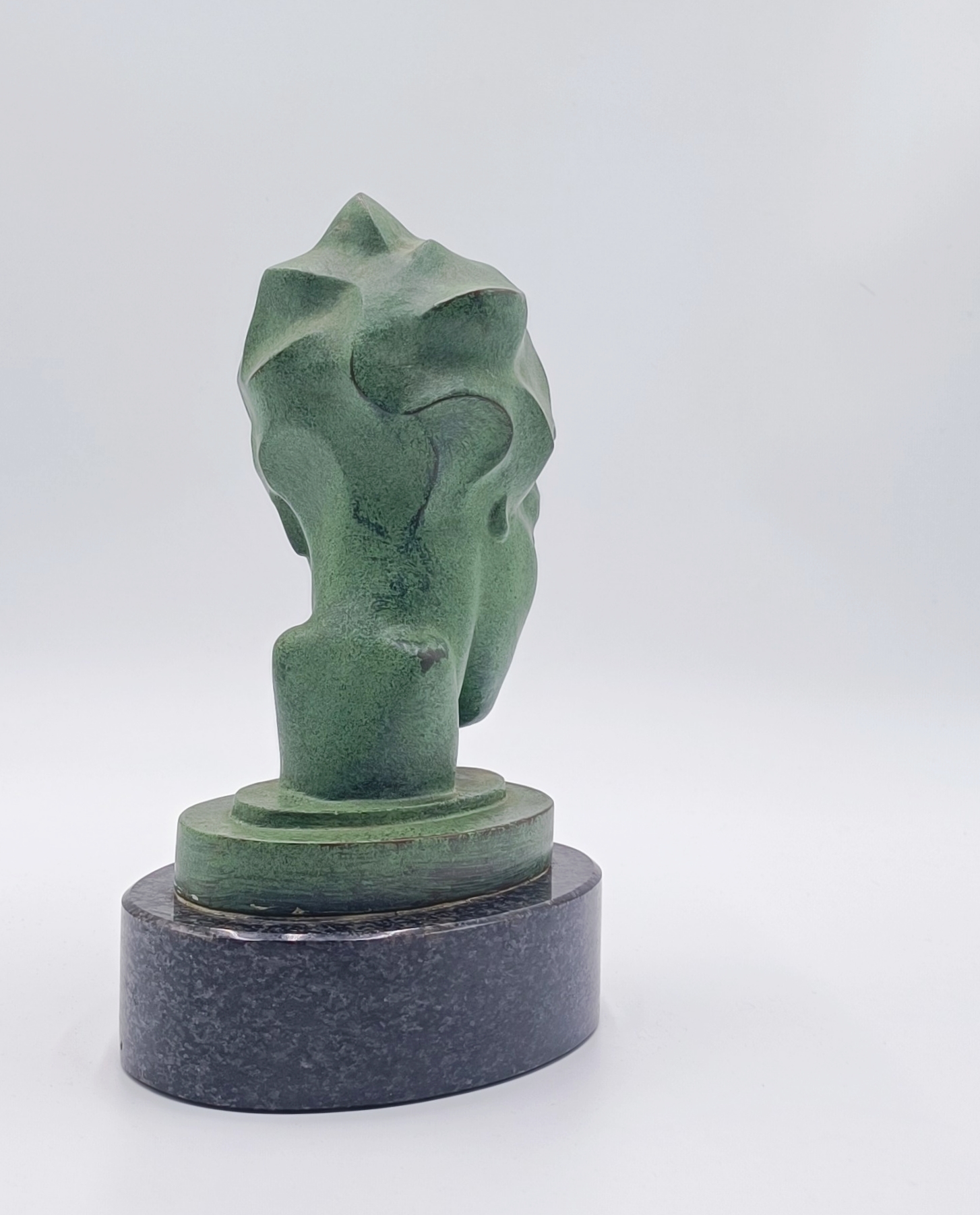 Art deco hlava ženy s rozevlátými vlasy, patinovaný bronz, na žulovém podstavci, Československo, 30. léta 20. století (existuje tato hlava v keramice se signaturou J. Kříž, 31); výška 26 cm, šířka podstavce 12 cm, délka 17,5 cm