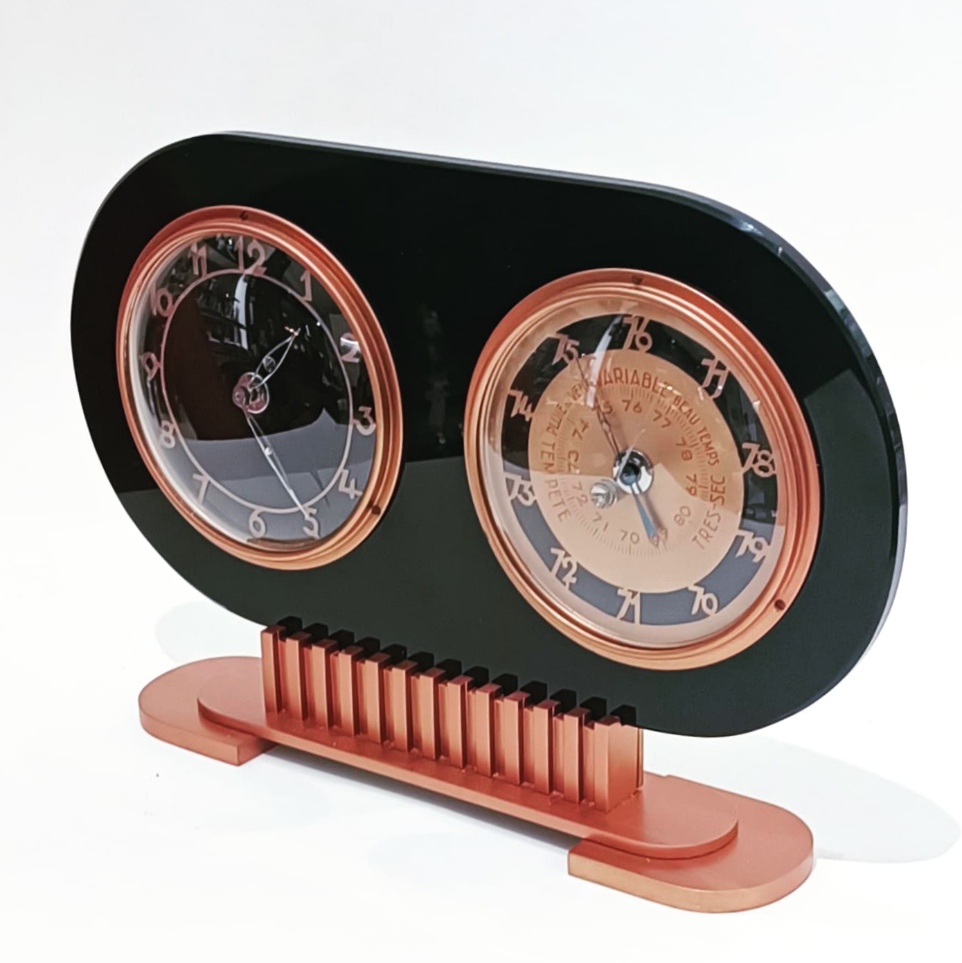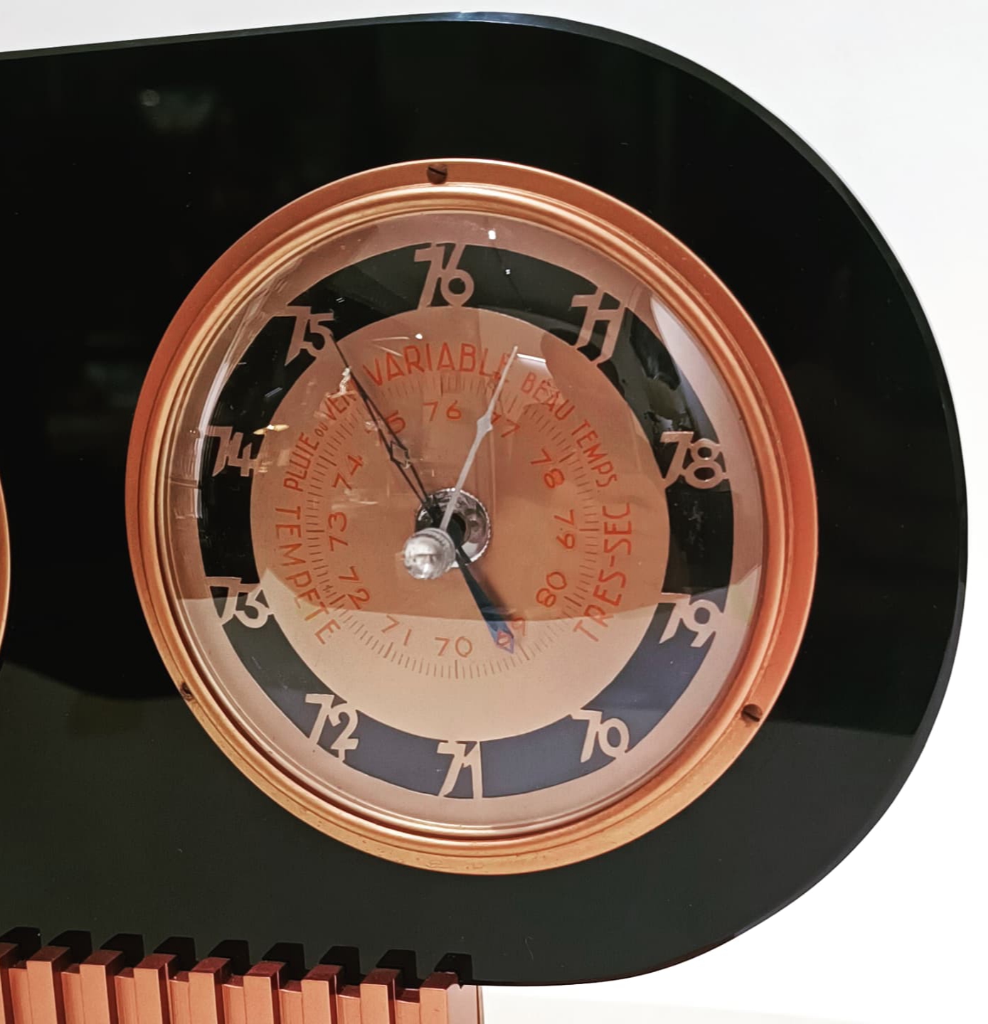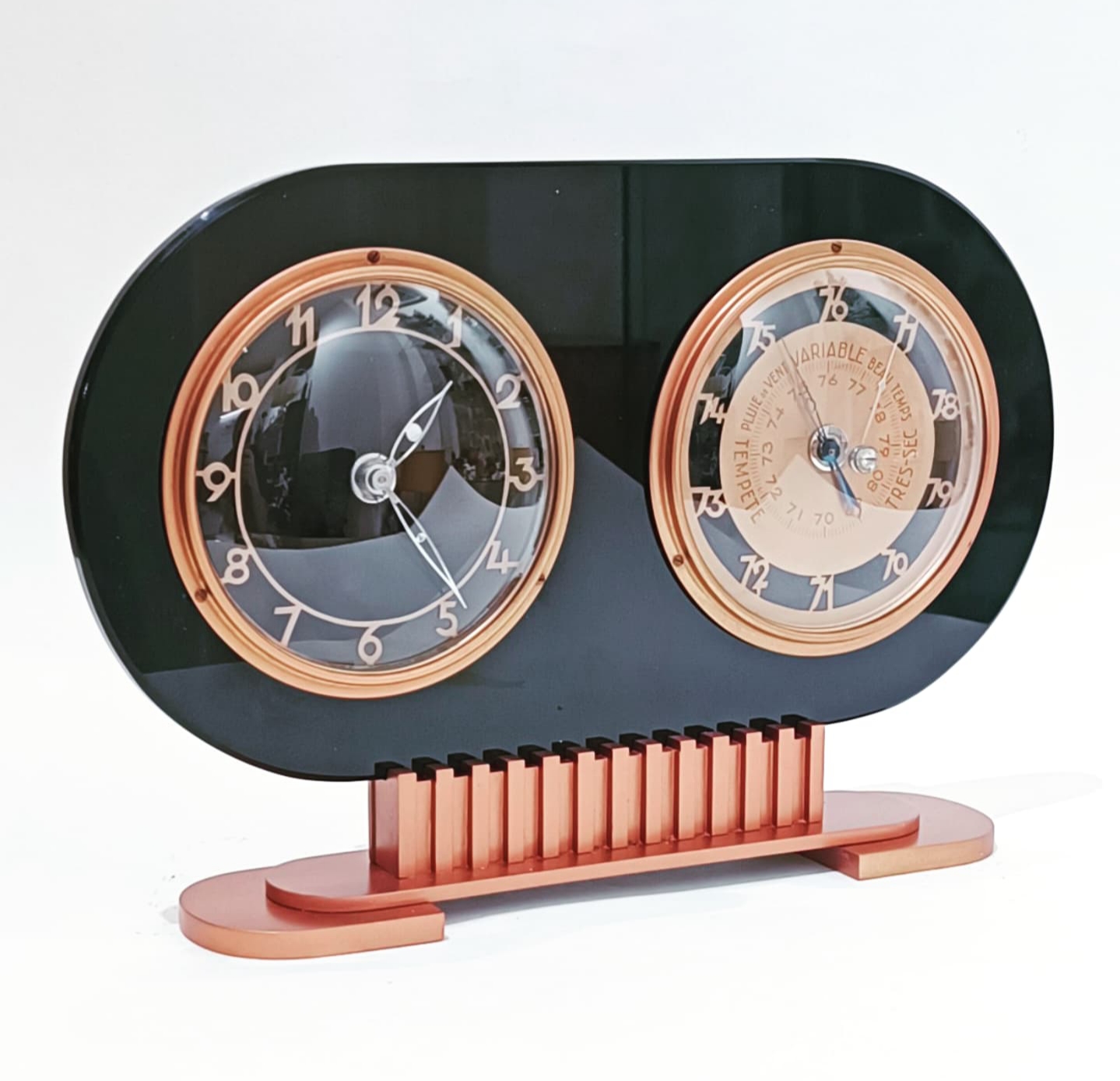 Art deco hodiny s barometrem, kombinace skla a kovu, Francie, 30. léta 20. století; výška 19 cm, délka 28 cm, šířka podstavce 5,5 cm