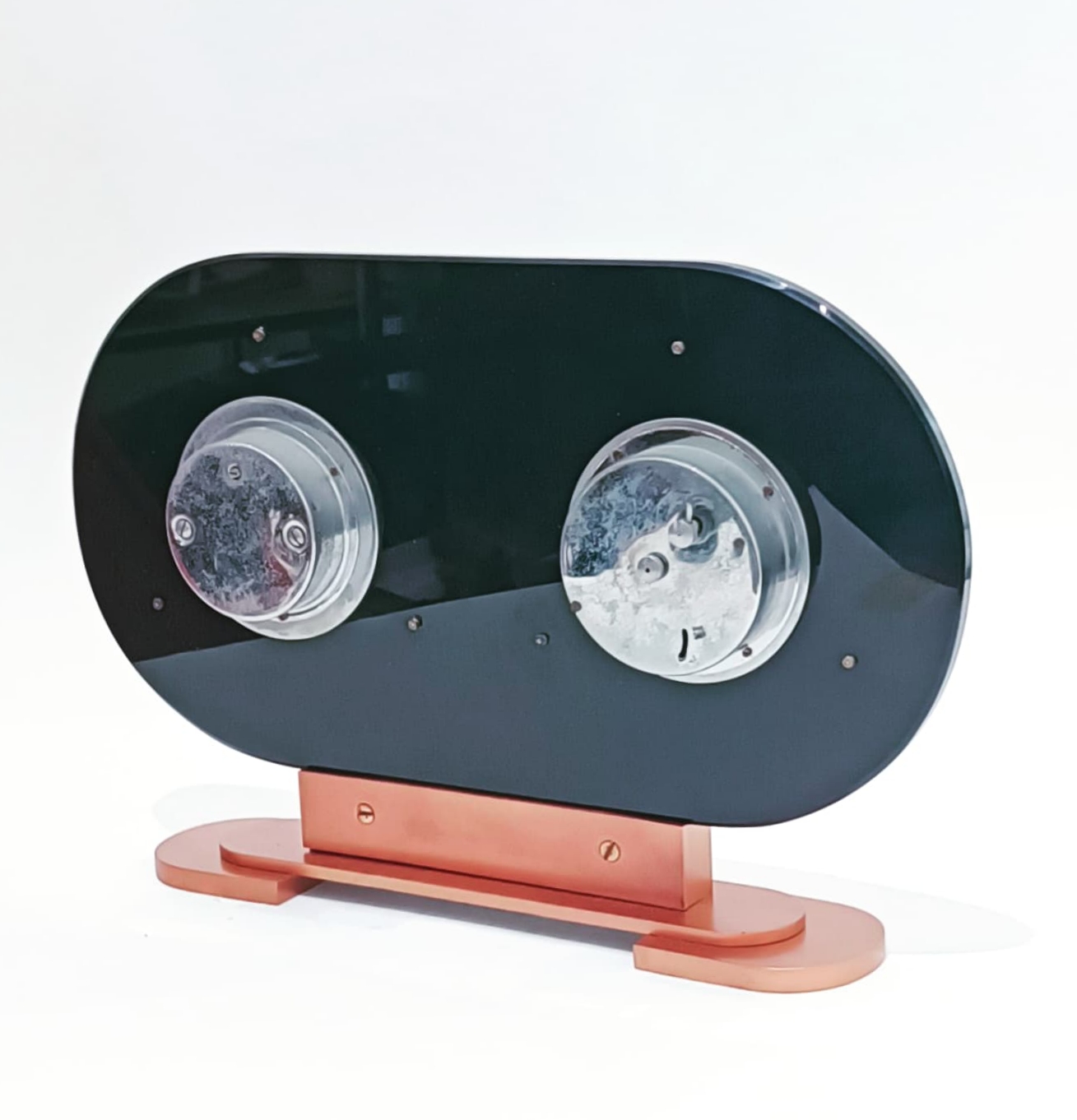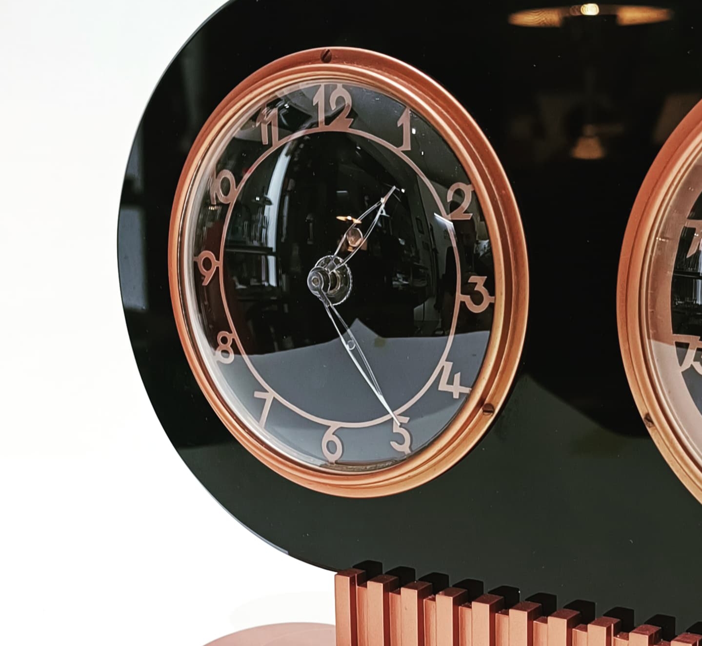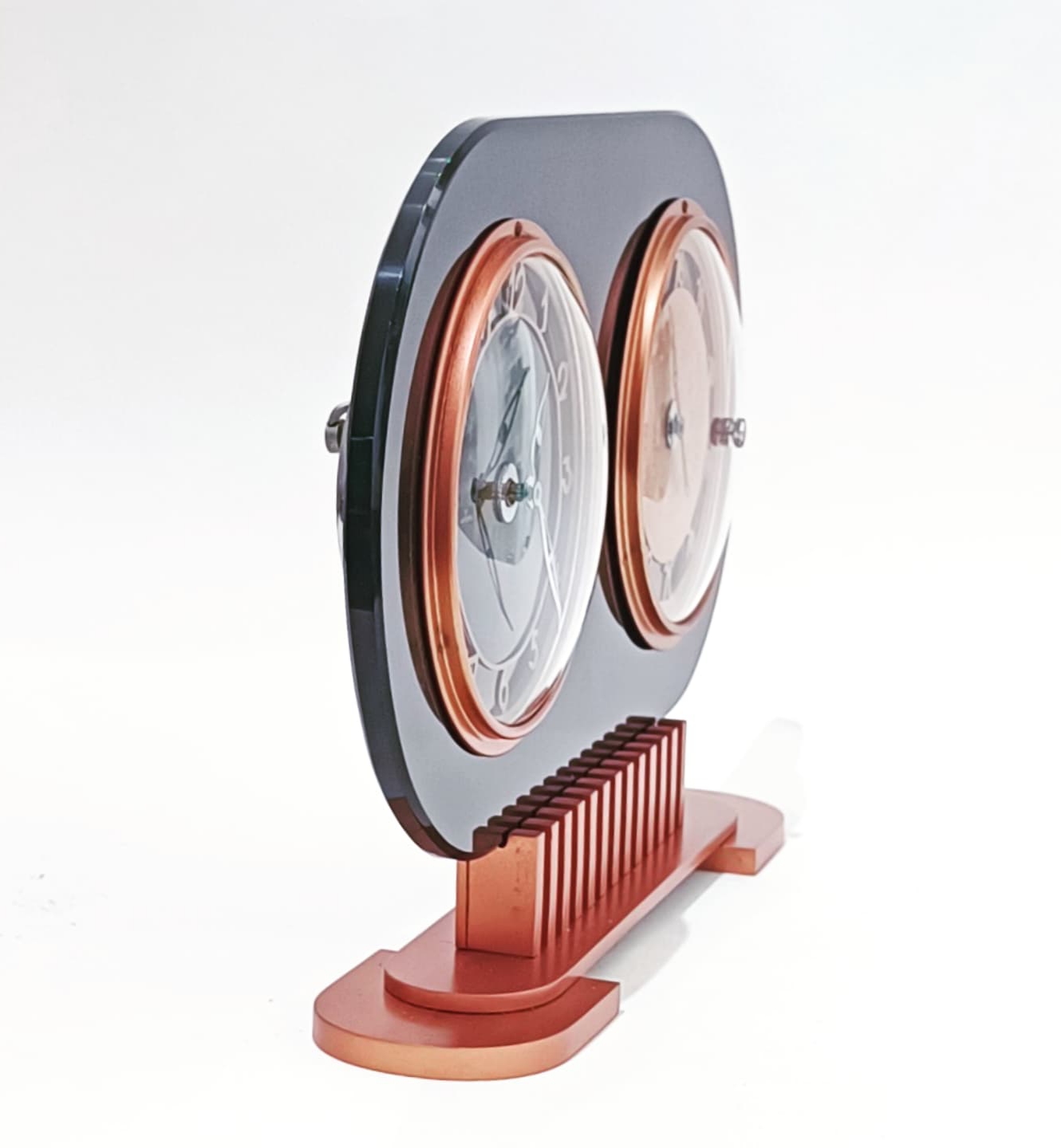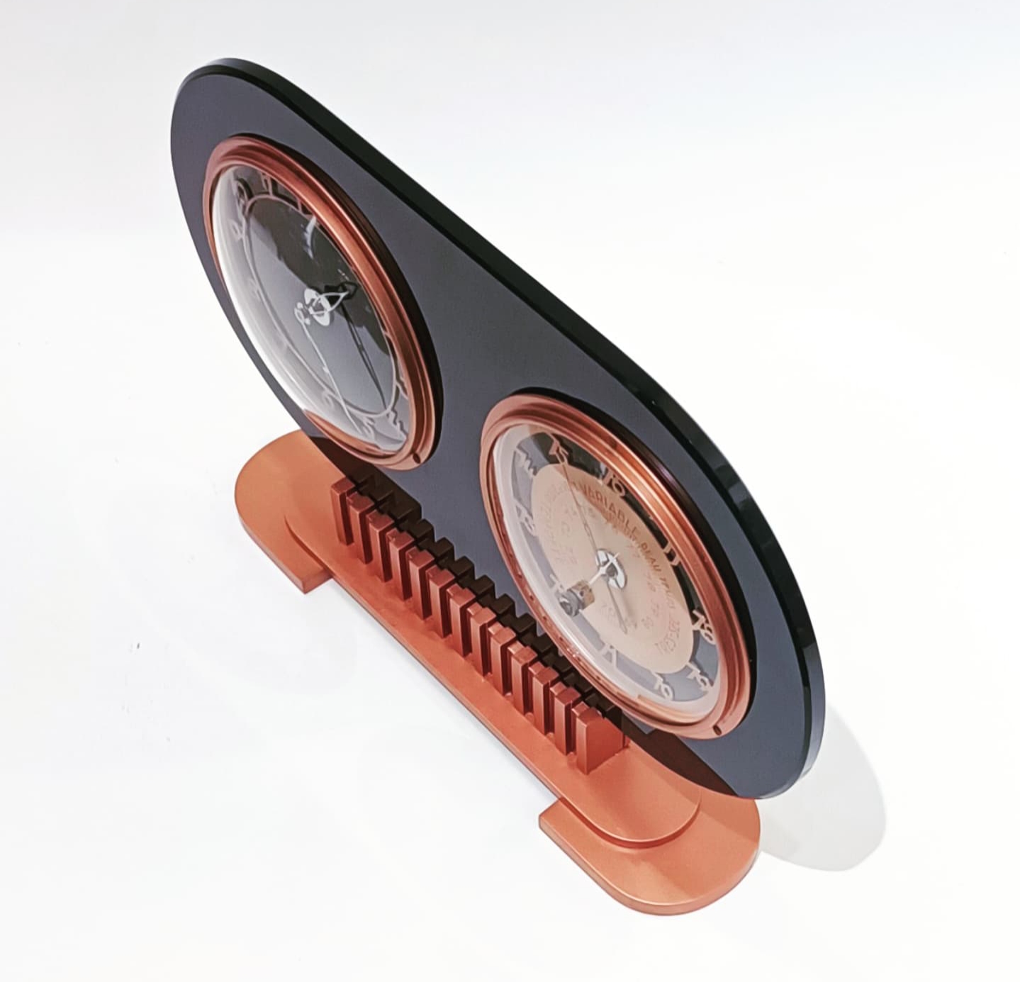 Art deco hodiny s barometrem, kombinace skla a kovu, Francie, 30. léta 20. století; výška 19 cm, délka 28 cm, šířka podstavce 5,5 cm