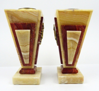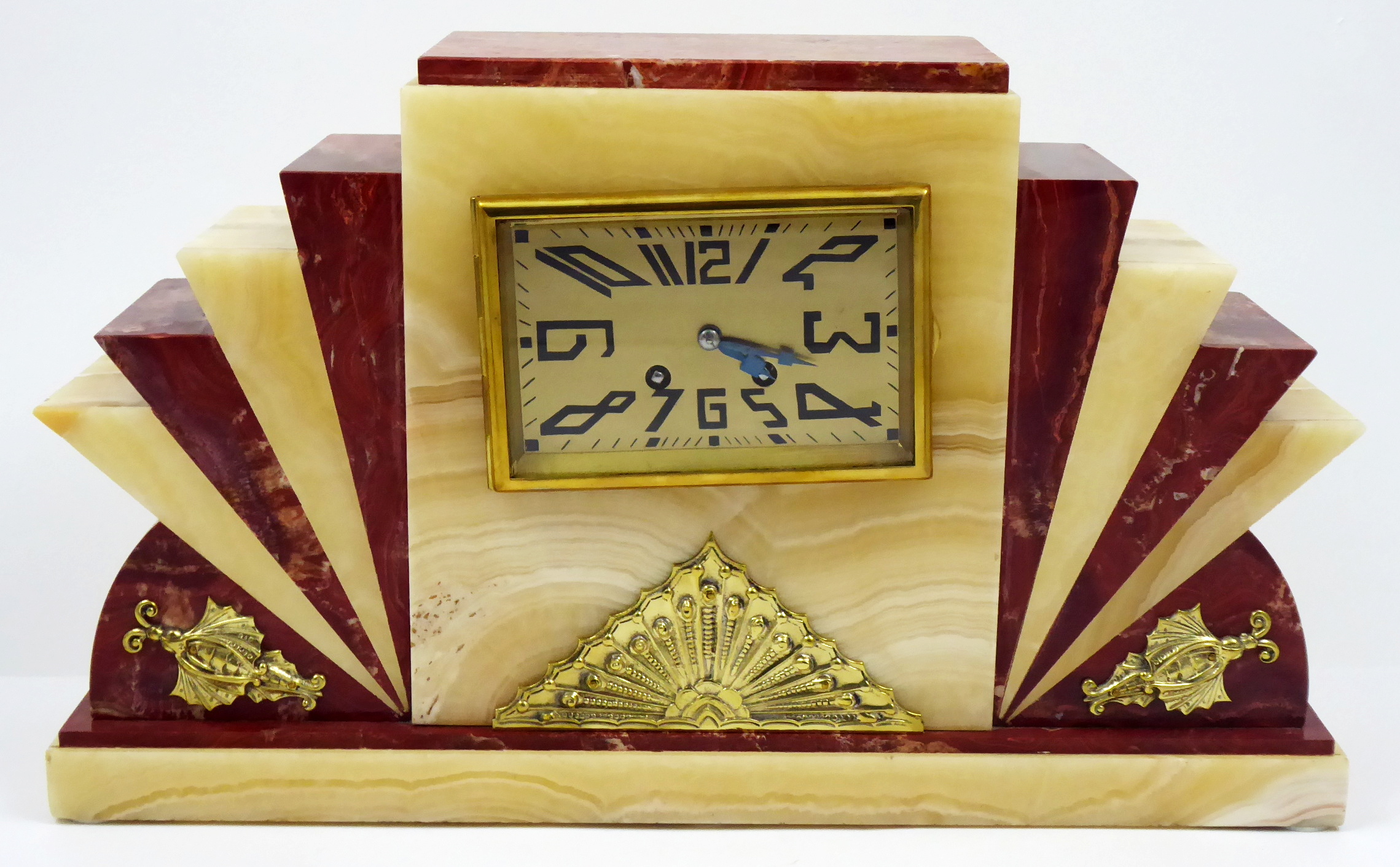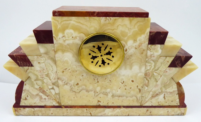 Zlatý a červený onyx (aragonit), mosaz. Půlové bití na zvonek, kotvový krok. Art deco stylové krbové hodiny ze zlatého a červeného onyxu s mosaznými zdobnými aplikacemi. Zlatavý ciferník s černými číslicemi. Hodinový stroj značený EXACTA. Výrobce: LEBREJALE, PARIS. Vzhledem ke stáří hodin bez záruky přesnosti chodu a dlouhodobé funkčnosti. K hodinám patří i dva dekorativní svícny s vyjímatelnými kalíšky. Francie, Paříž, 30. léta minulého století. Hodiny: výška 28,5 cm, šířka 48 cm. Výška dekorativních svícnů 24 cm.