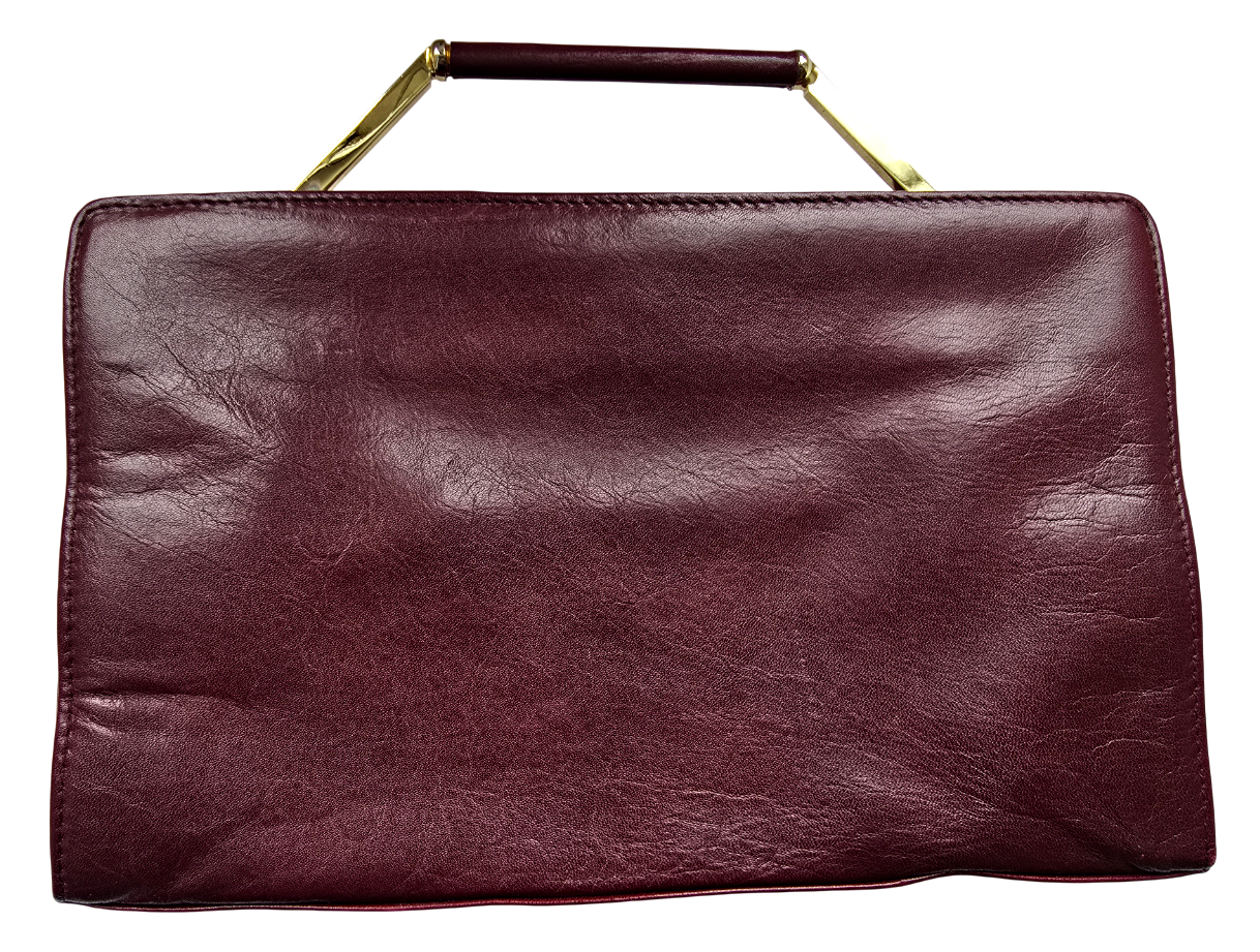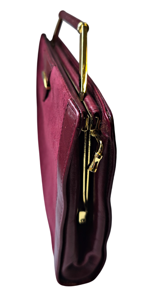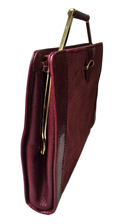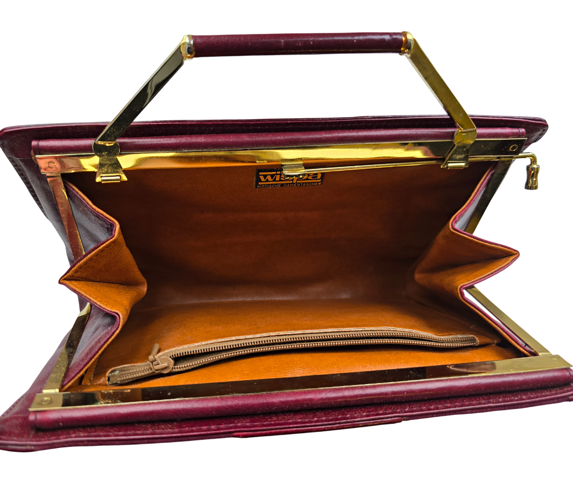 Popis: Art deco kabelka bordó barvy značky Wispa. Vyrobena z měkké hladké kůže. Z přední strany semiš. Rukojeť a ozdoba kabelky z kovu zlaté barvy. Vrch rukojeti potažen hladkou kůží. Zajímavé otevírání zmáčnkutím zlaté páčky směrem dozadu. Uvnitř kabelky podšívka z hnědé kůže. Obsahuje jednu otevřenou kapsu a jednu kapsu uzavíratelou na zip. Uvnitř dále původní štítek \“WISPA Modishe Damentasche\“. Nošení kabelky v ruce.