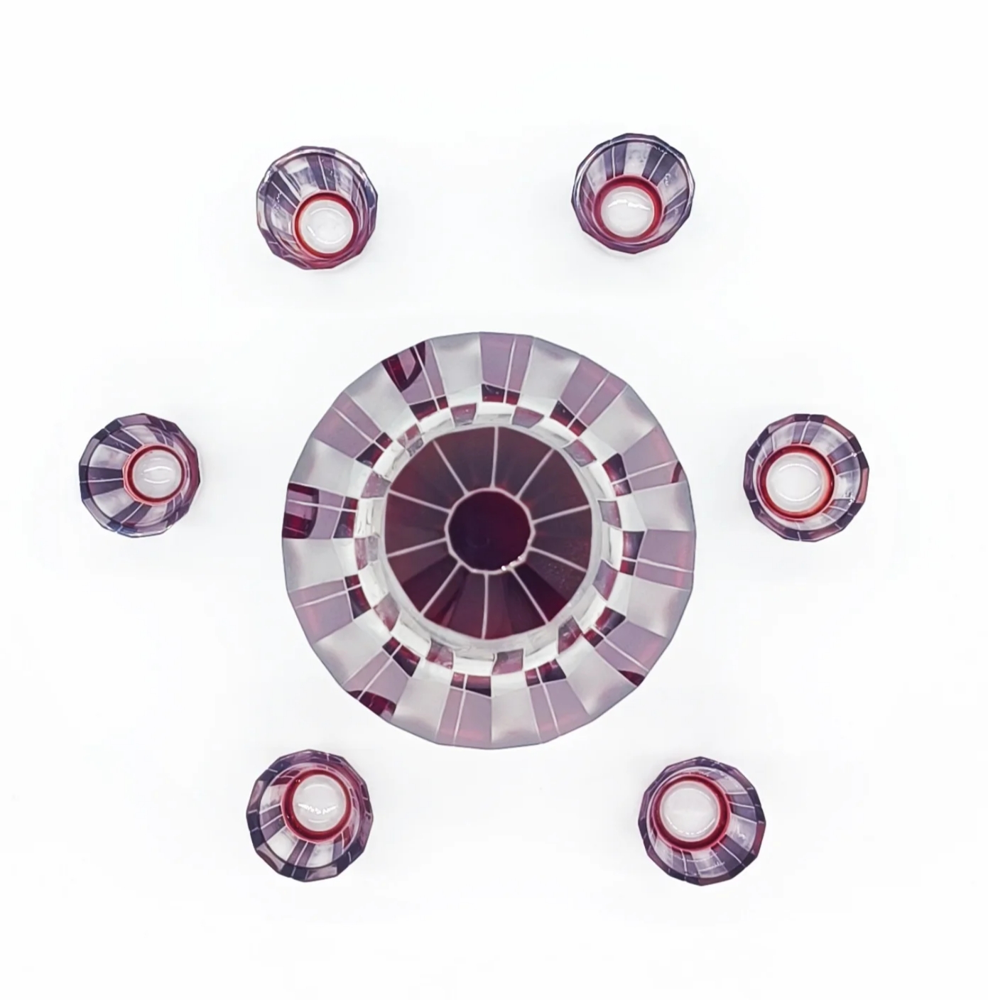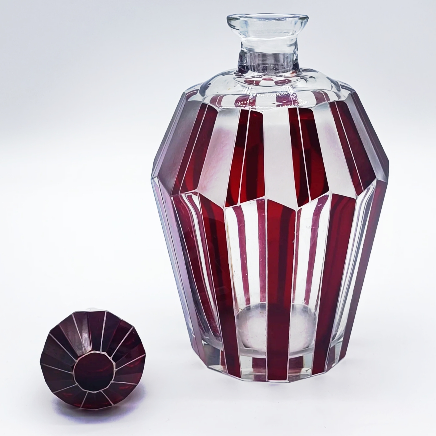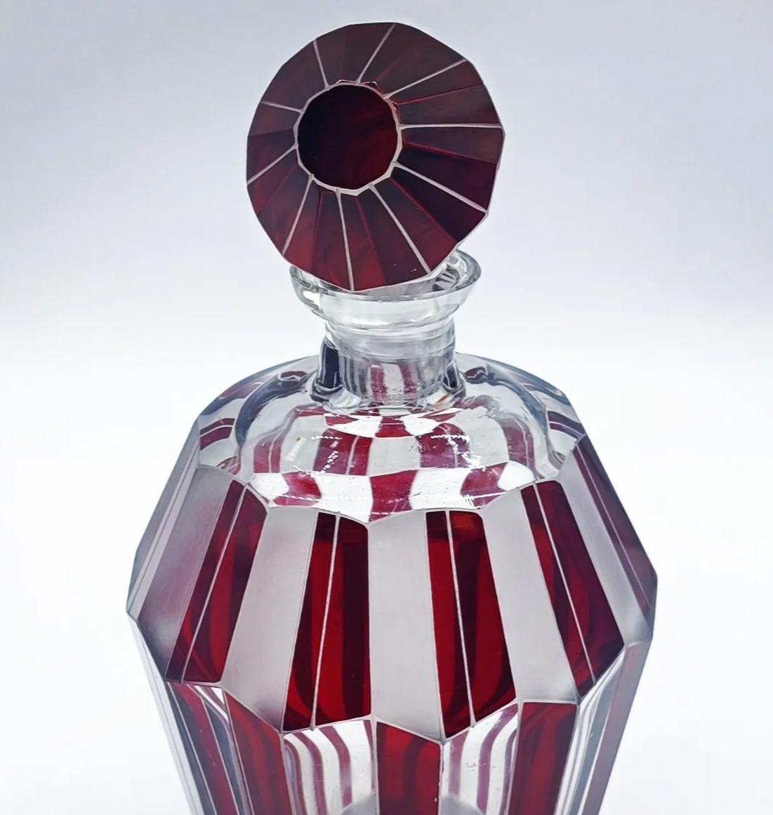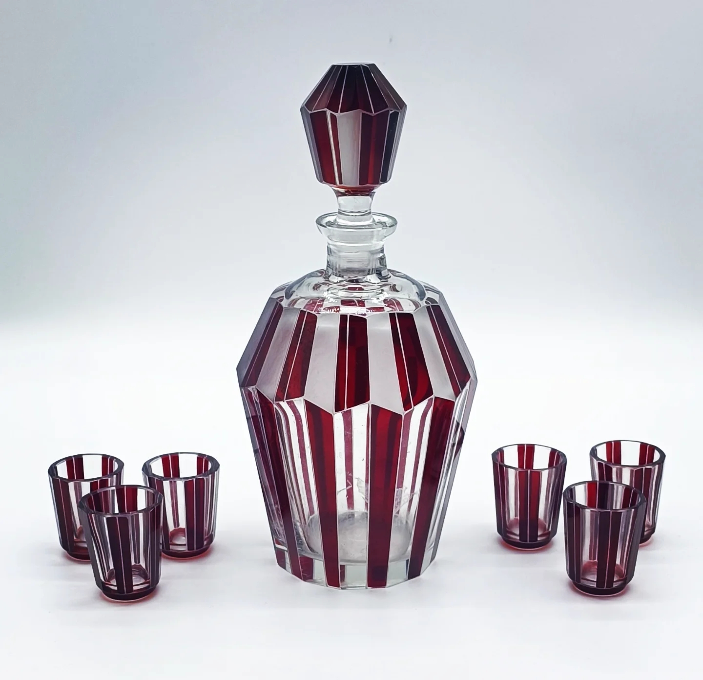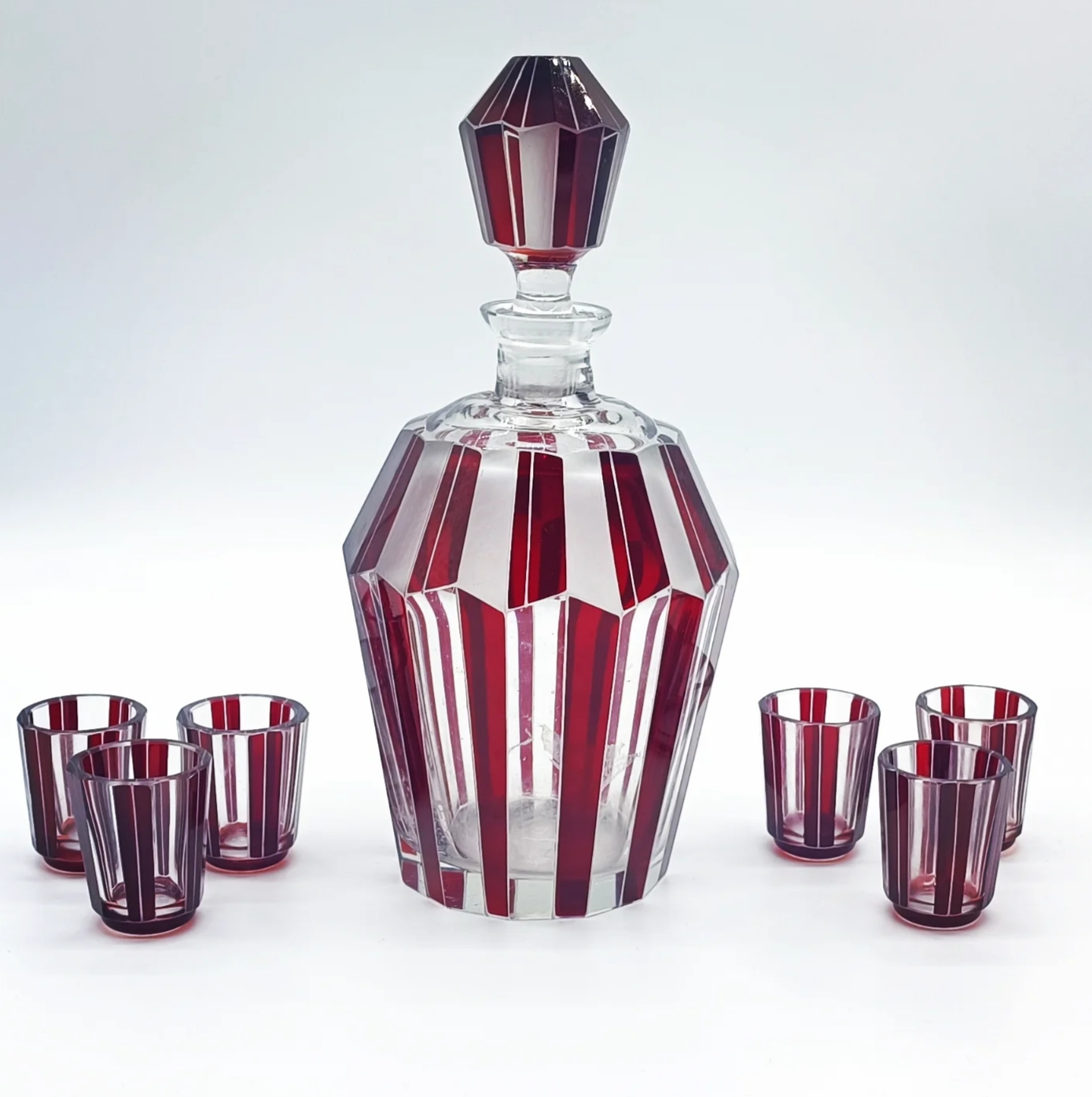 Art deco likérová souprava, čiré, matované sklo s rubínovou lazurou, Československo, 30. léta 20. století, bez poškození, v původním stavu; výška karafy se zátkou 27 cm, bez zátky 19 cm, výška odlivky 5 cm