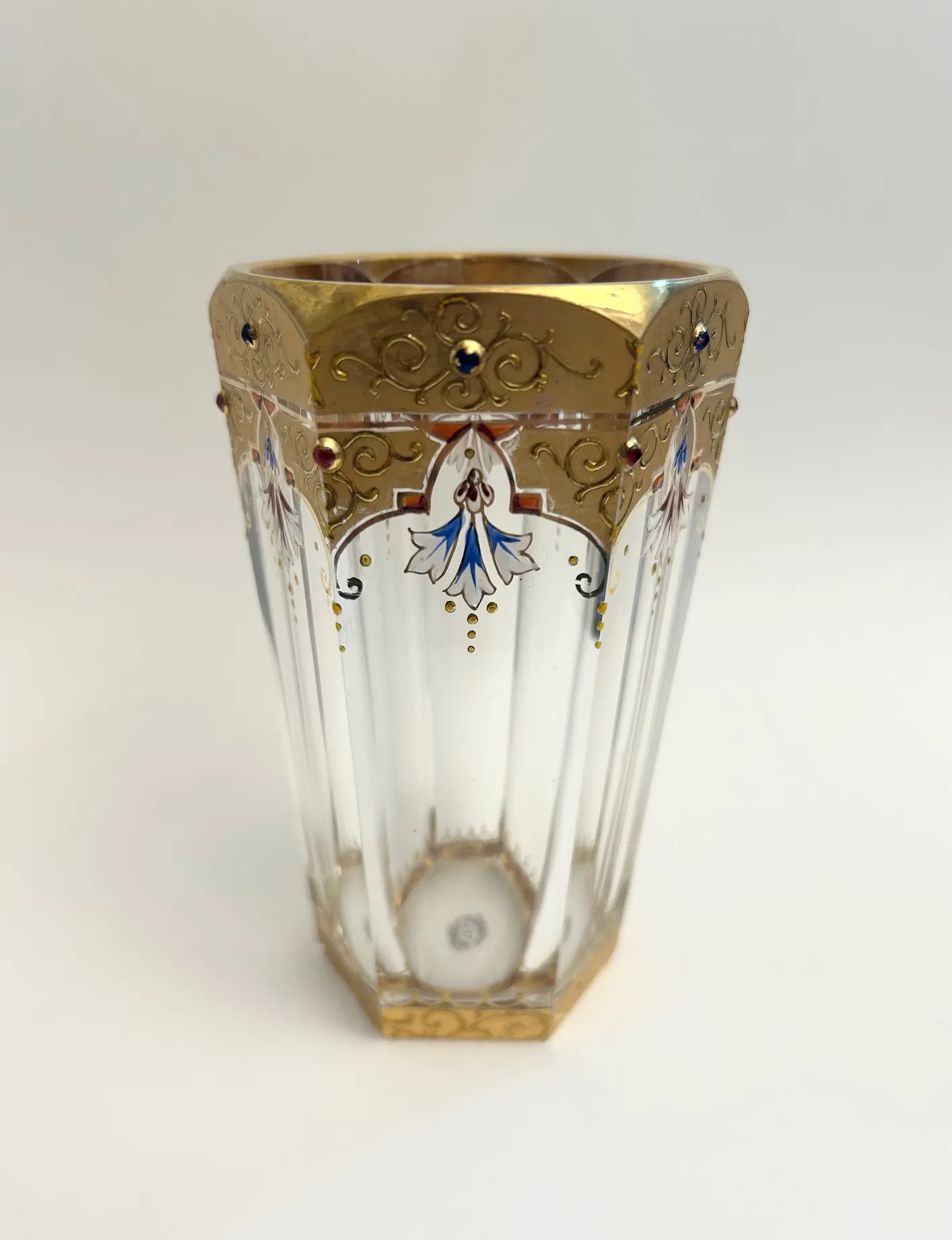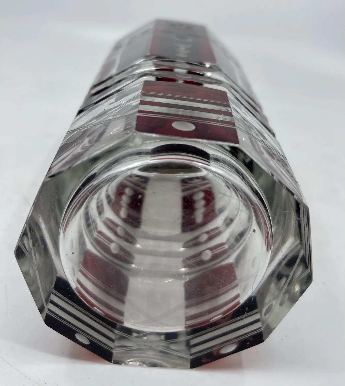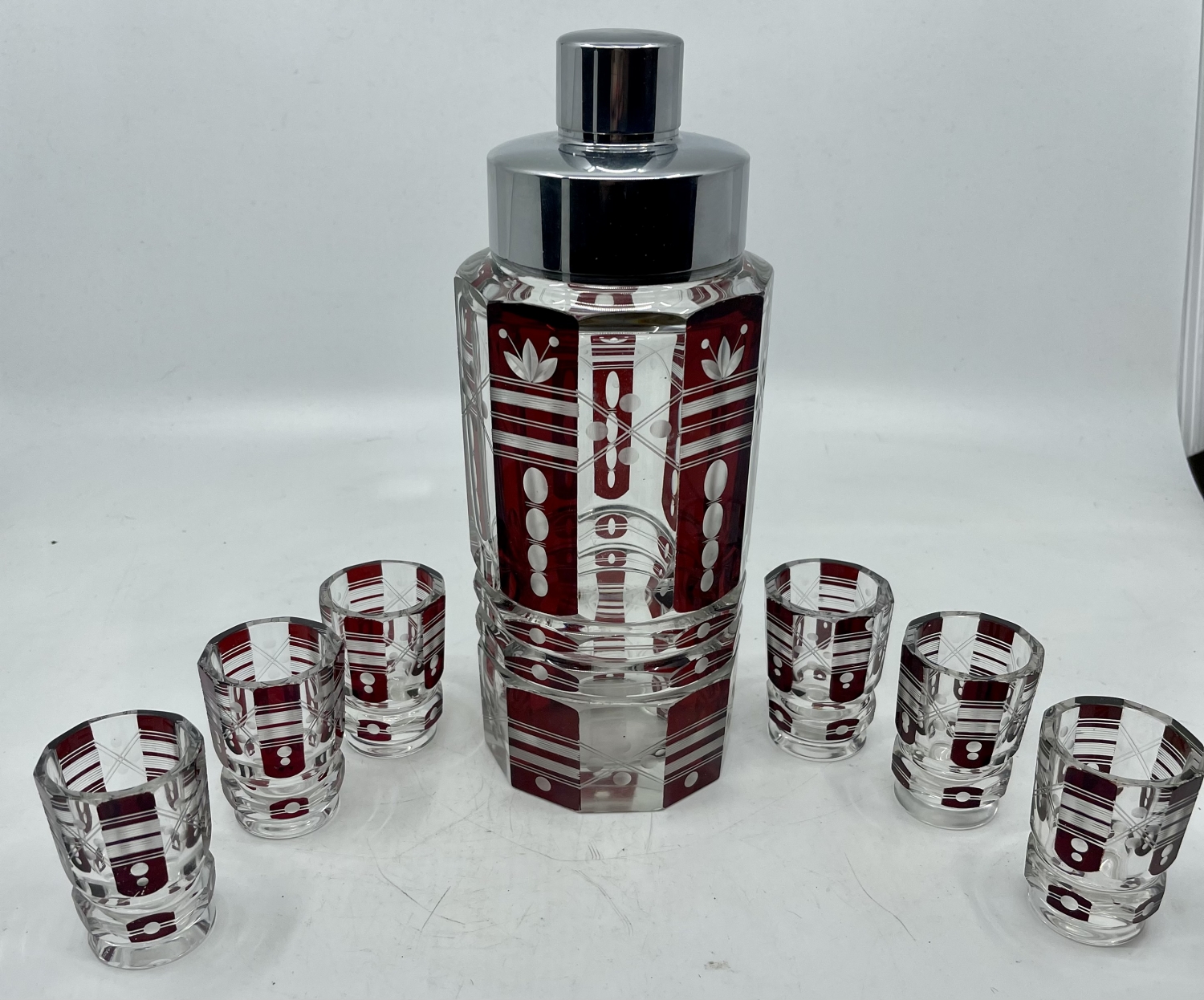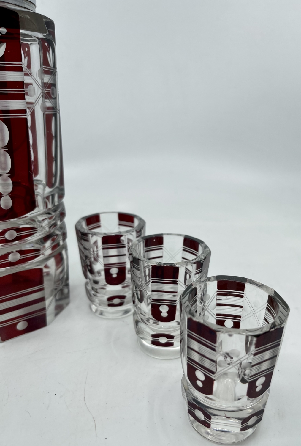 Art déco likérová souprava ,olovnaté vrstvené a broušené sklo , zřejmě Karel Palda,