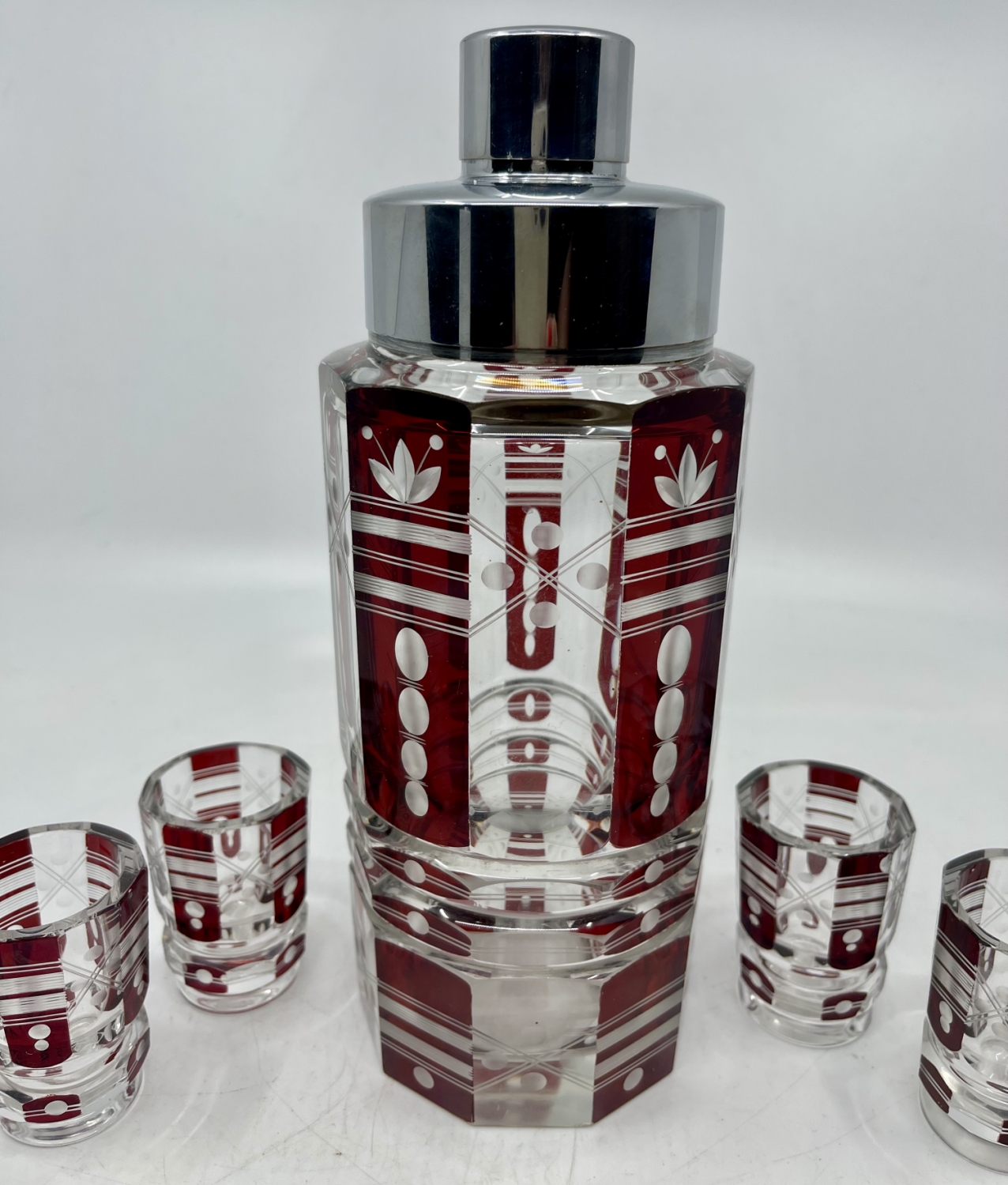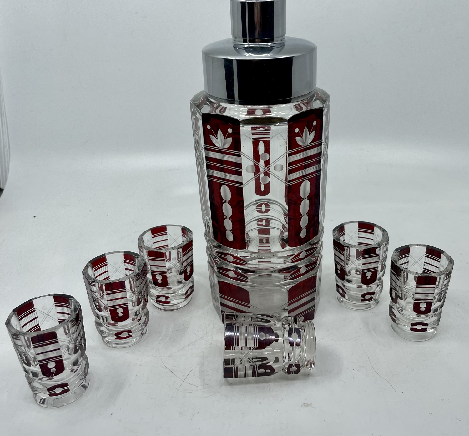 Zajímavá tím,že místo karafy je šejkr. Výška šejkru 24 cm, výška likérek 6 cm.