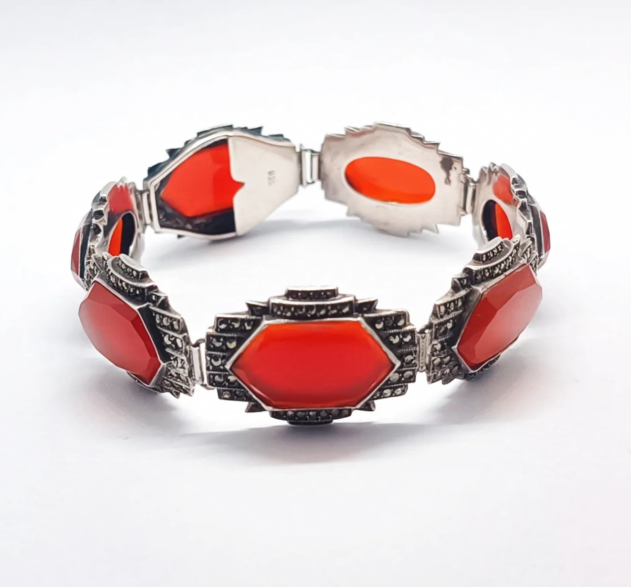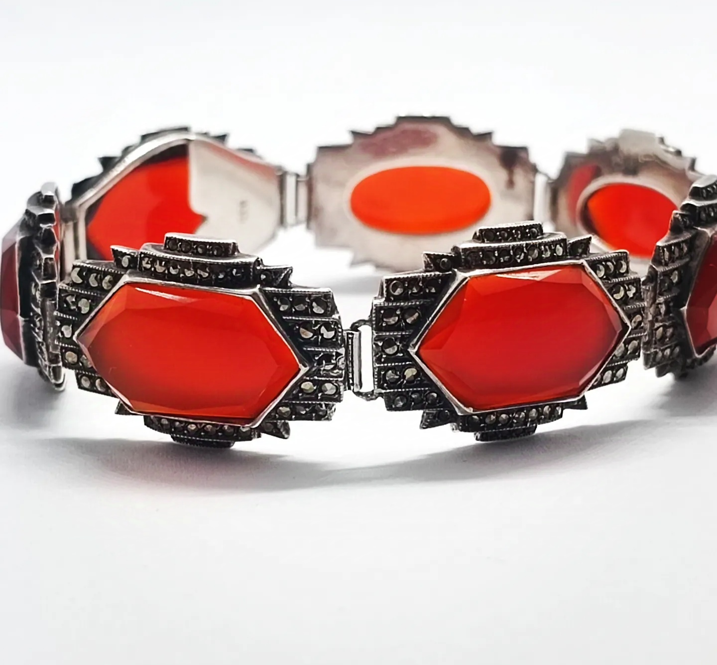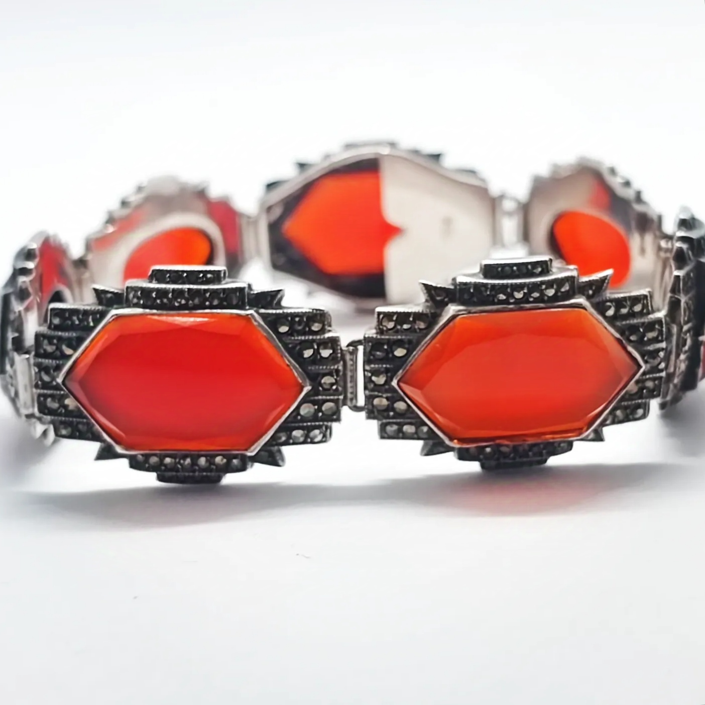 Stříbrný art deco náramek s broušenými karneoly a markazity, Ag btto 28,85g/935/1000, 30. léta 20. století, atest puncovního úřadu; délka 18 cm, šířka 1,7 cm