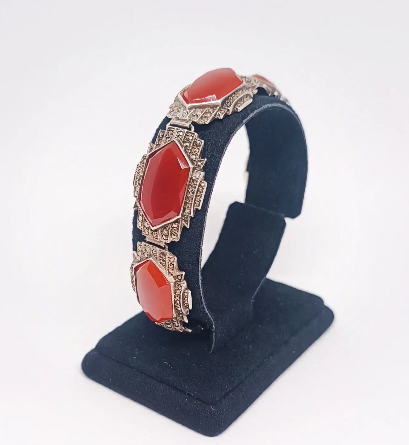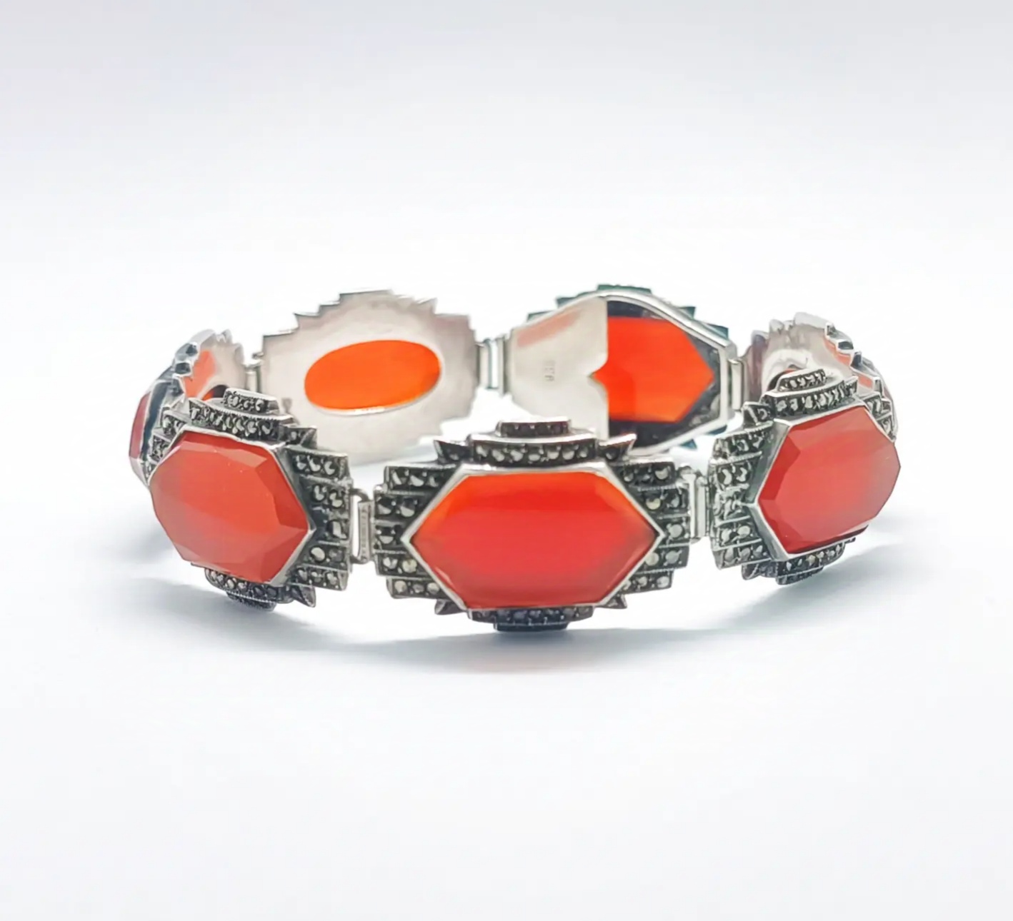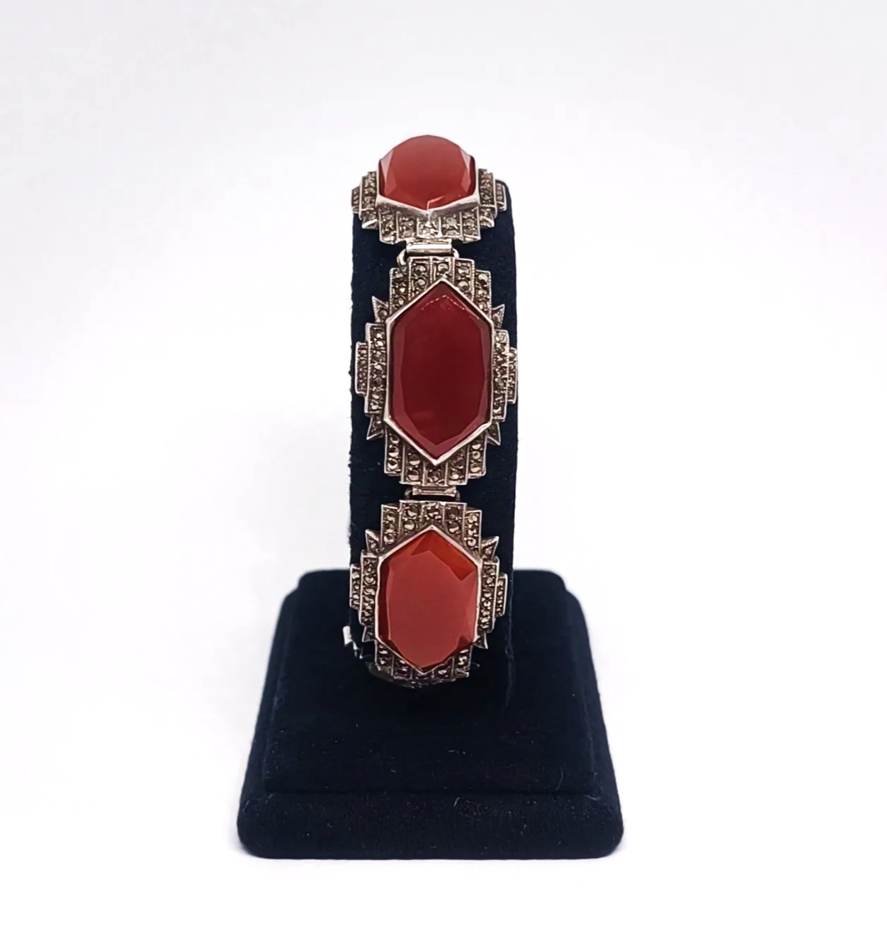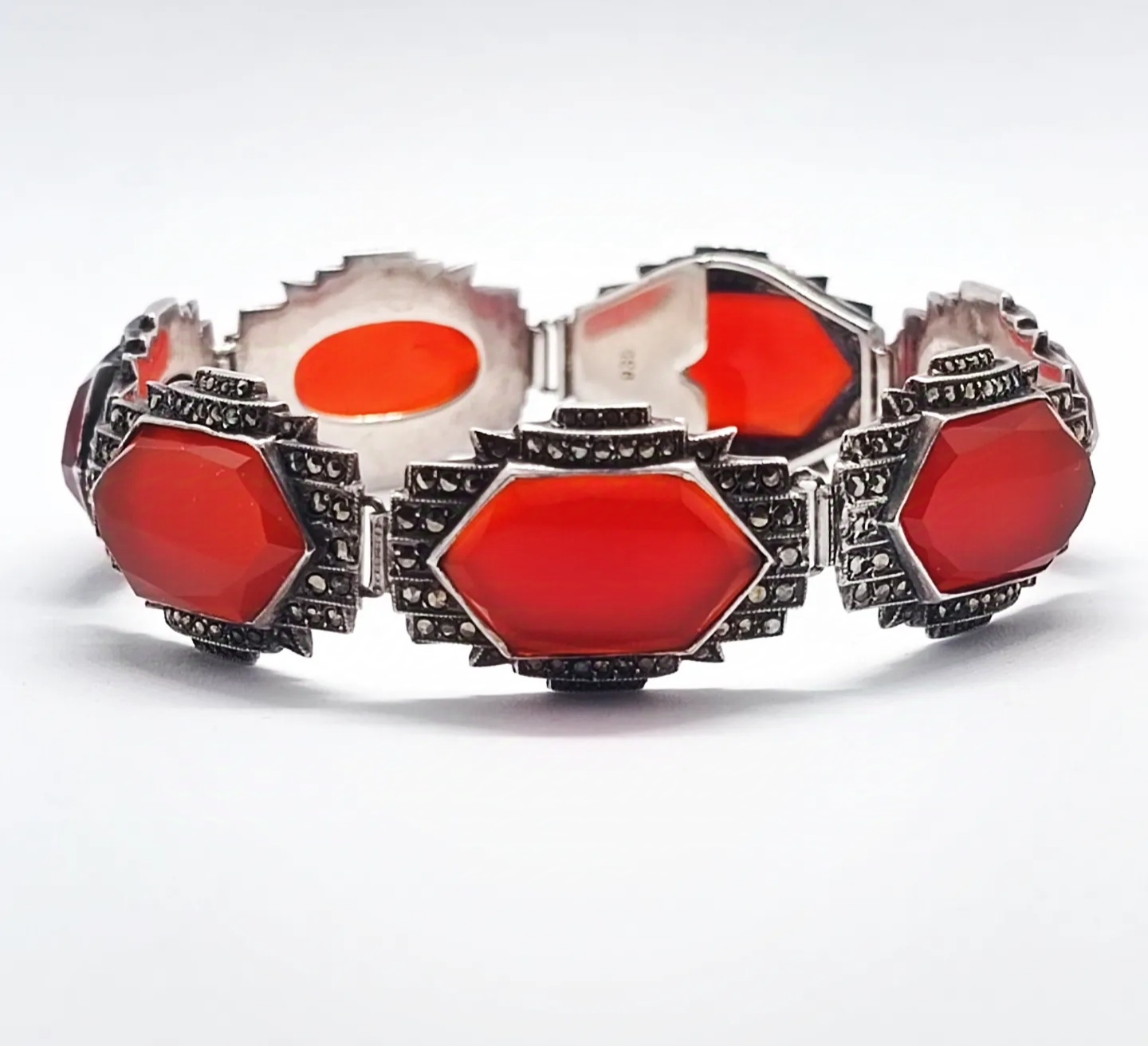 Stříbrný art deco náramek s broušenými karneoly a markazity, Ag btto 28,85g/935/1000, 30. léta 20. století, atest puncovního úřadu; délka 18 cm, šířka 1,7 cm