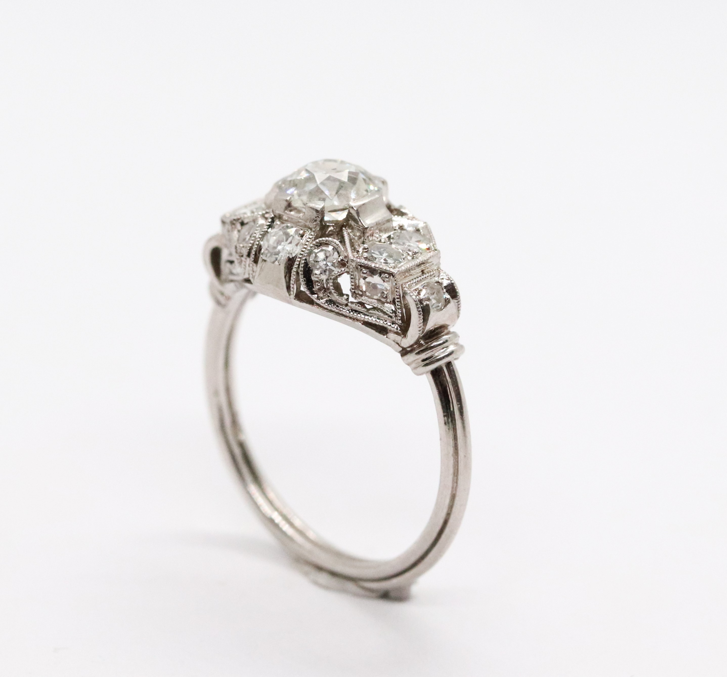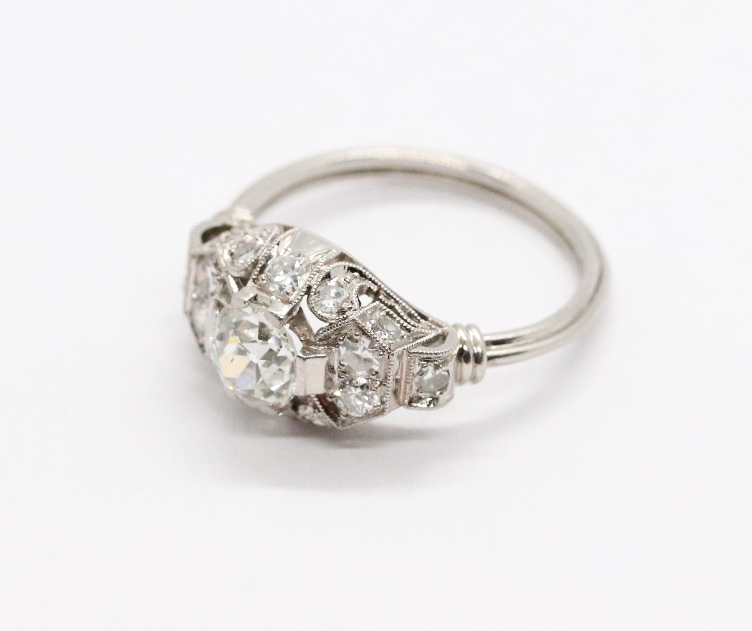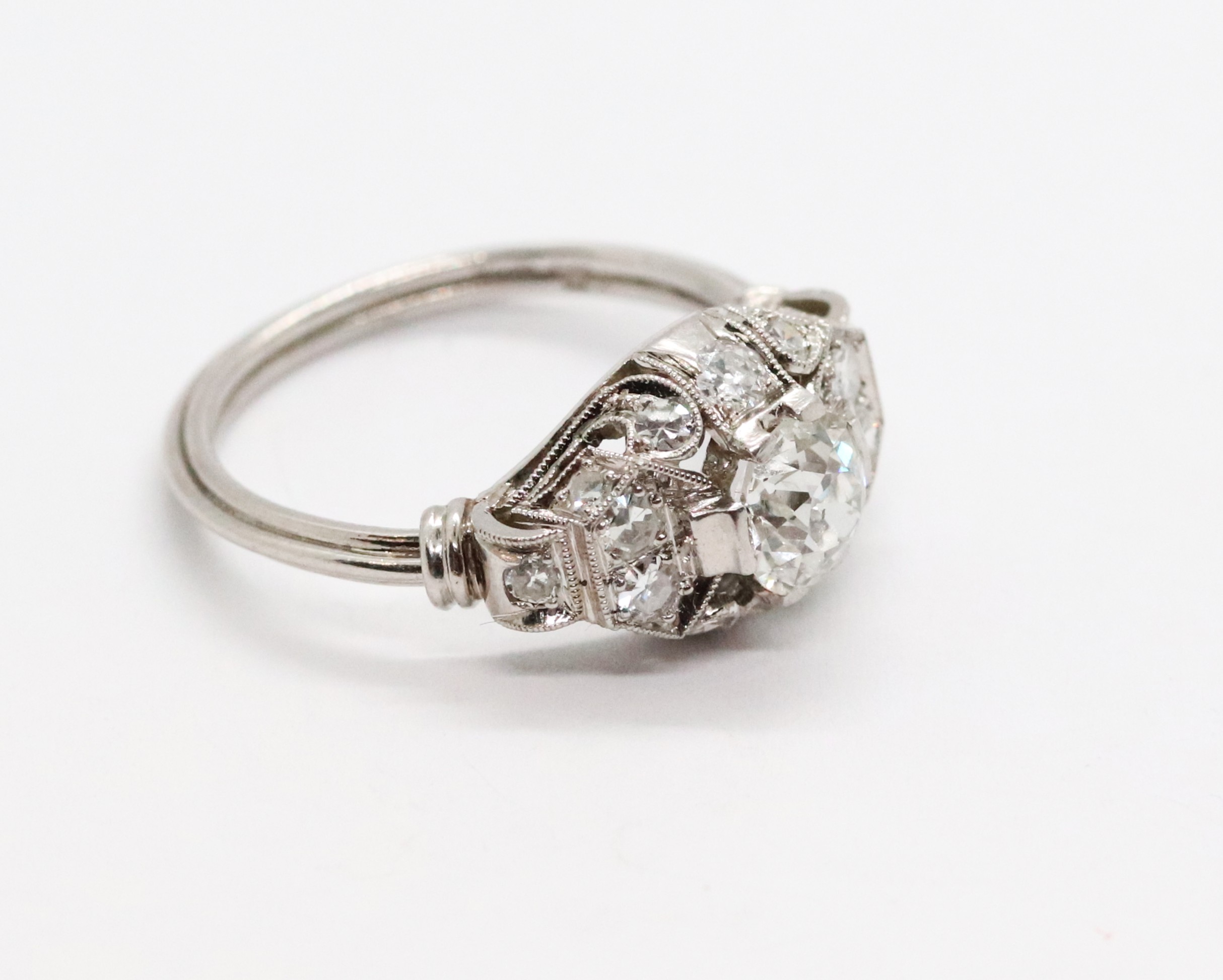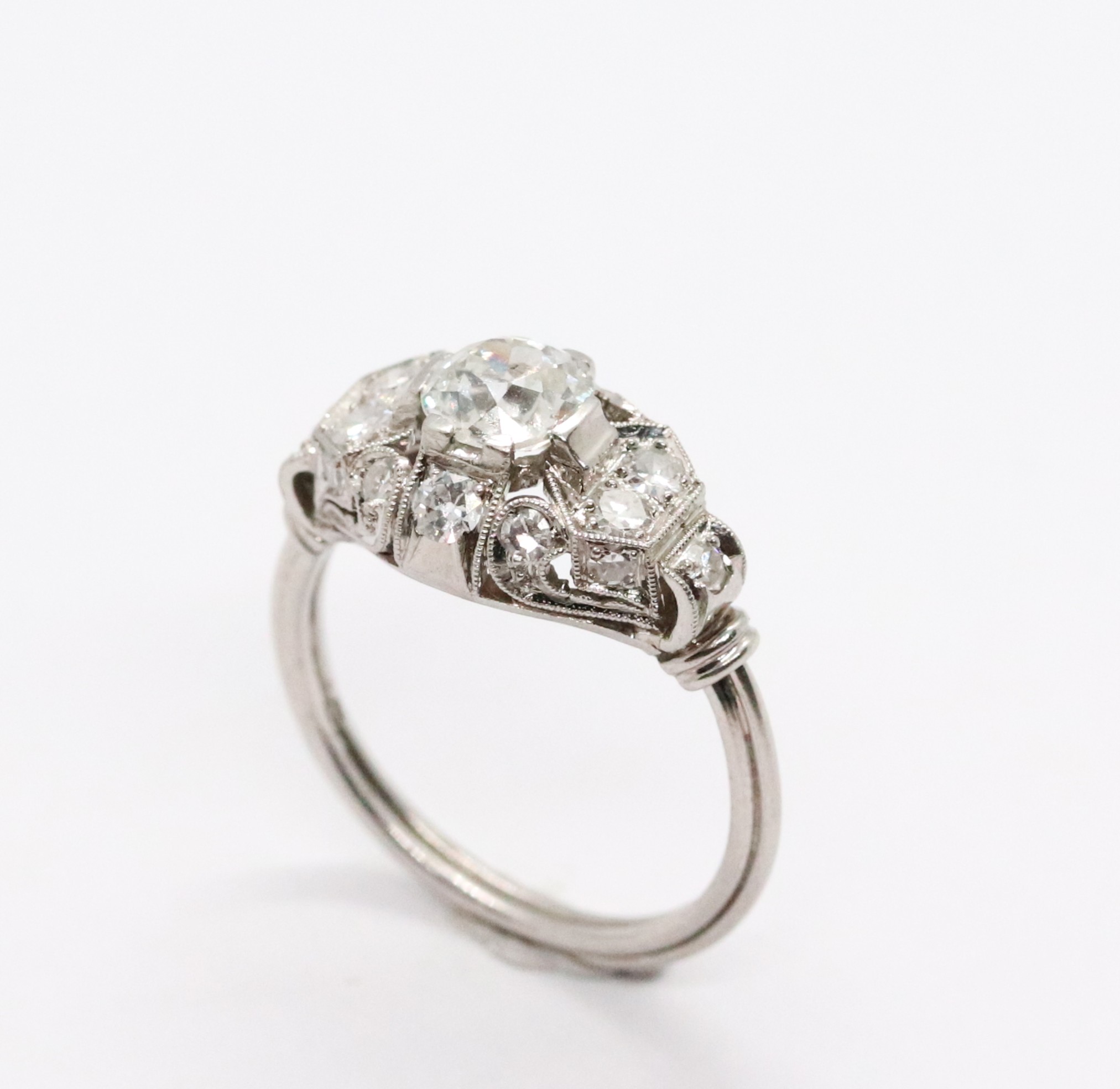 Art deco platinový prsten s diamanty starého kulatého brusu o celkové hmotnosti 1,39 ct, centrální 0,85 ct, Pt btto 4,91g/950/1000, 30. léta 20. století, certifikát evropské gemologické laboratoře; velikost prstenu 55