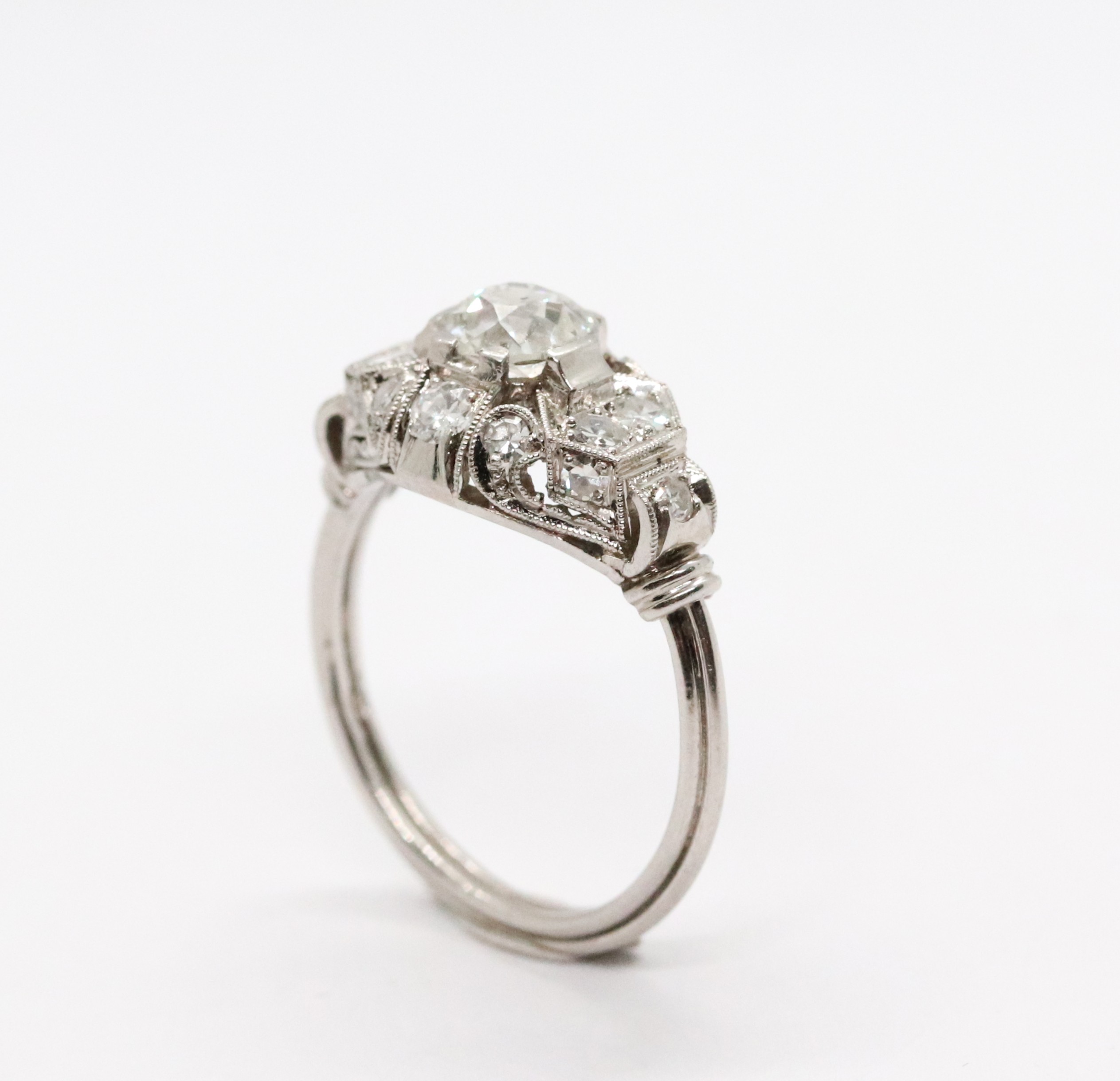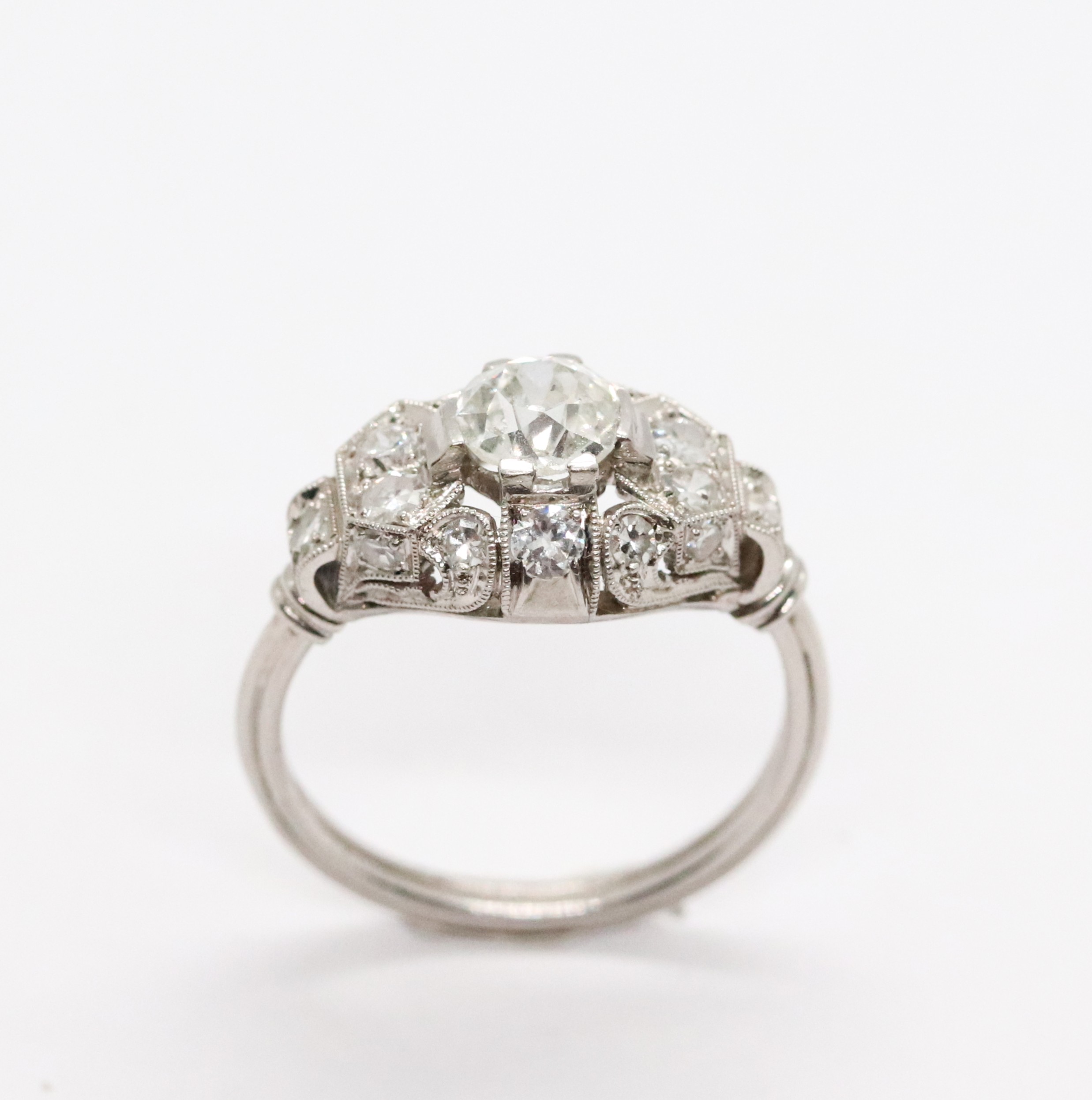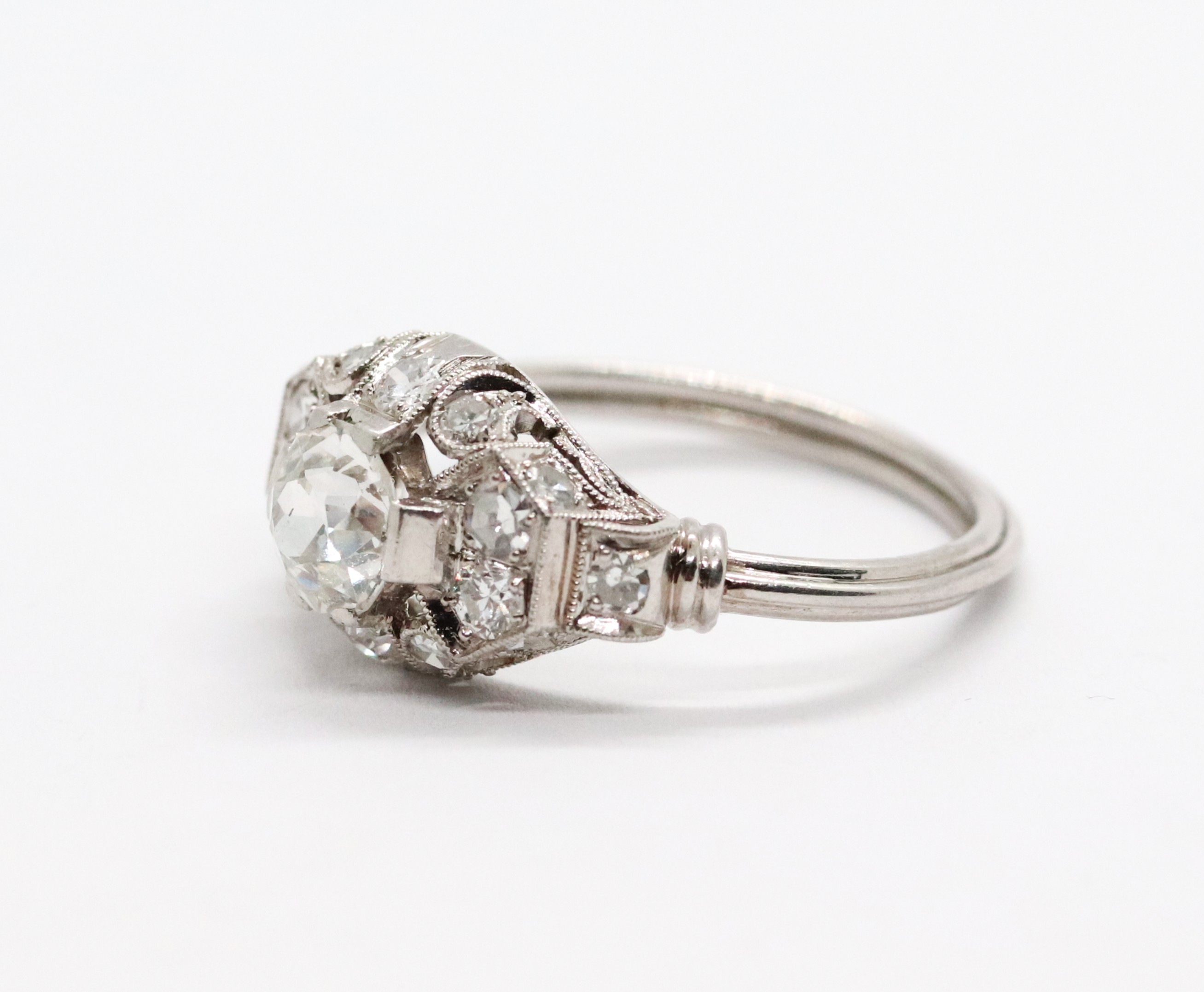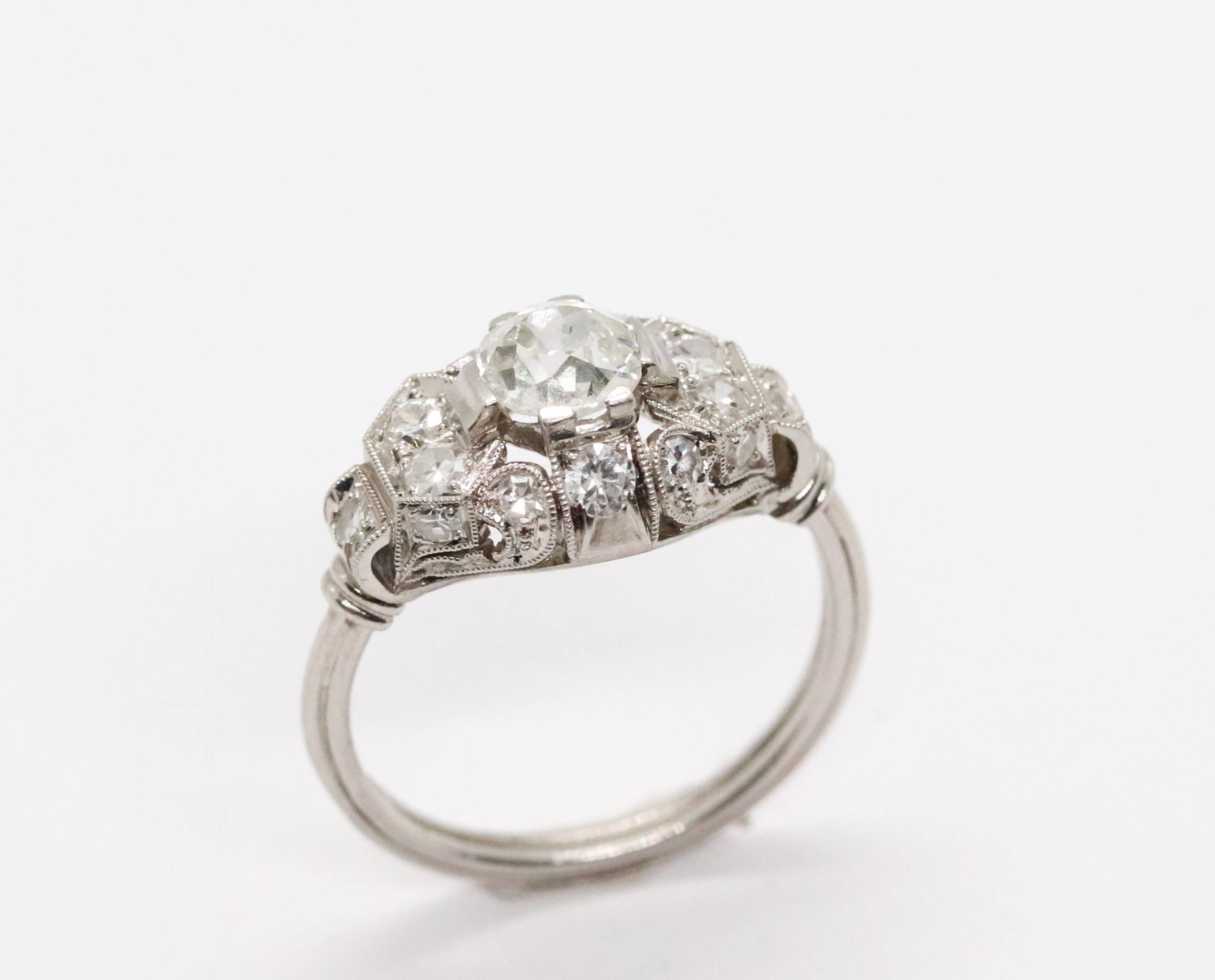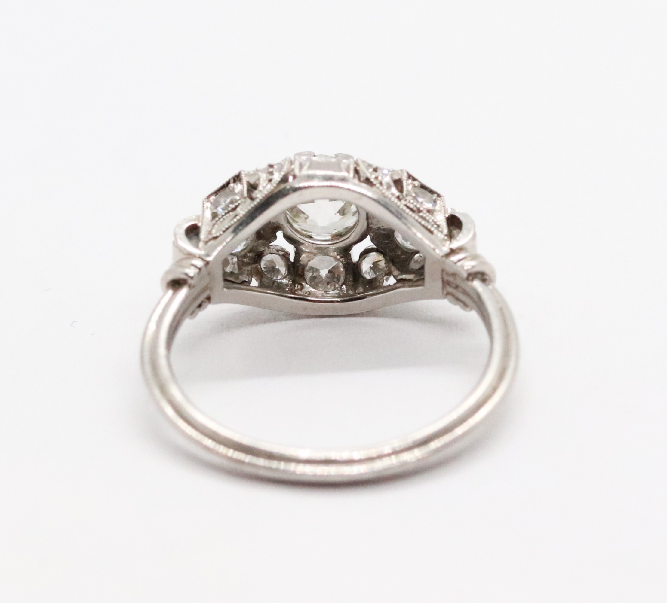 Art deco platinový prsten s diamanty starého kulatého brusu o celkové hmotnosti 1,39 ct, centrální 0,85 ct, Pt btto 4,91g/950/1000, 30. léta 20. století, certifikát evropské gemologické laboratoře; velikost prstenu 55