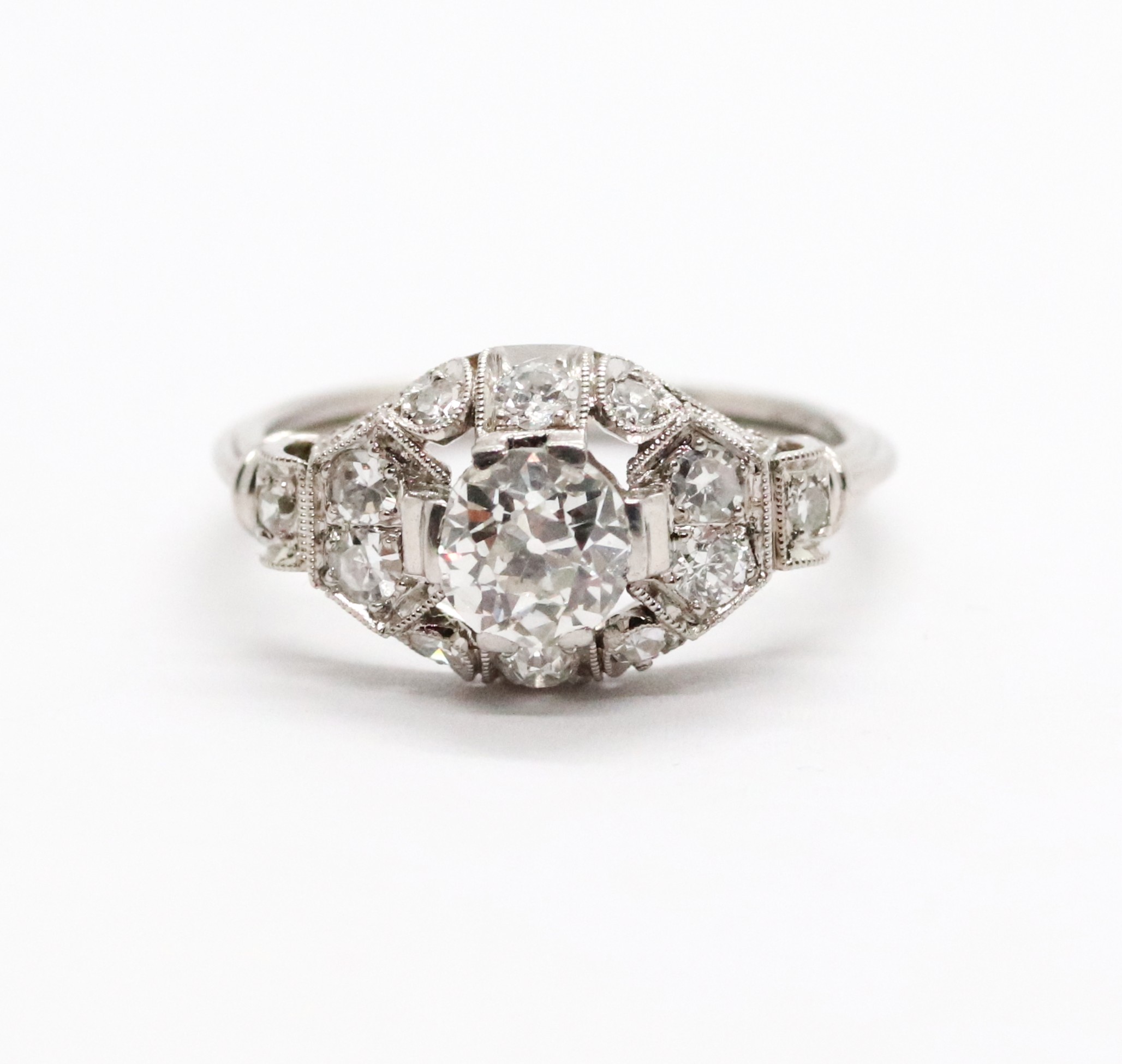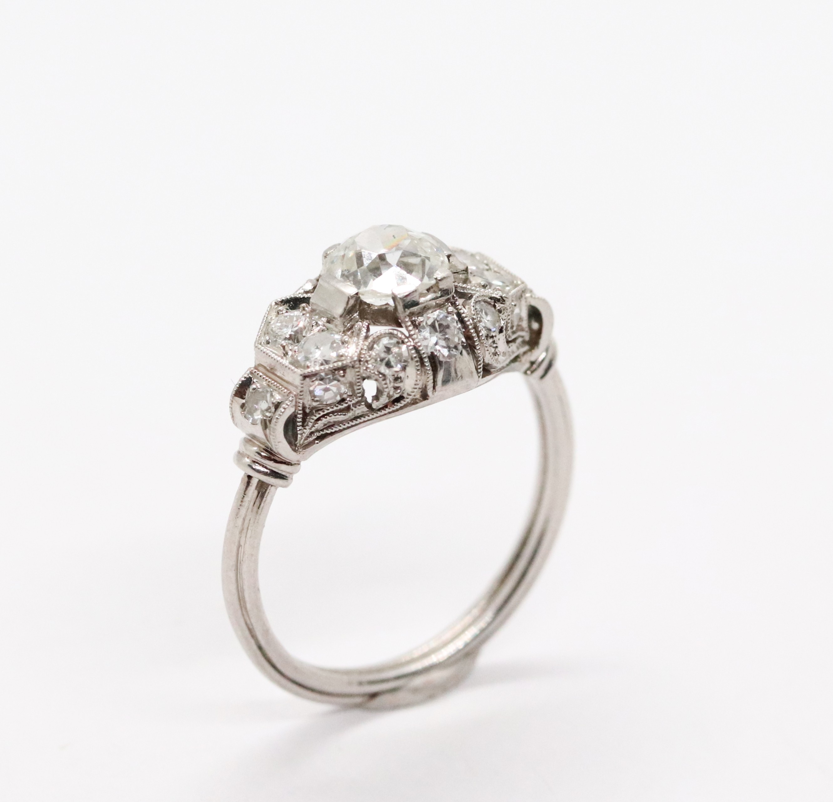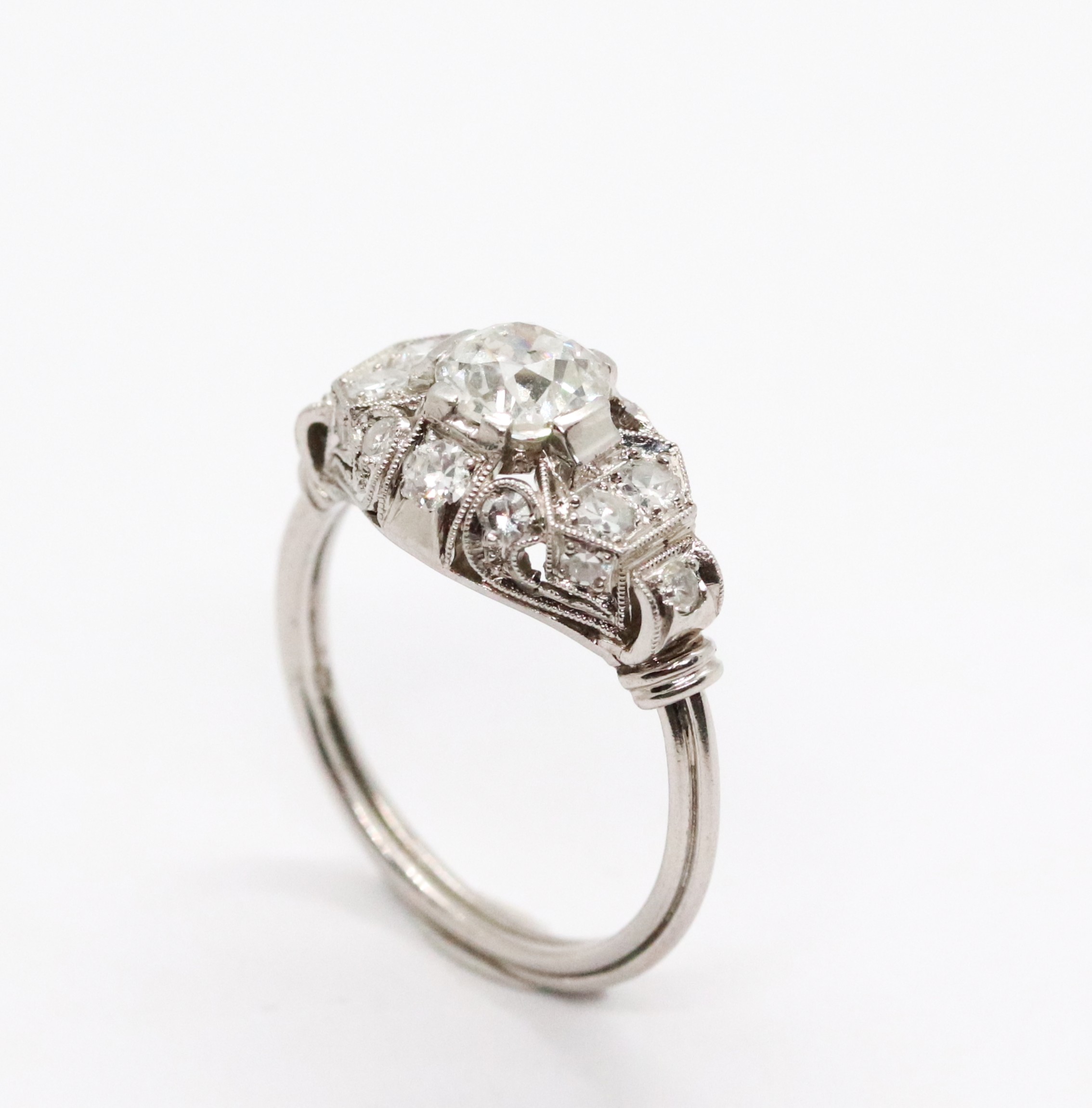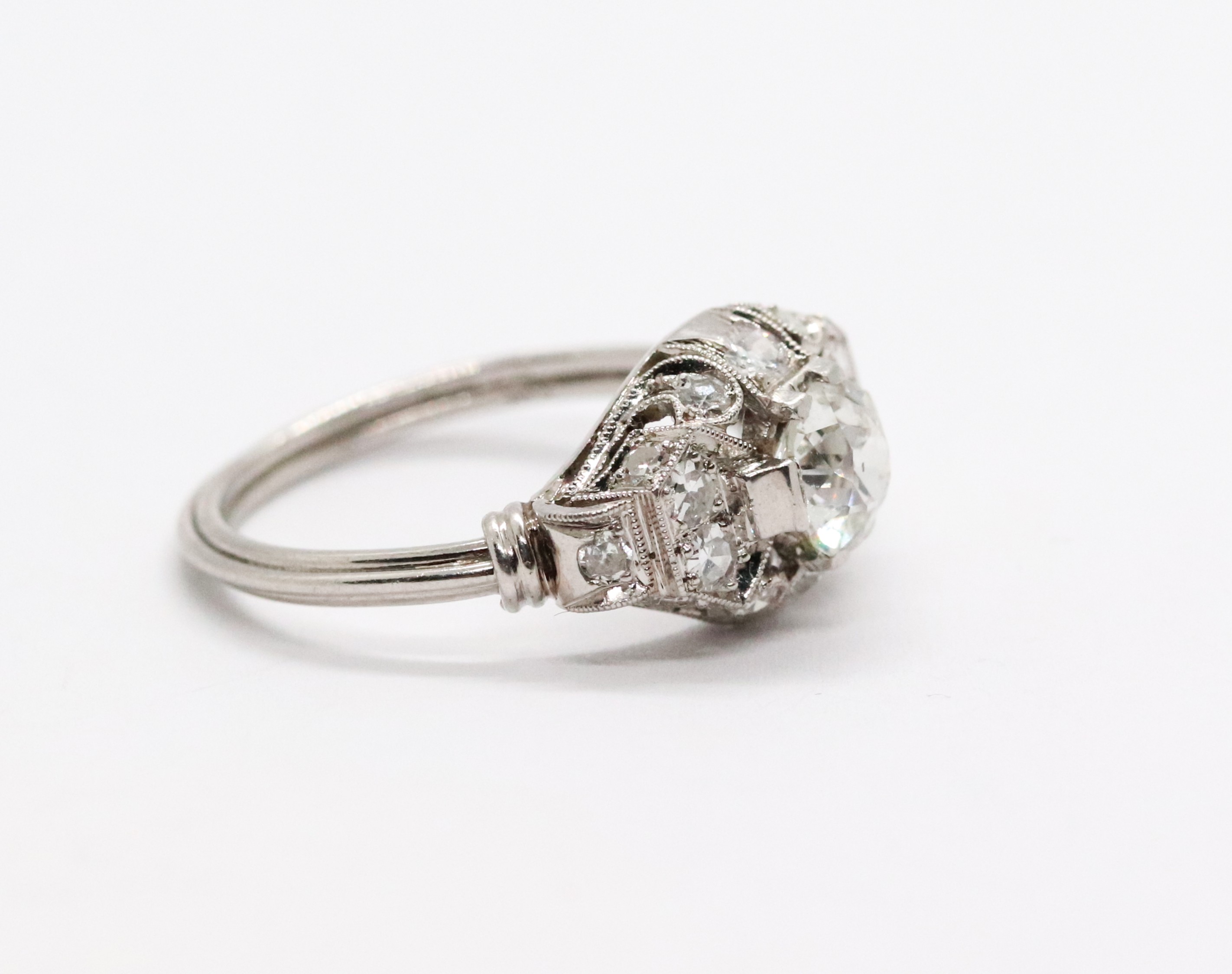 Art deco platinový prsten s diamanty starého kulatého brusu o celkové hmotnosti 1,39 ct, centrální 0,85 ct, Pt btto 4,91g/950/1000, 30. léta 20. století, certifikát evropské gemologické laboratoře; velikost prstenu 55