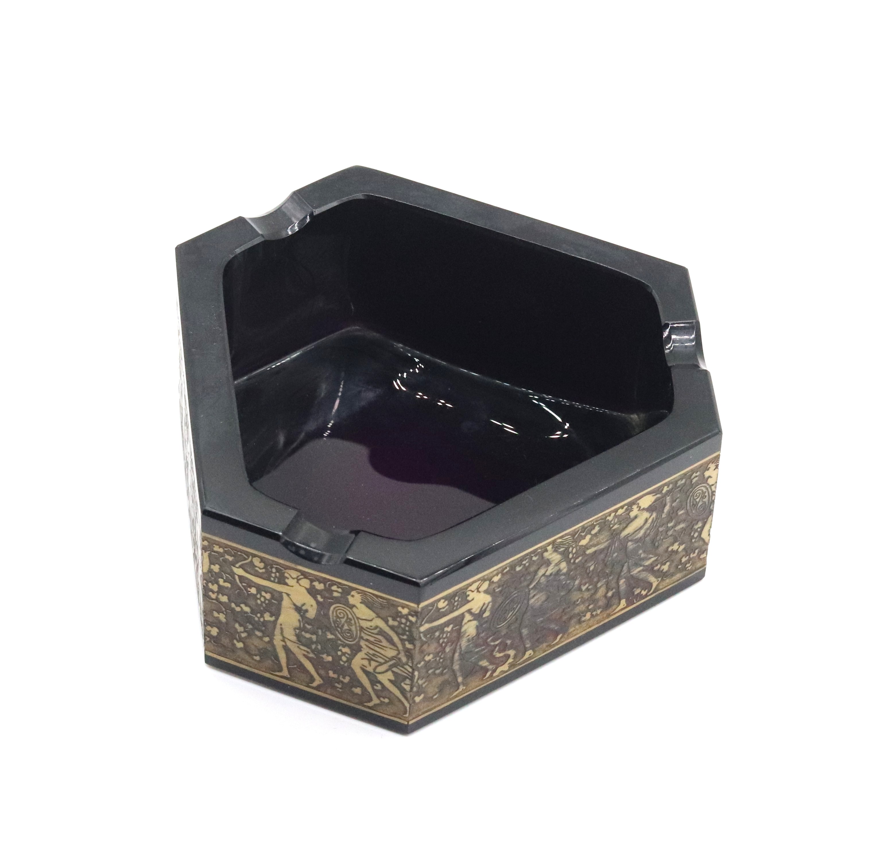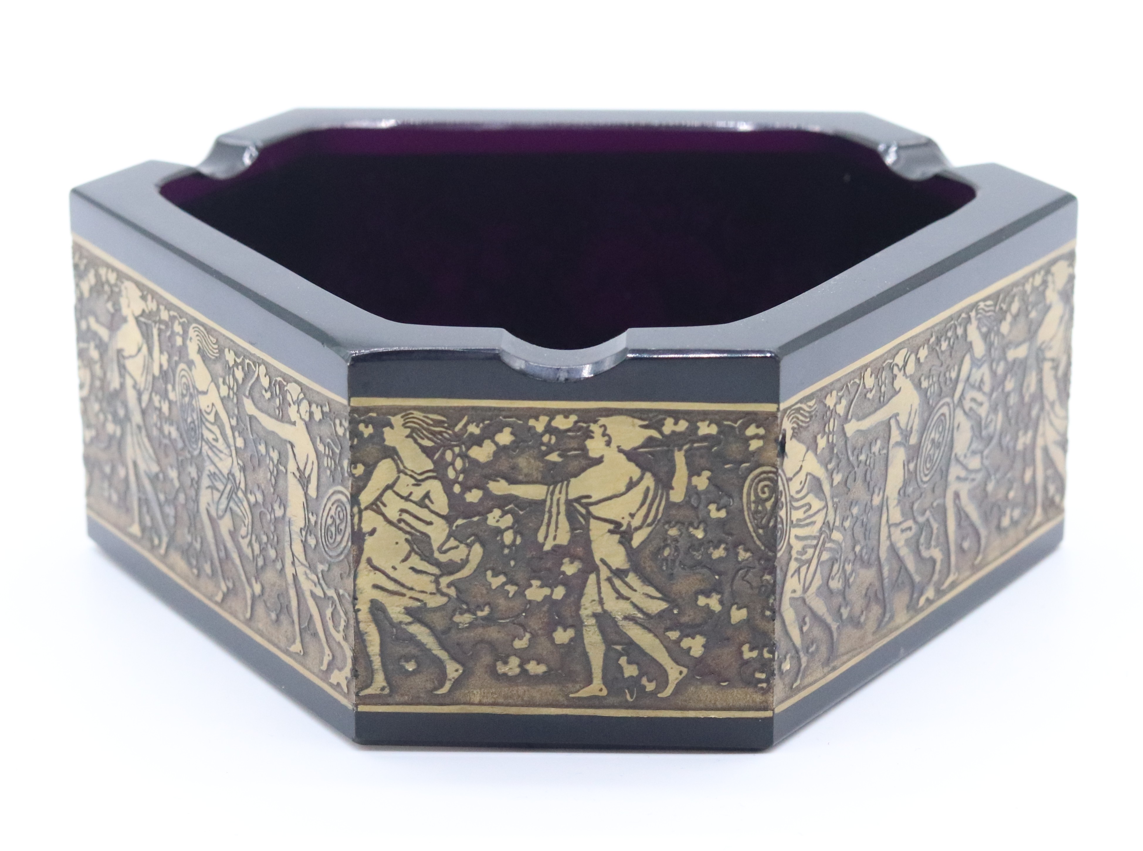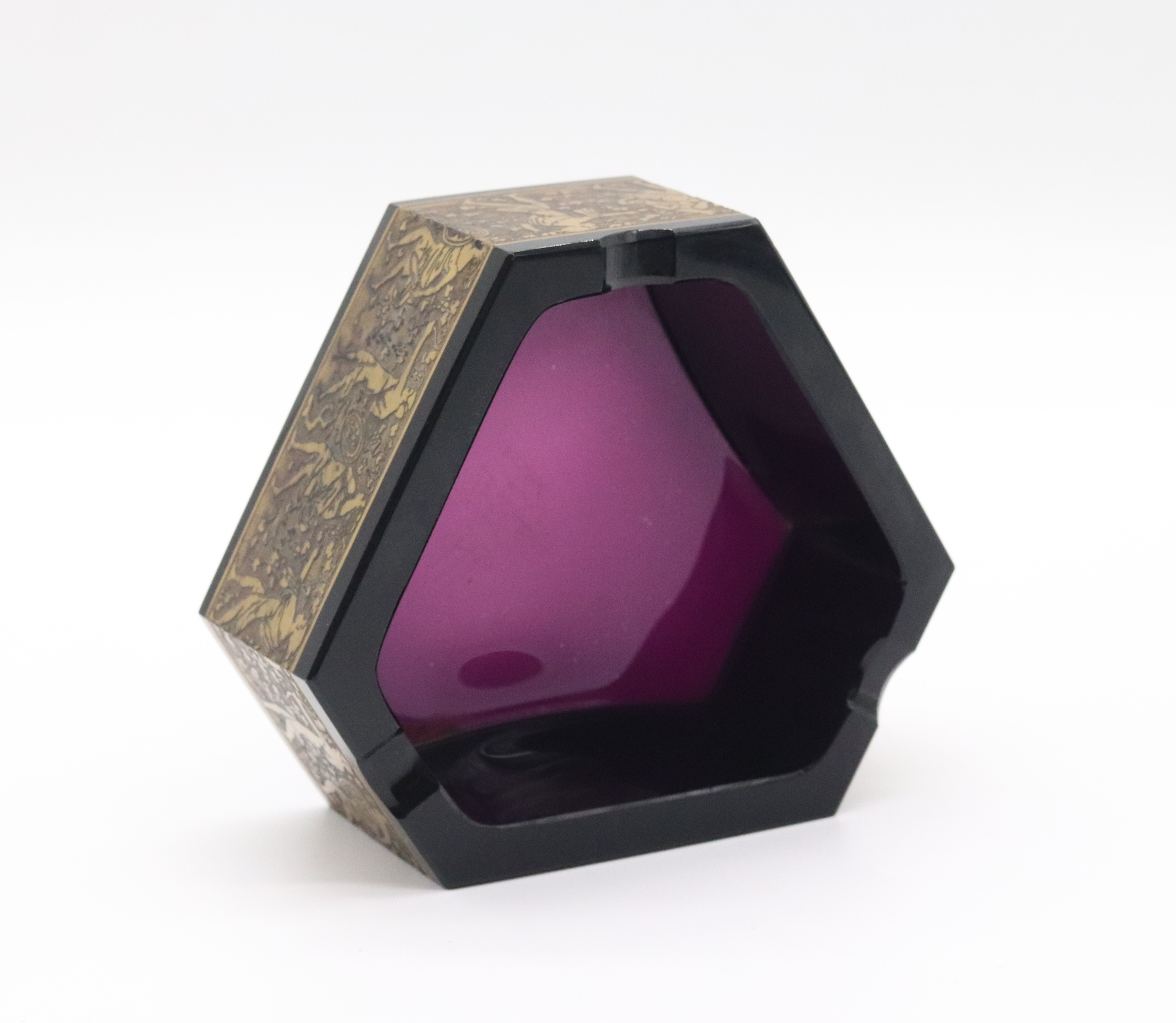 Art deco broušený popelník z fialového skla, zdobený oroplastikou, značeno na spodní straně Moser, Karlovy Vary, Československo, 30. léta 20. století; výška 5,8 cm, šířka 16 cm