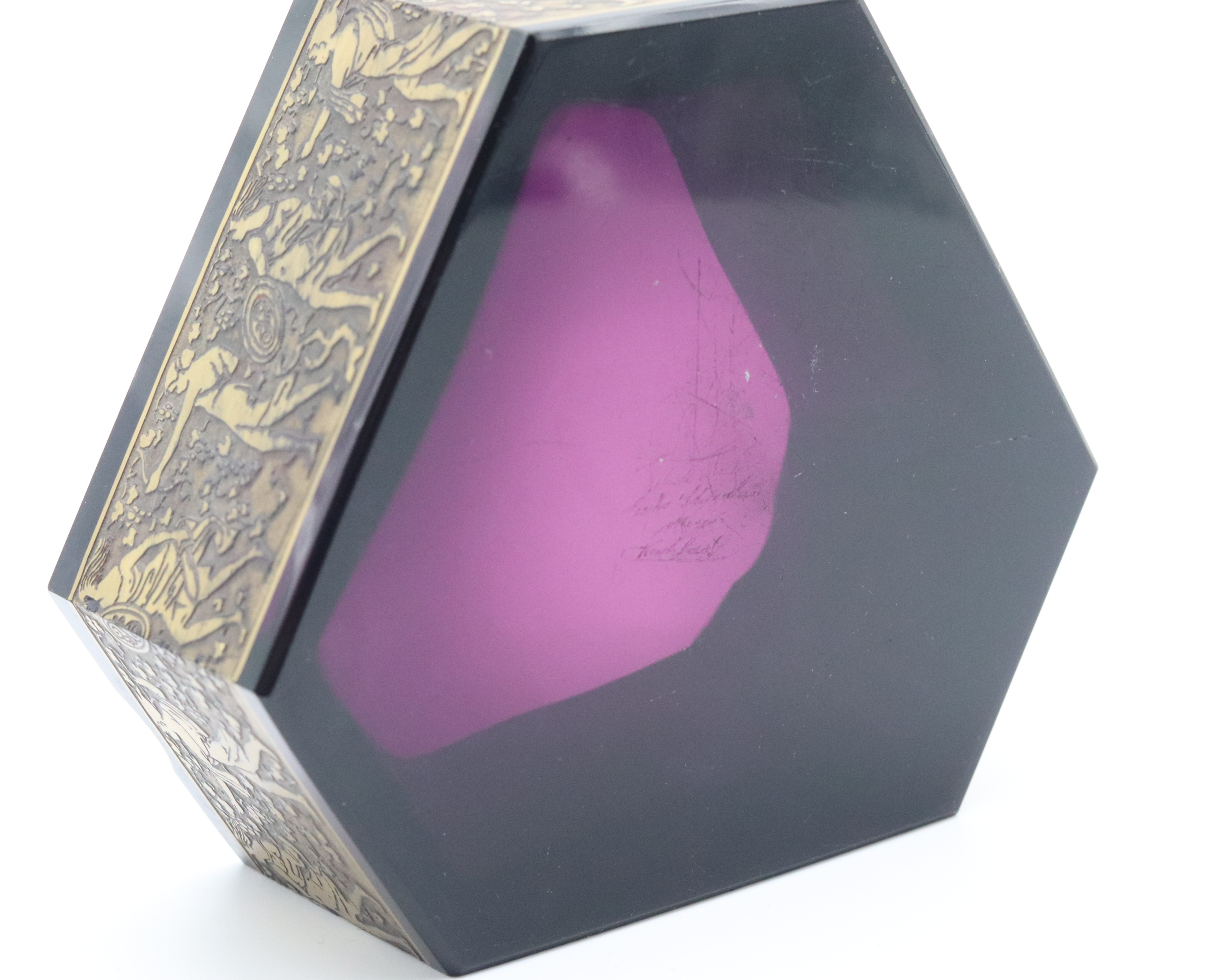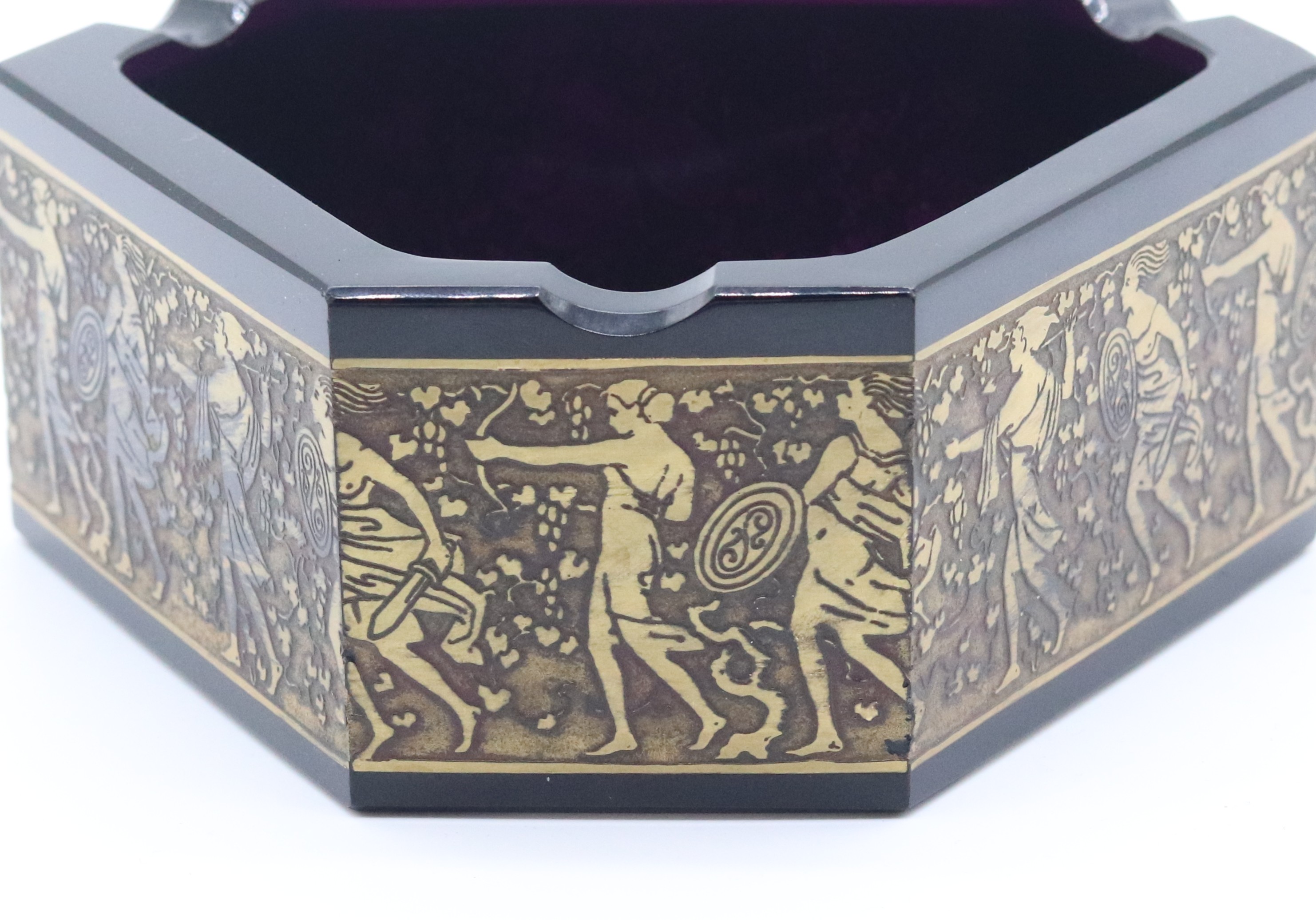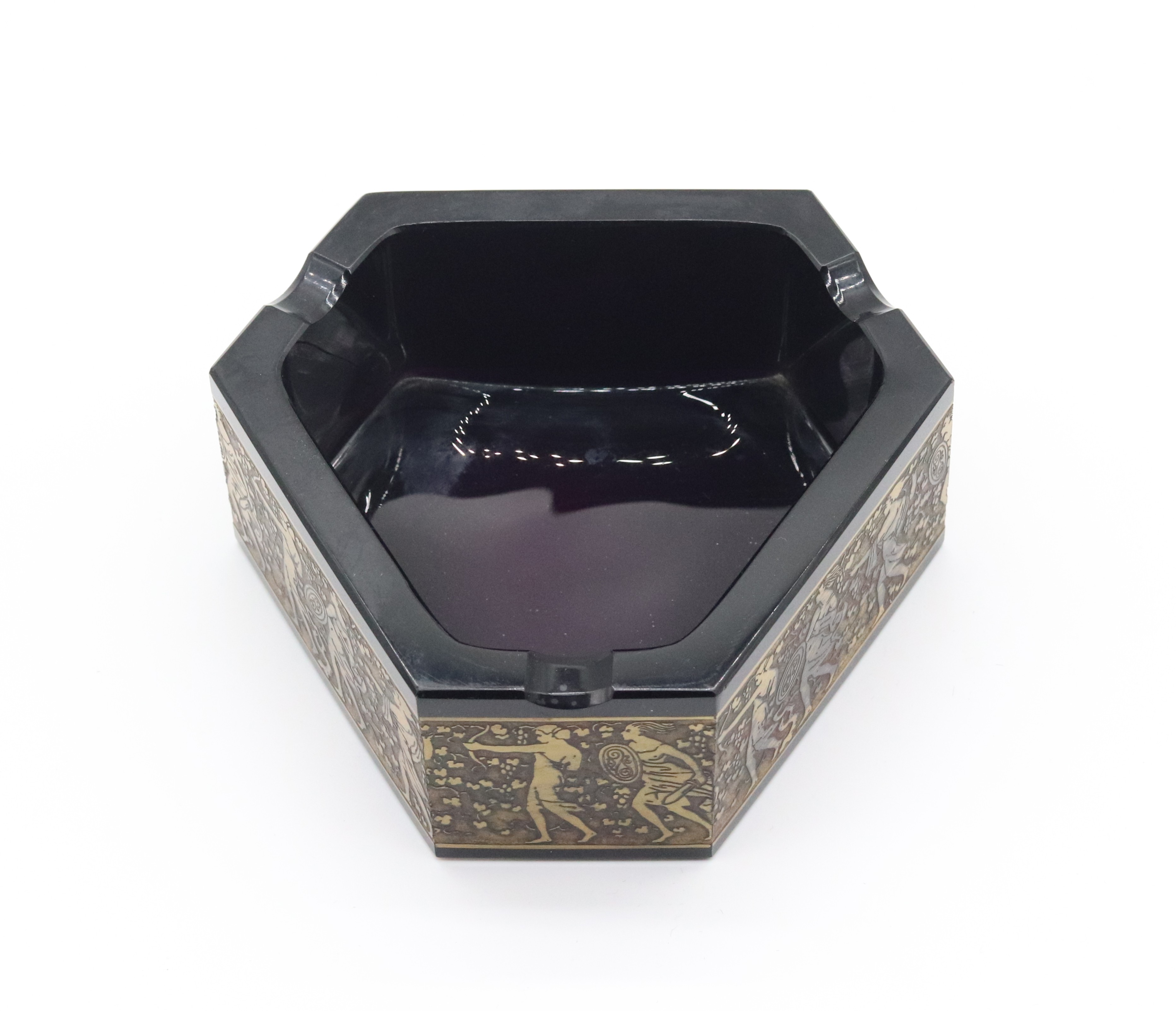Art deco broušený popelník z fialového skla, zdobený oroplastikou, značeno na spodní straně Moser, Karlovy Vary, Československo, 30. léta 20. století; výška 5,8 cm, šířka 16 cm