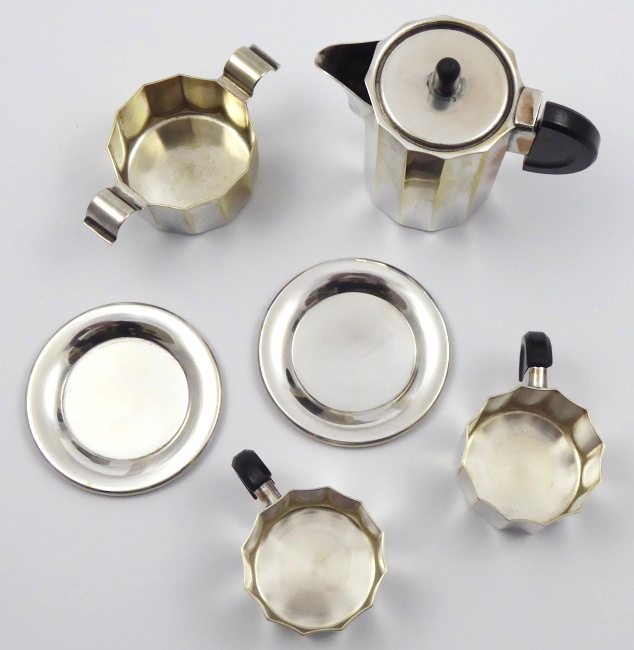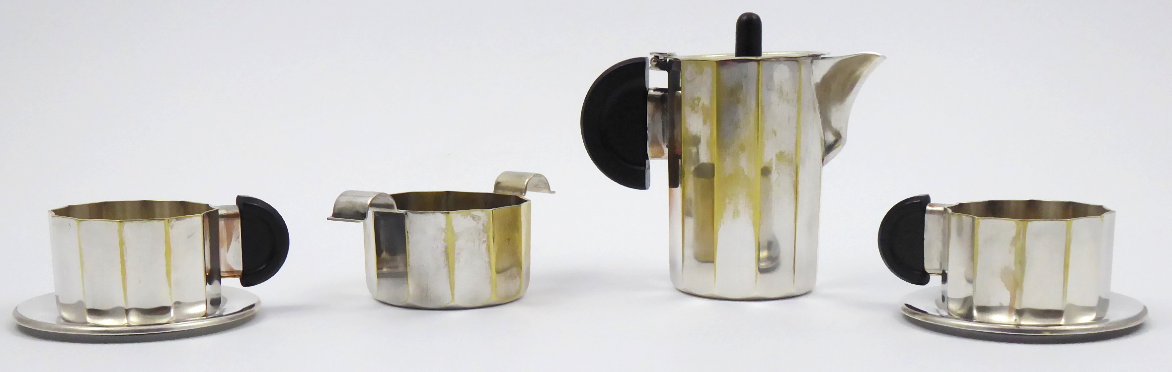 Postříbřená mosaz. Období a styl: art deco. Celková hmotnost 434 g. Postříbřený set pro dvě osoby sestávající se ze dvou šálků s podšálky, cukřenky a konvičky. Zdobená ve stylu art deco svislými kanelurami, půlkulatými bočními úchyty z černě mořeného dřeva. Střední Evropa 1925 – 1935. Výška konvičky 10 cm, průměr cukřenky 6 cm, výška šálků 3,5 cm, průměr podšálků 8 cm.