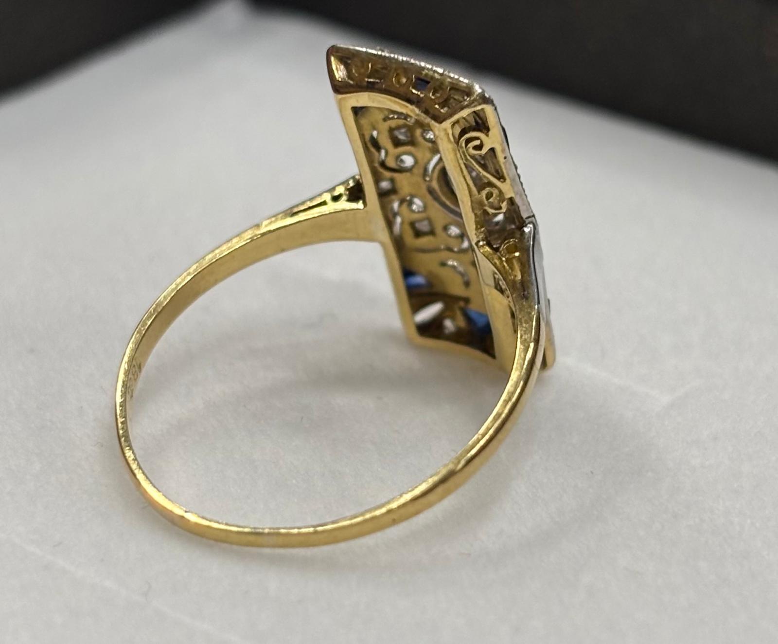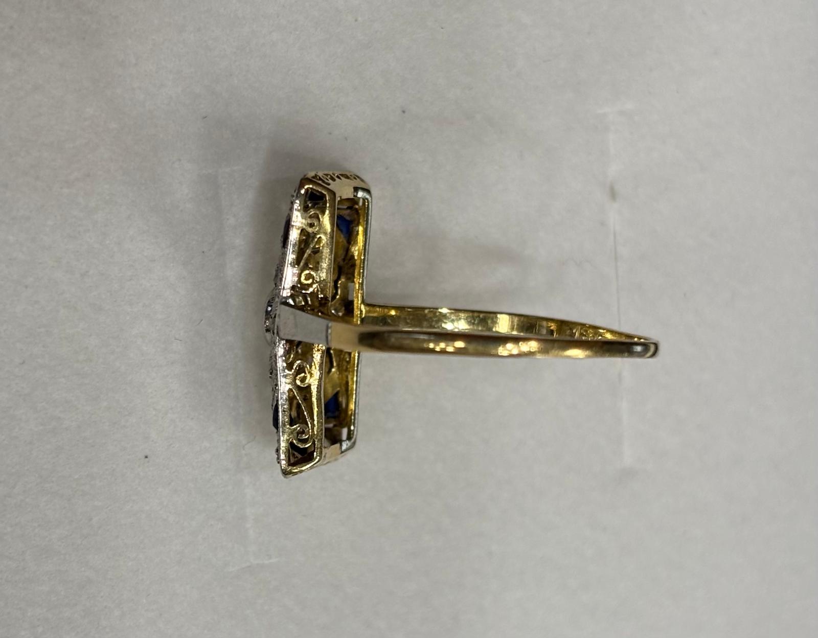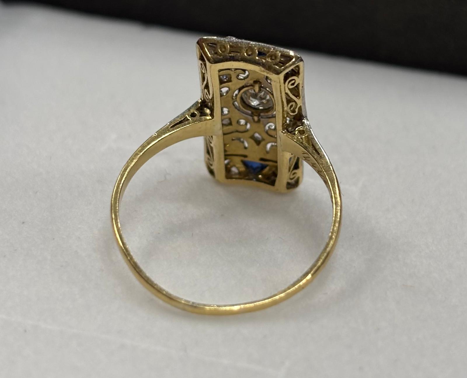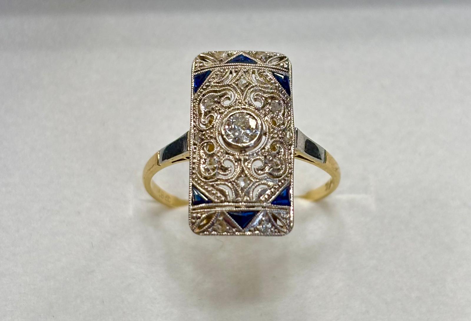 Zlatý prsten osazený briliantem 0,15 ct + routy a safíry. Krásná stará práce. Váha 2,93 g / 585. Velikost prstenu č. 58,5.