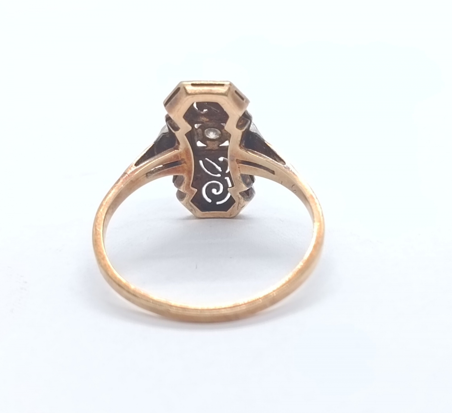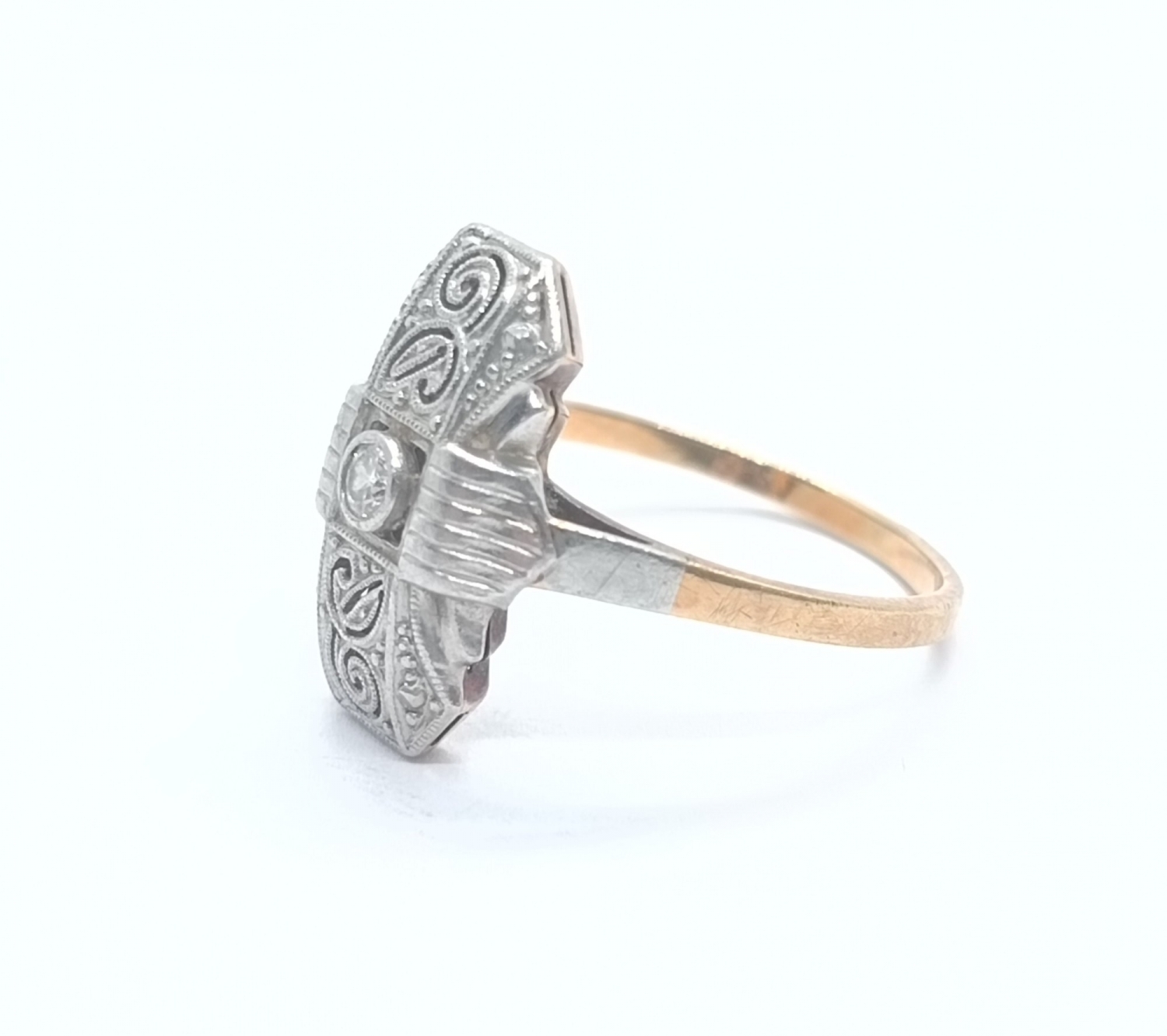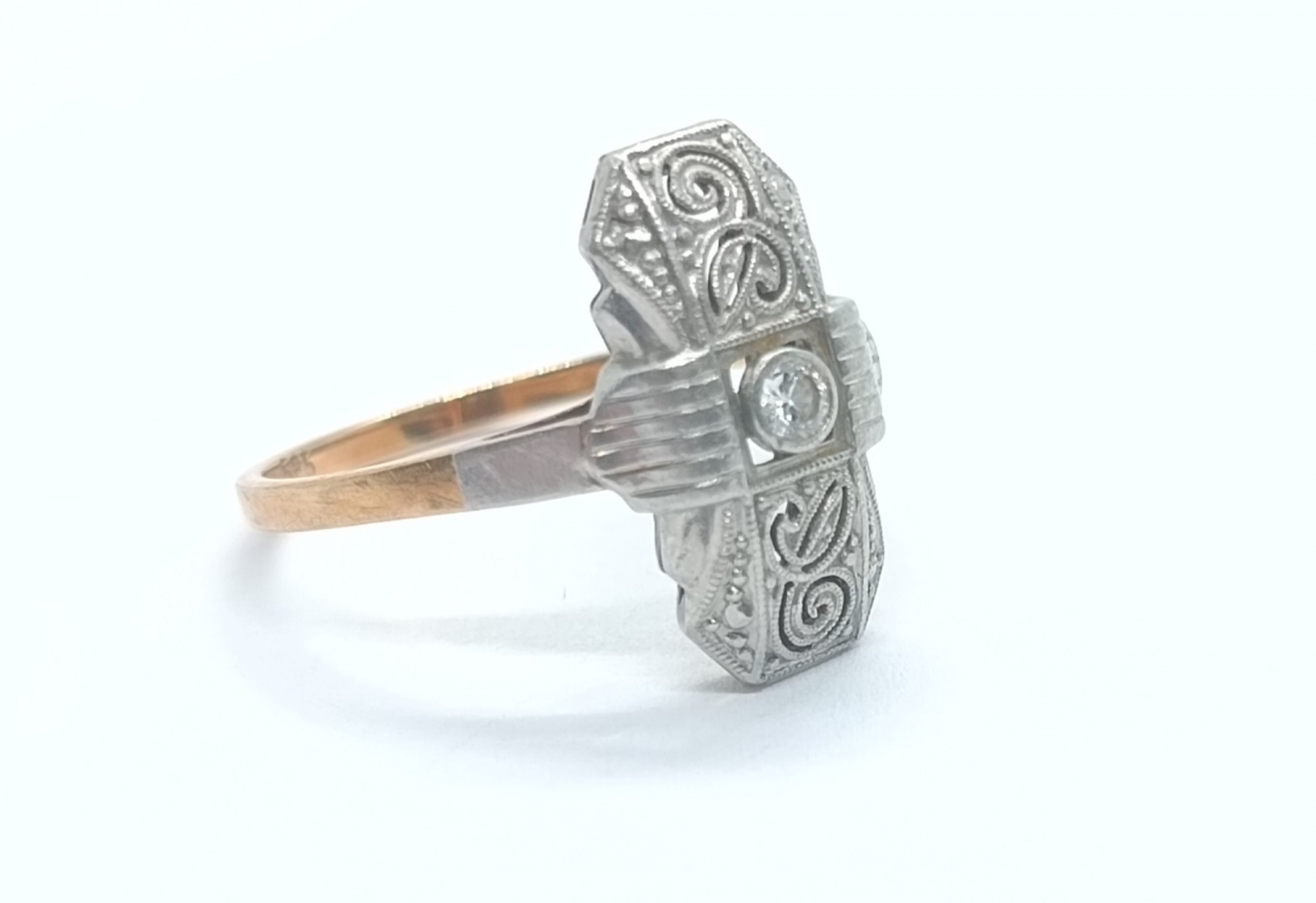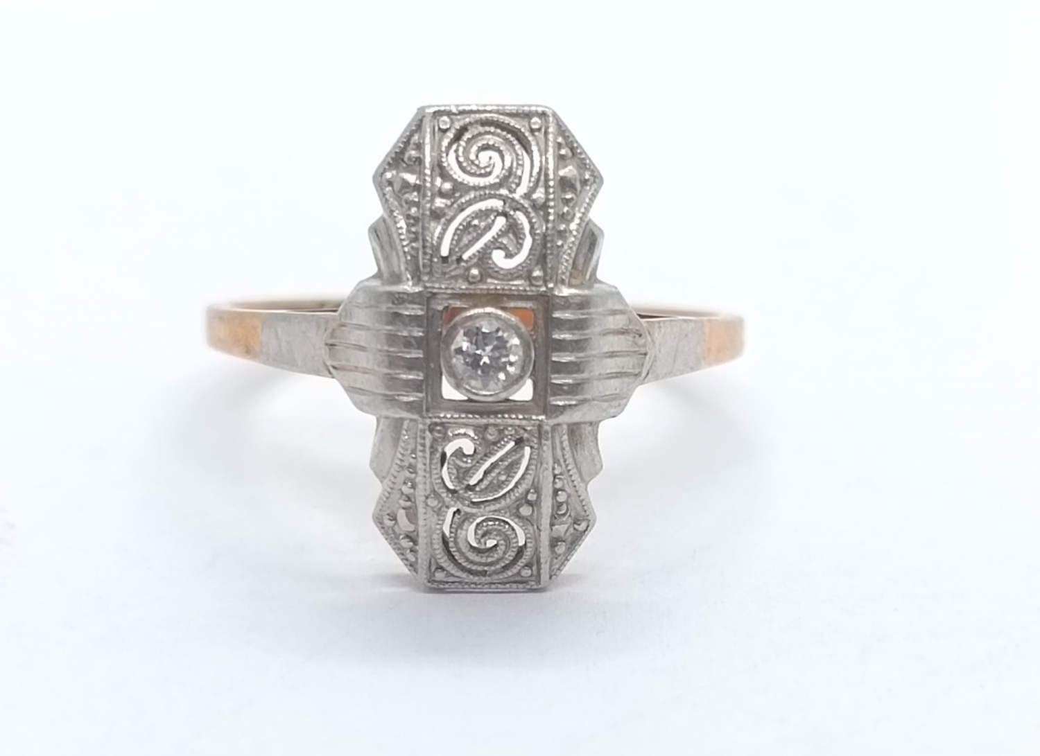 Art deco zlatý prsten s jedním drobnějším diamantem briliantového brusu o hmotnosti 0,09 ct, Au btto 2,45g/585/1000, atest Puncovního úřadu; velikost prstenu 55,5, délka hlavy prstenu 1,7 cm, šířka 0,8 cm