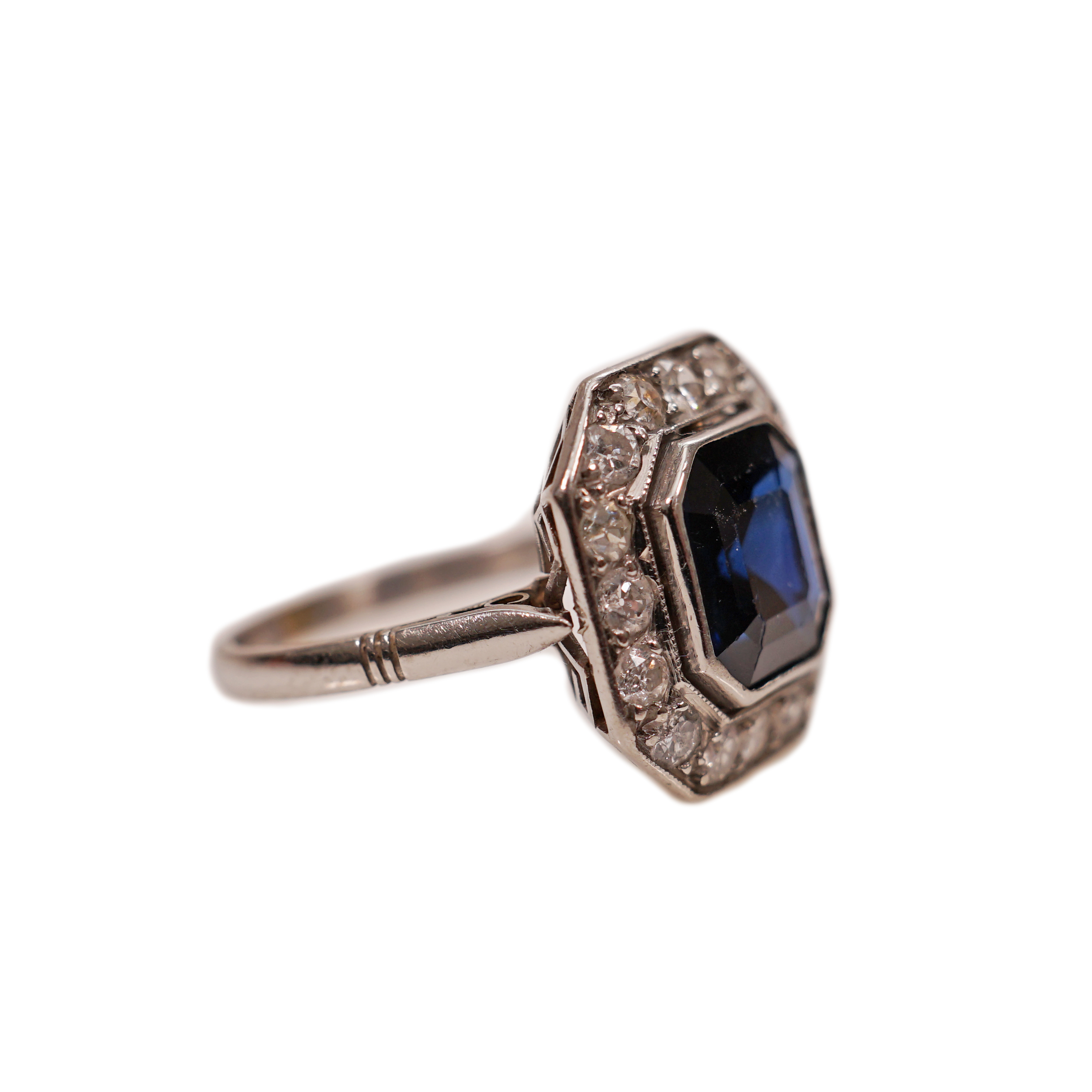 Starý Art Deco prsten vyrobený z platiny. Kombinace přírodní safír a brilianty. Safír 2,50 ct, brilianty 16 ks v součtu 0,56 ct.