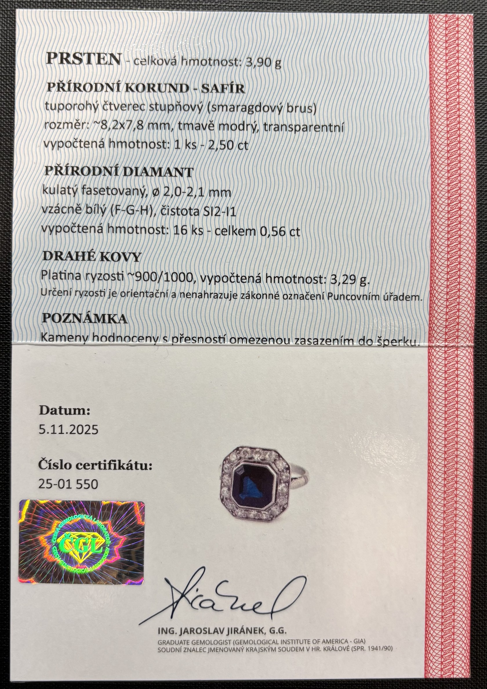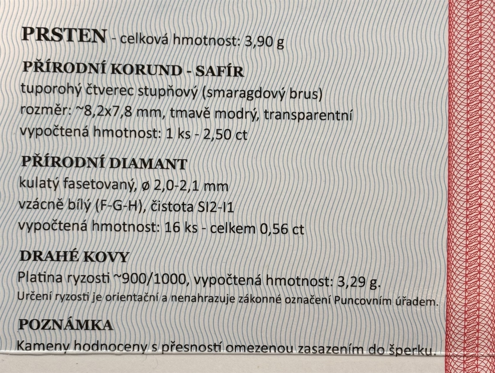 Váha 3,90 g / 900 / 1000. Vyhotoven certifikát pravosti kamenů.