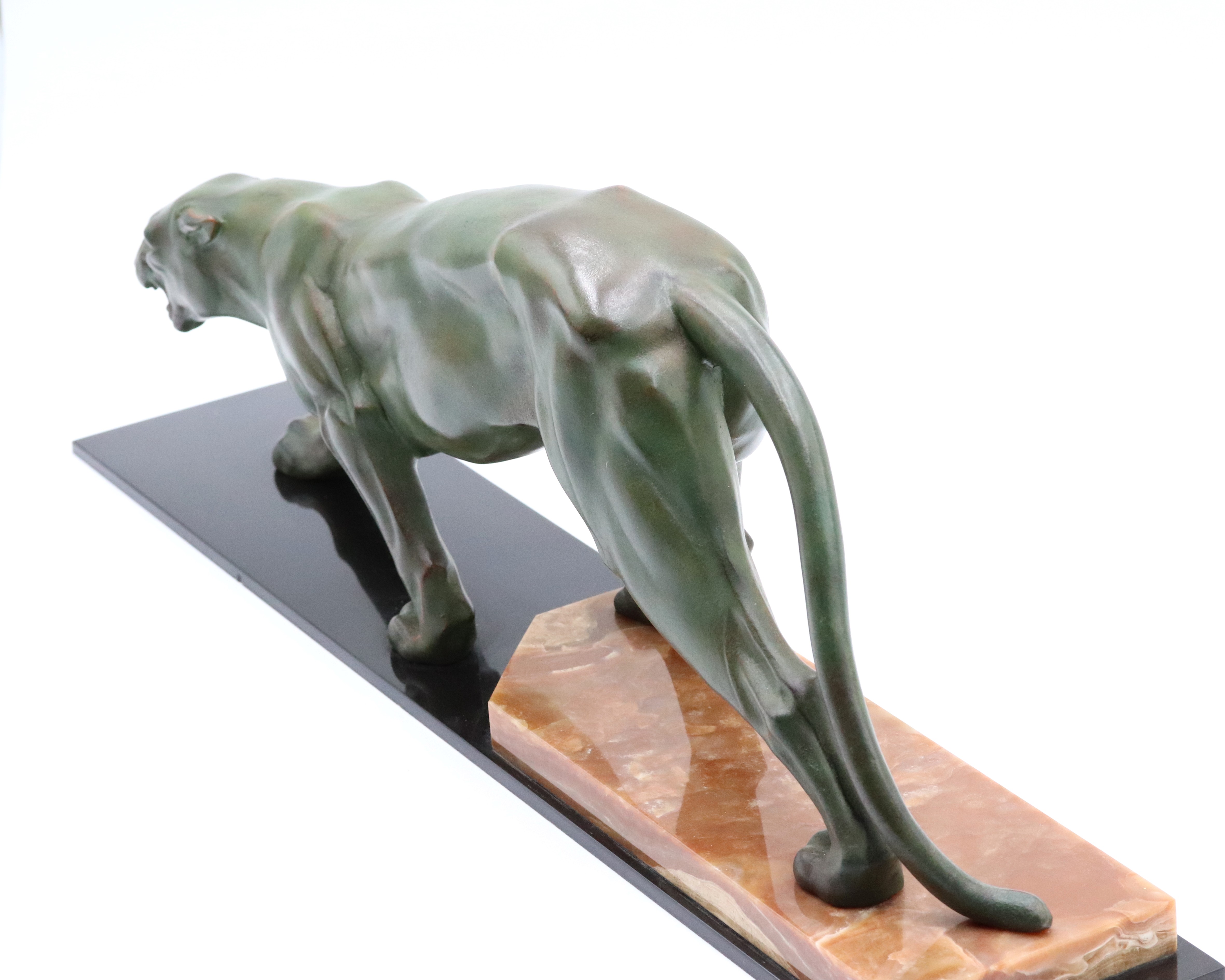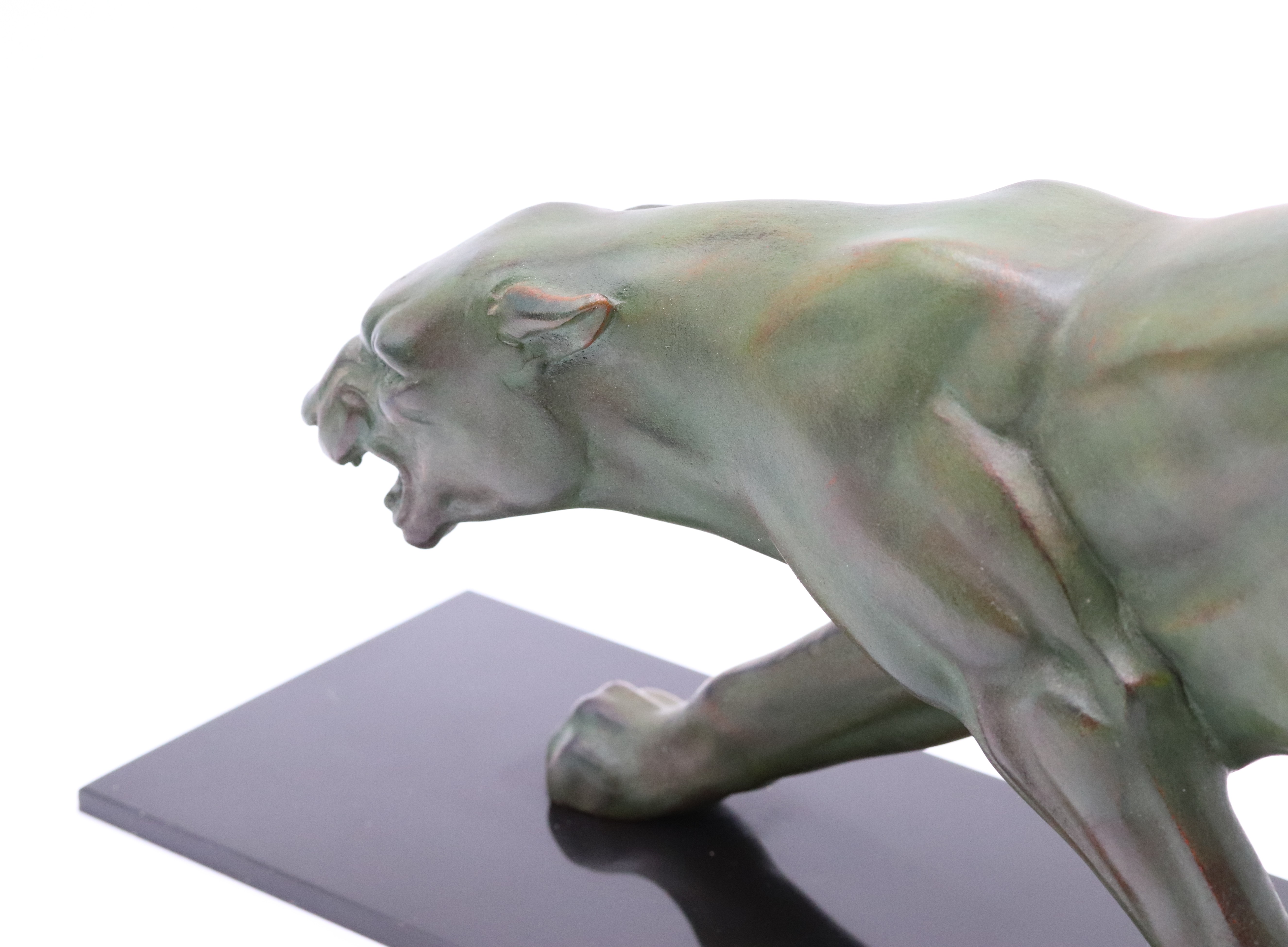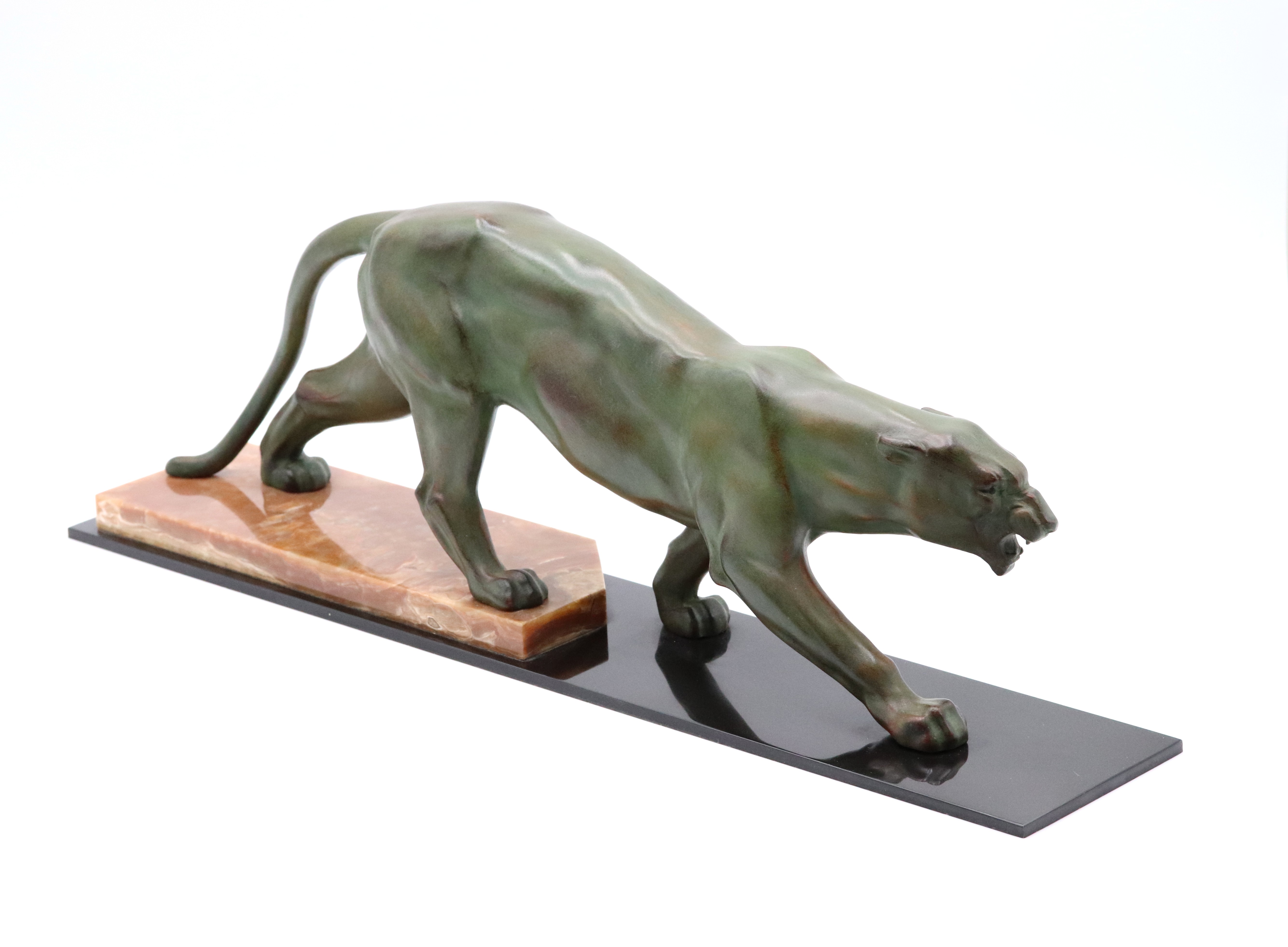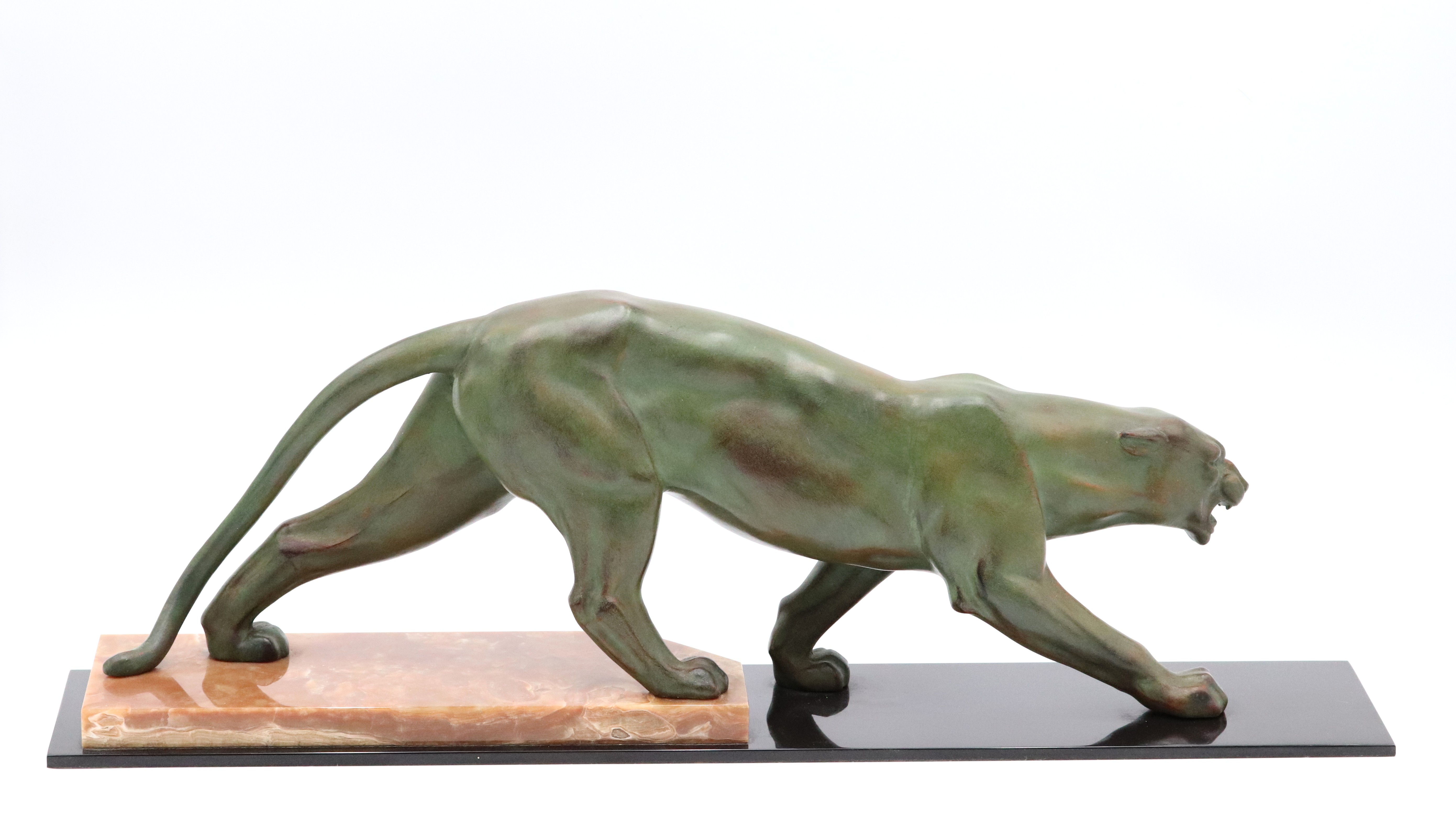 Art deco socha pantera, kovová patinovaná kompozice, podstavec mramorový na černé, opaxitové desce, Francie, 20. – 30. léta 20. století; délka 64 cm, šířka 12,5 cm, výška 22 cm