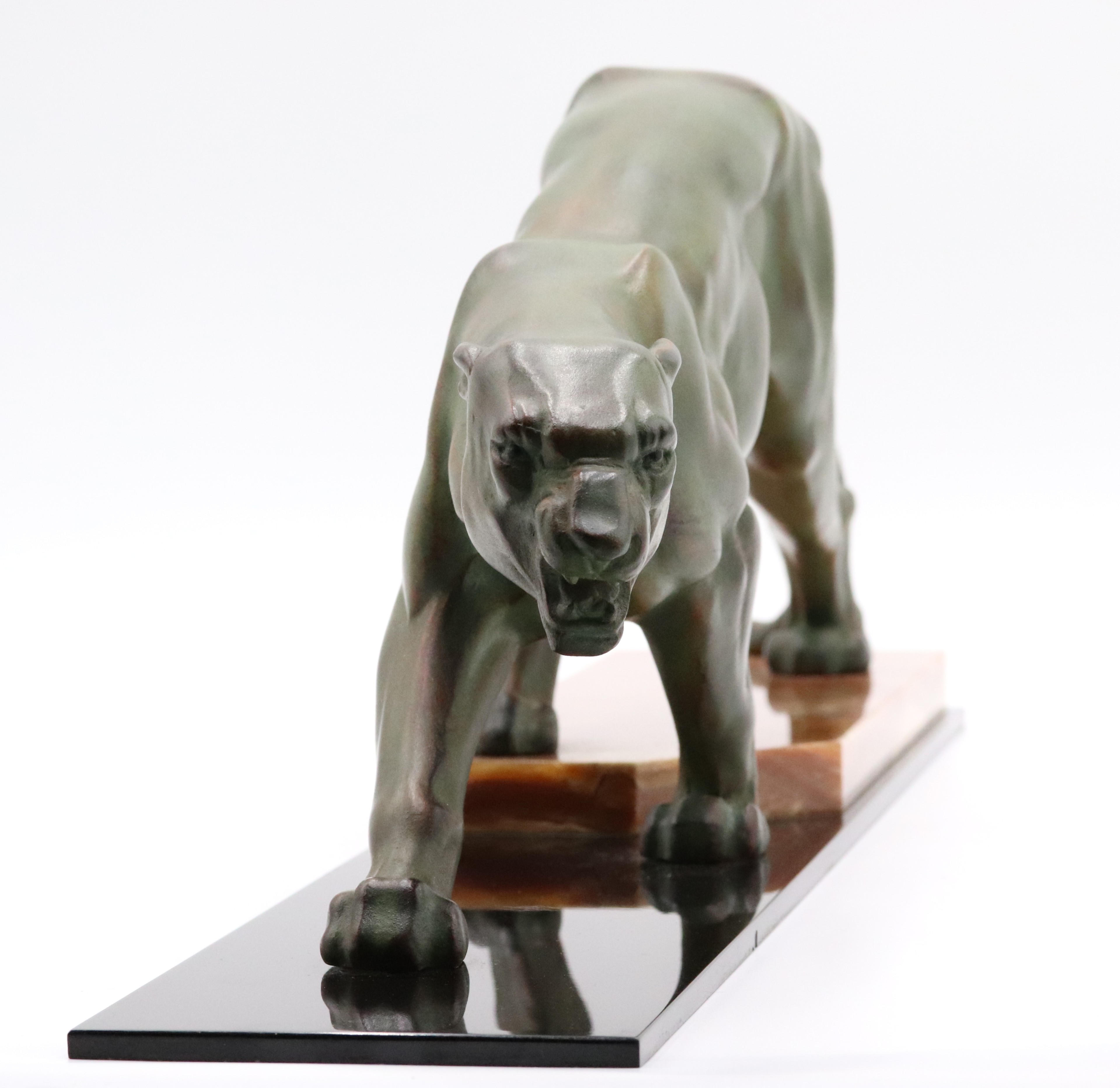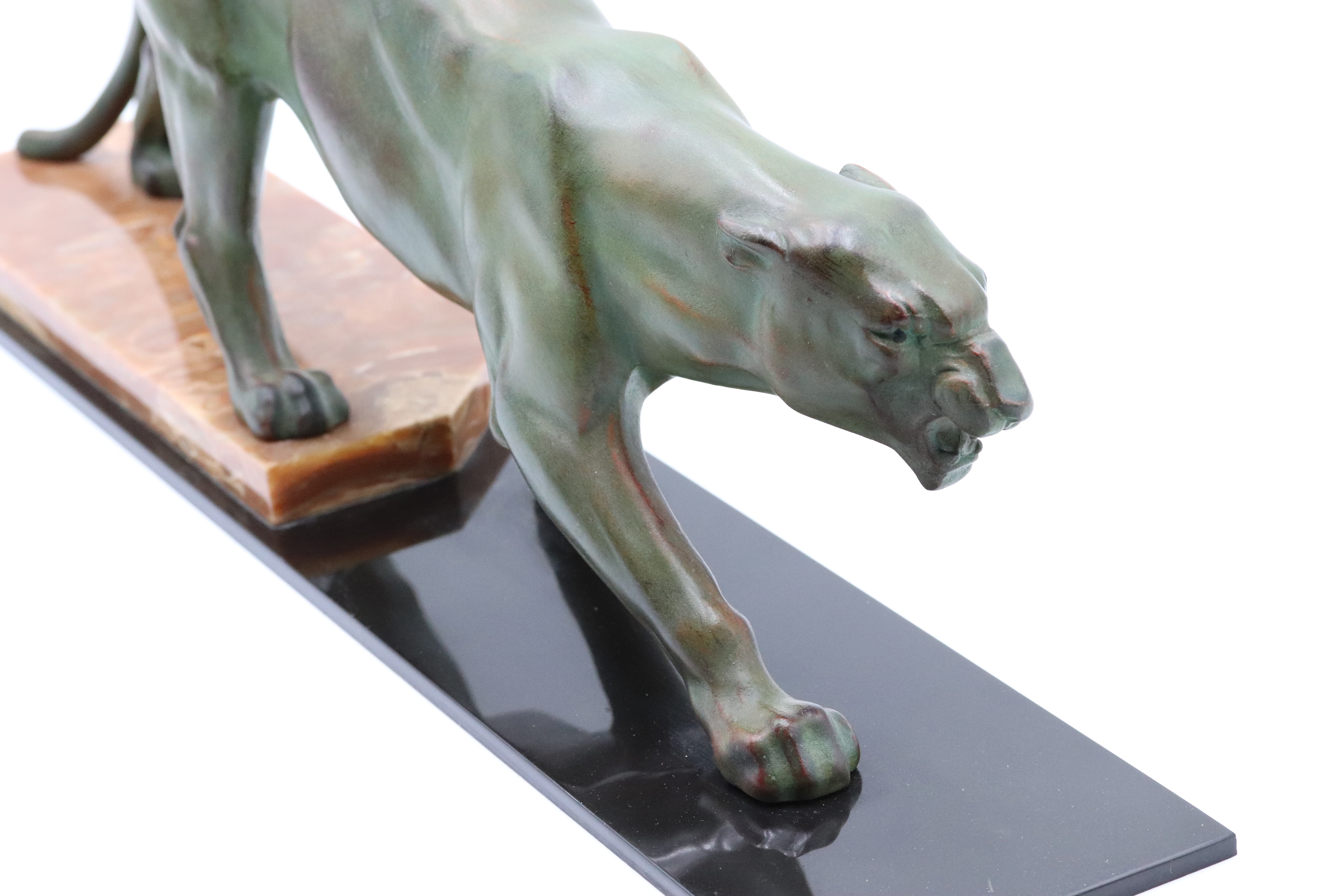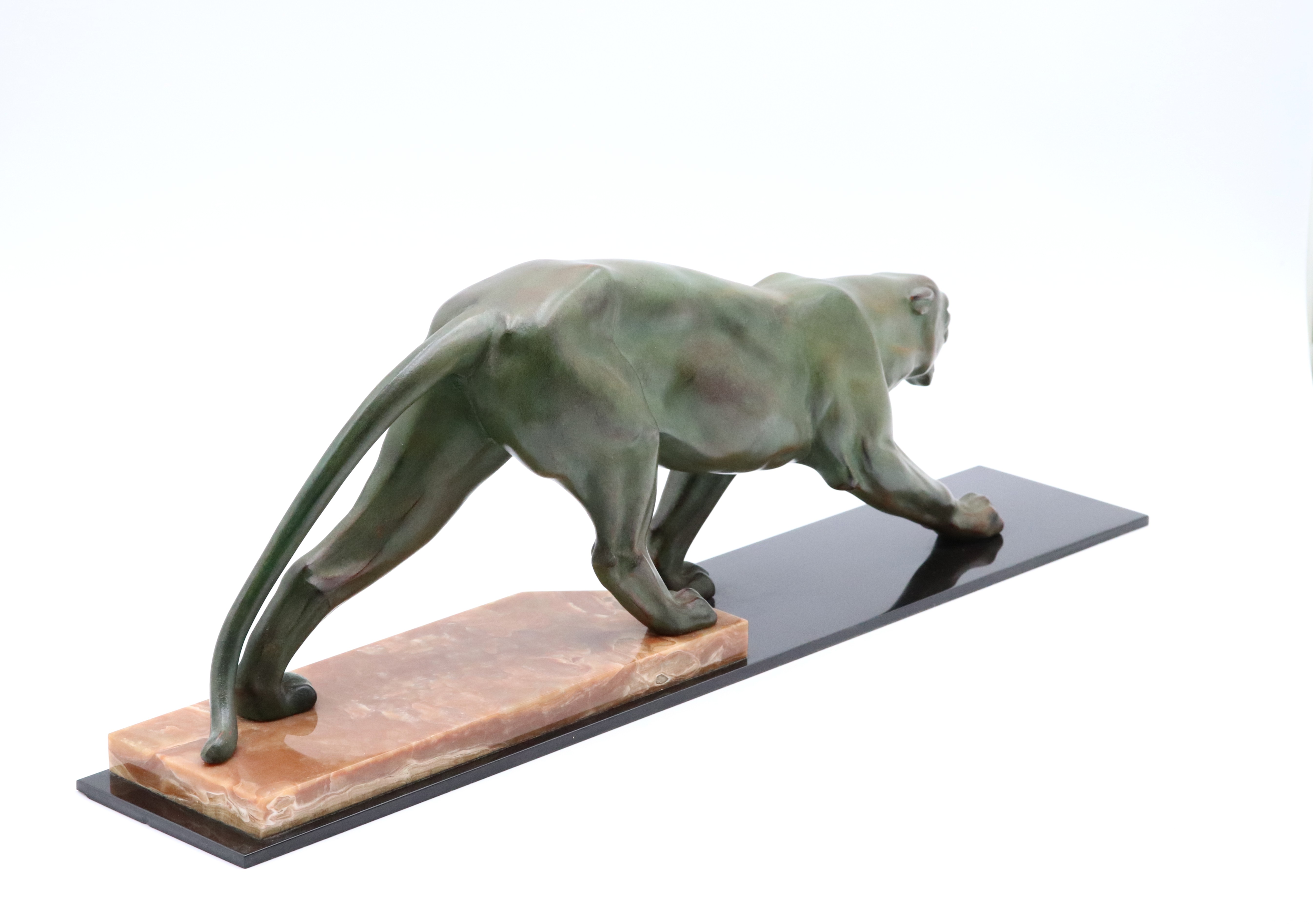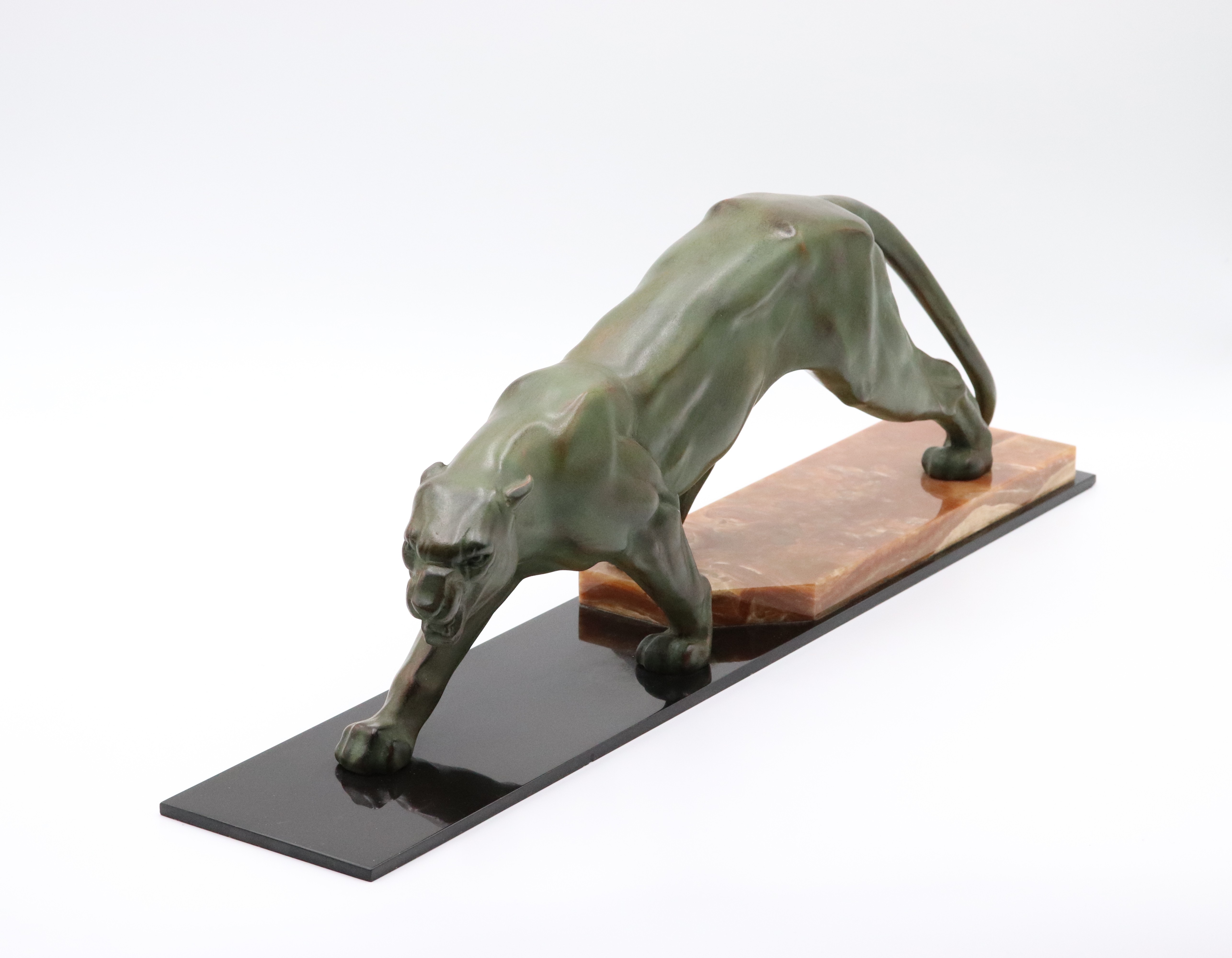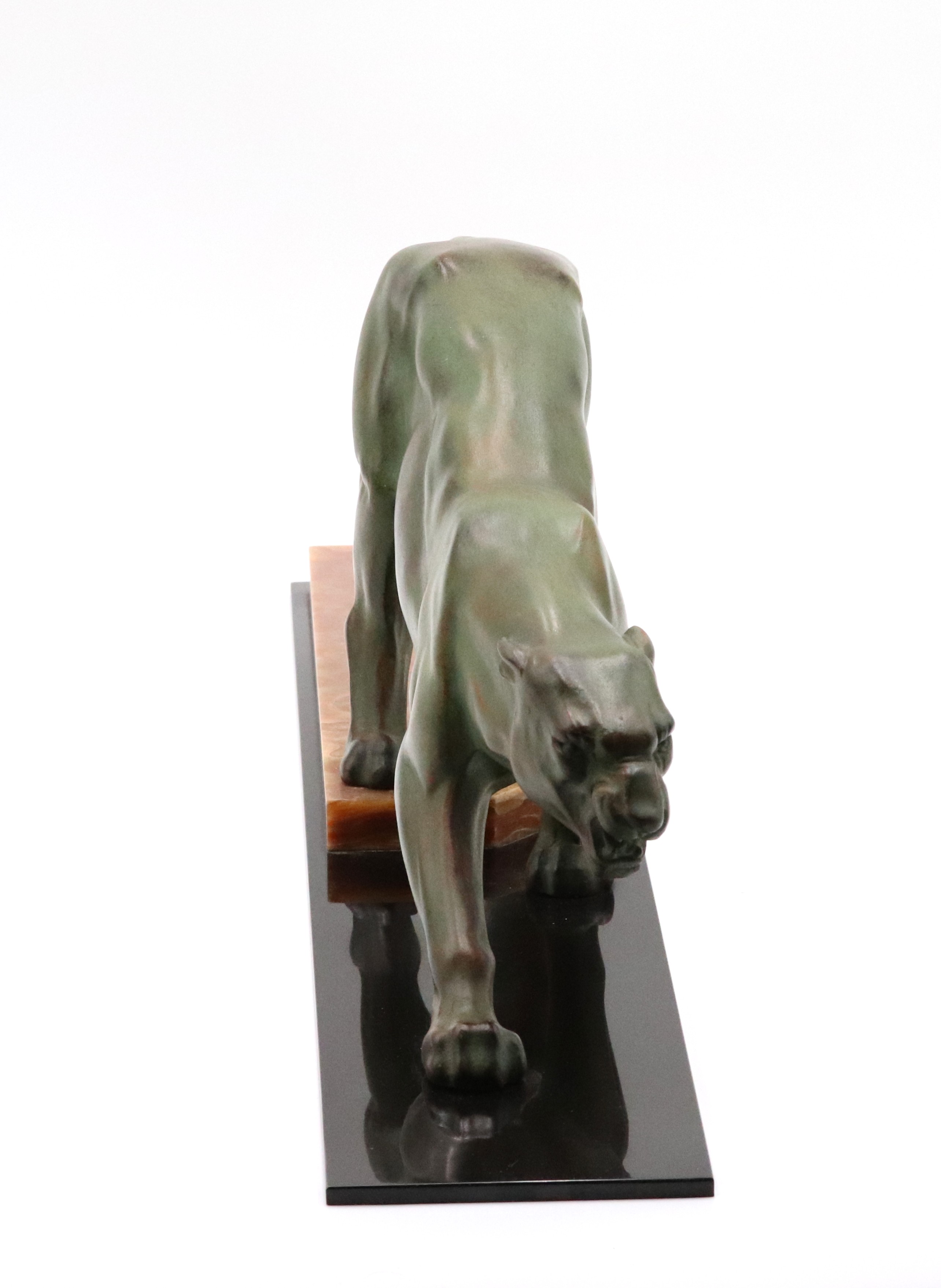 Art deco socha pantera, kovová patinovaná kompozice, podstavec mramorový na černé, opaxitové desce, Francie, 20. – 30. léta 20. století; délka 64 cm, šířka 12,5 cm, výška 22 cm