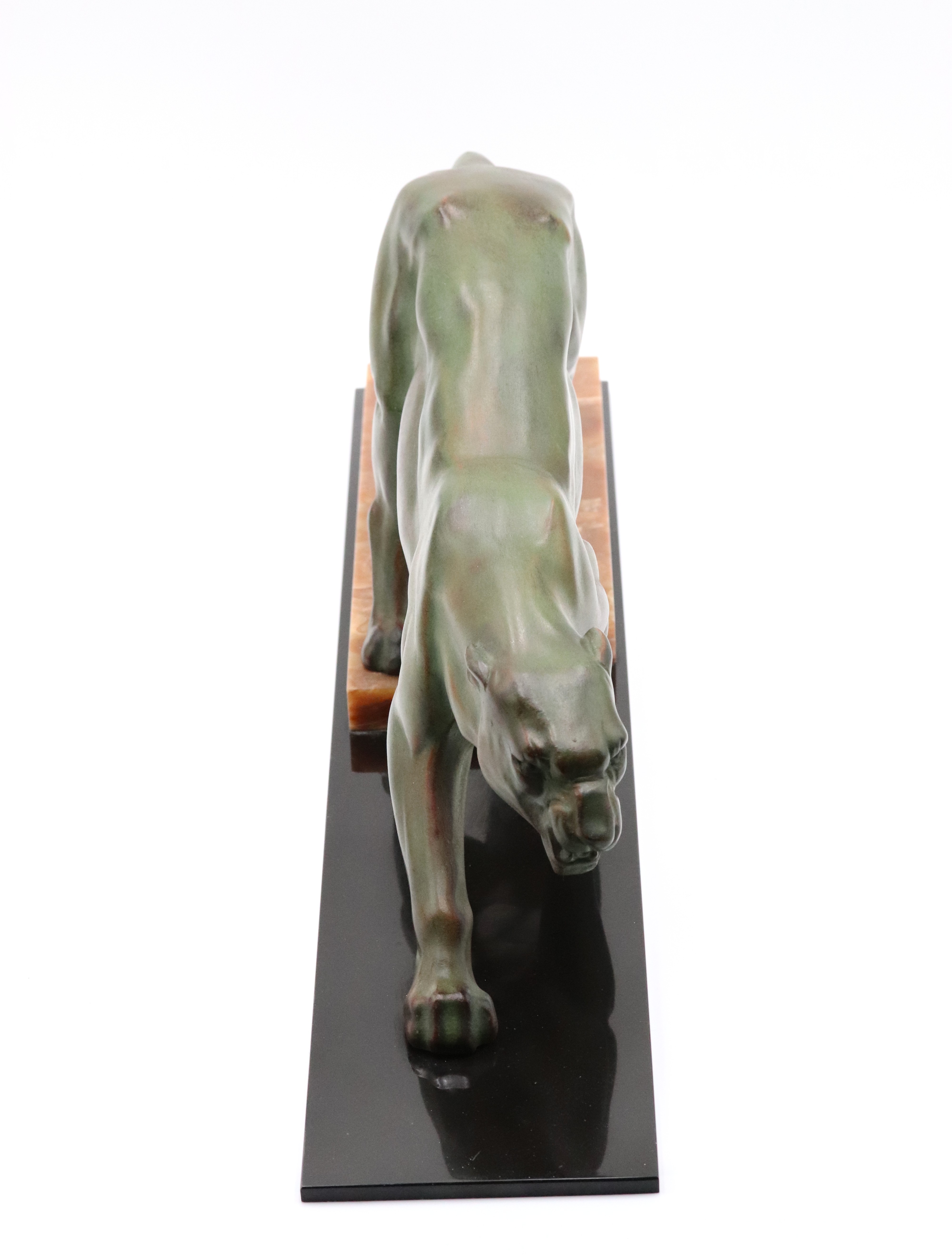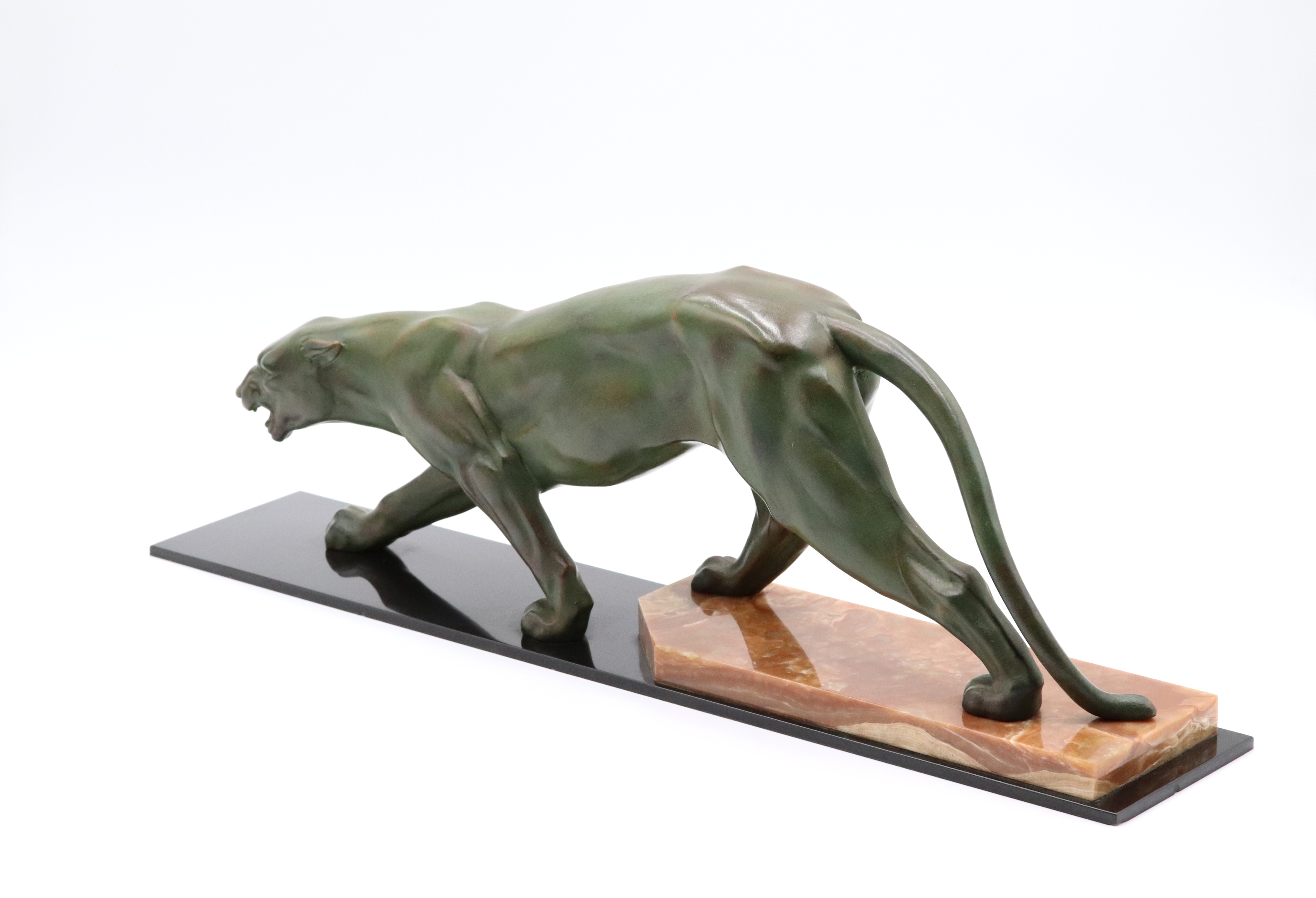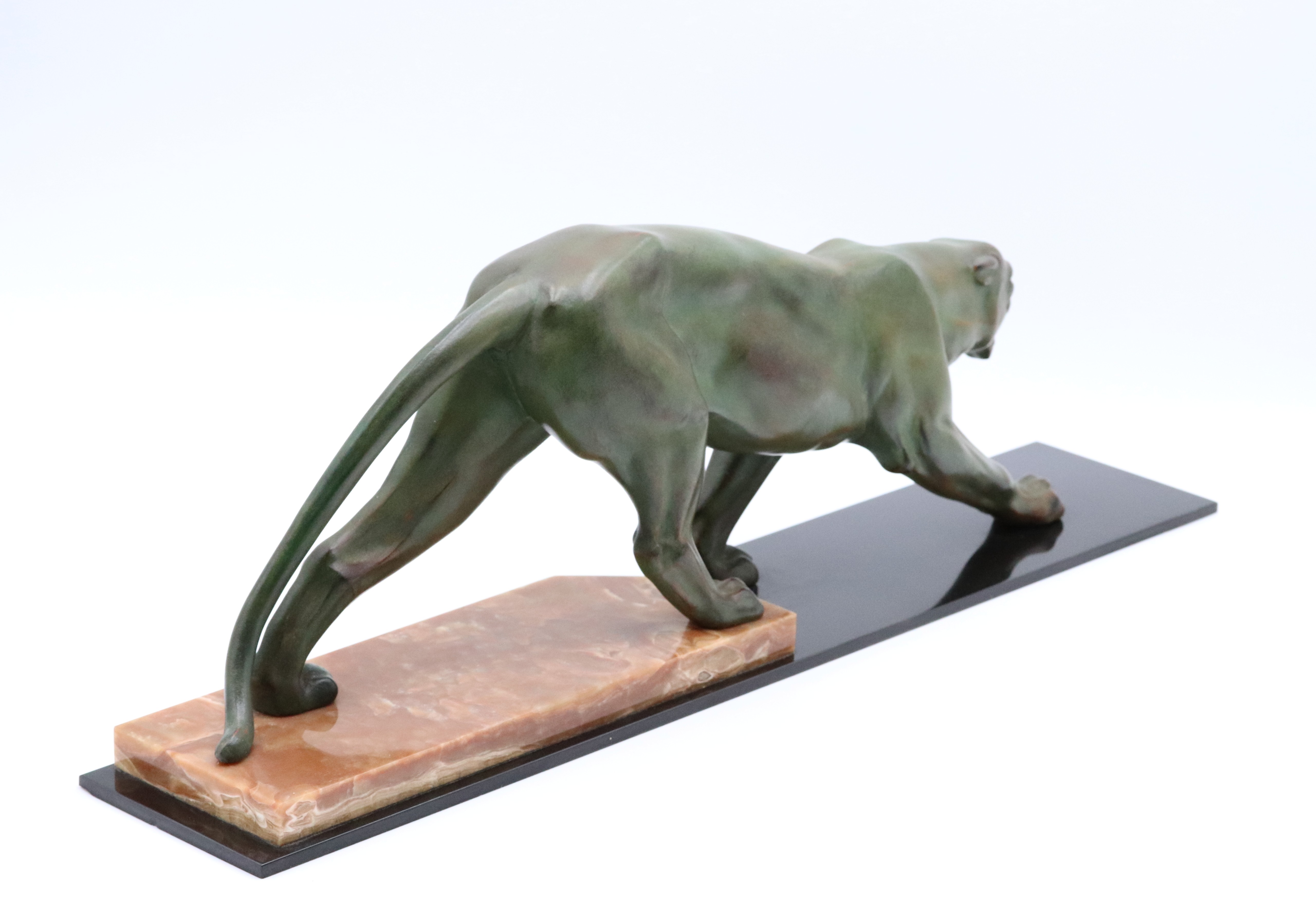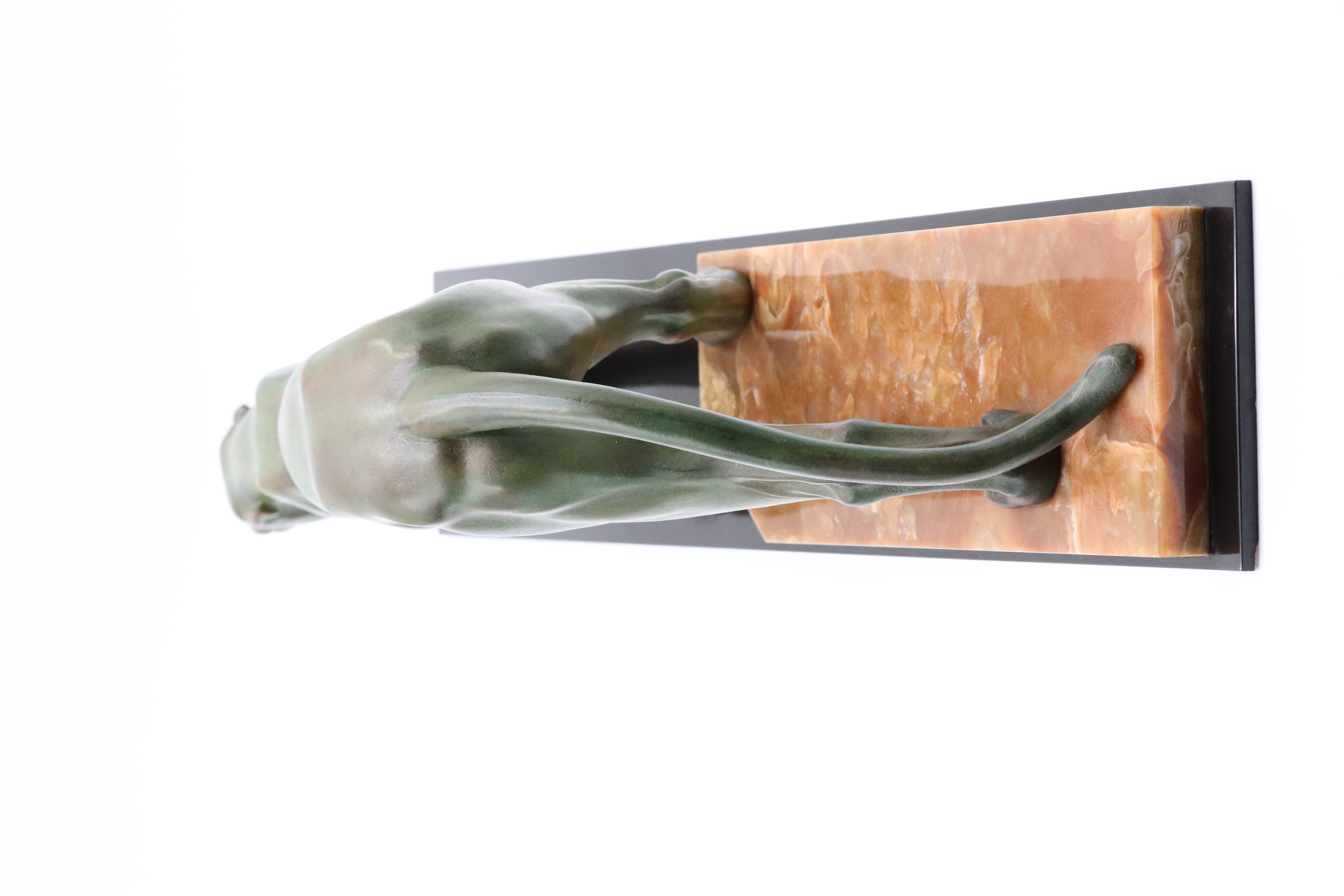 Art deco socha pantera, kovová patinovaná kompozice, podstavec mramorový na černé, opaxitové desce, Francie, 20. – 30. léta 20. století; délka 64 cm, šířka 12,5 cm, výška 22 cm