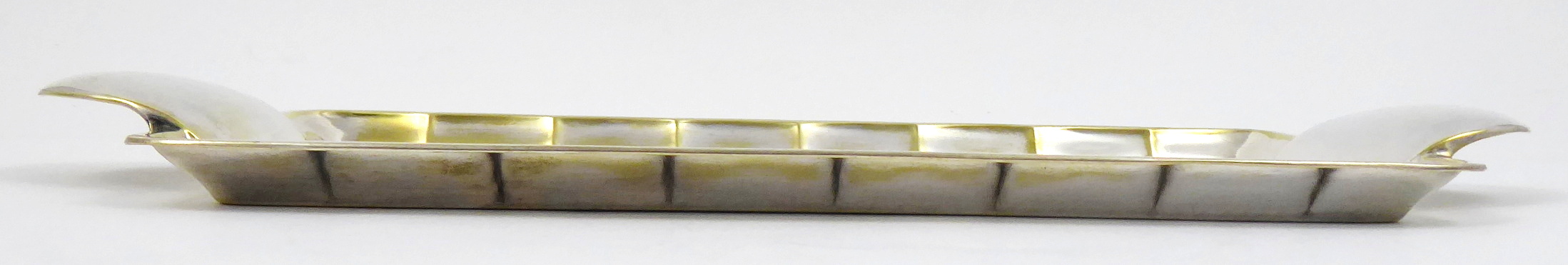 Postříbřená mosaz. Období a styl: art deco. Sandrik, Velké Hámre. Celková hmotnost 437 g. Obdélný tác z postříbřené mosazi s prolamovanými okraji a obloukovitými úchyty. Místy stříbření setřelé. Značeno: firemní značka rozeta s nápisem SANDRIK v trojúhelníku. Československo, Velké Hámre 1925 – 1935. Celkový rozměr s úchyty: 39 cm x 16 cm.