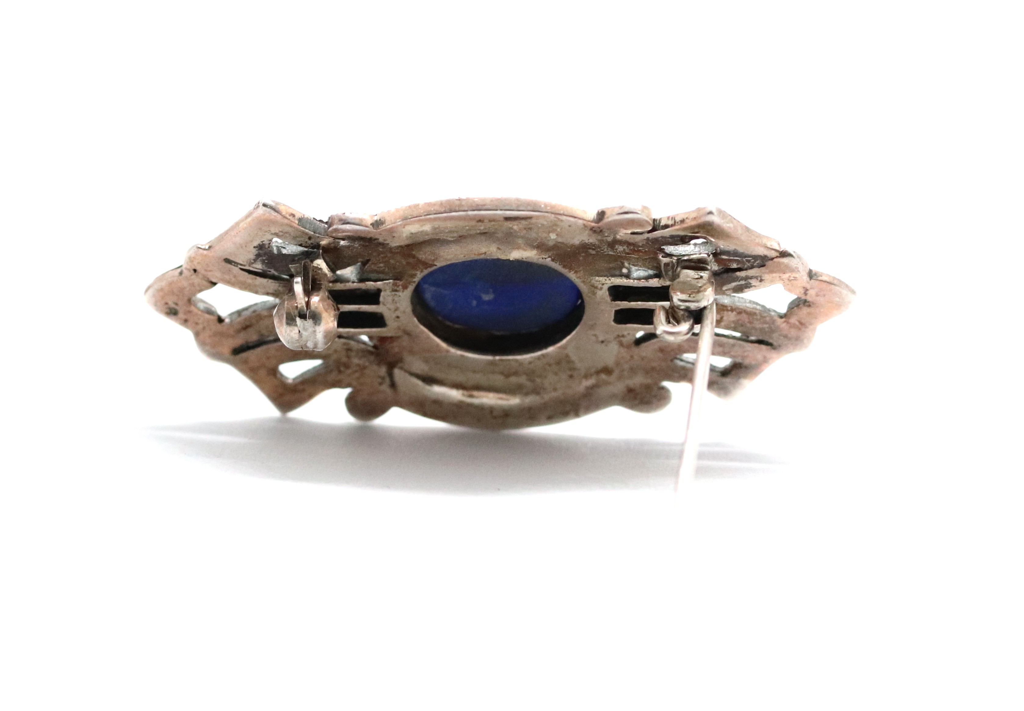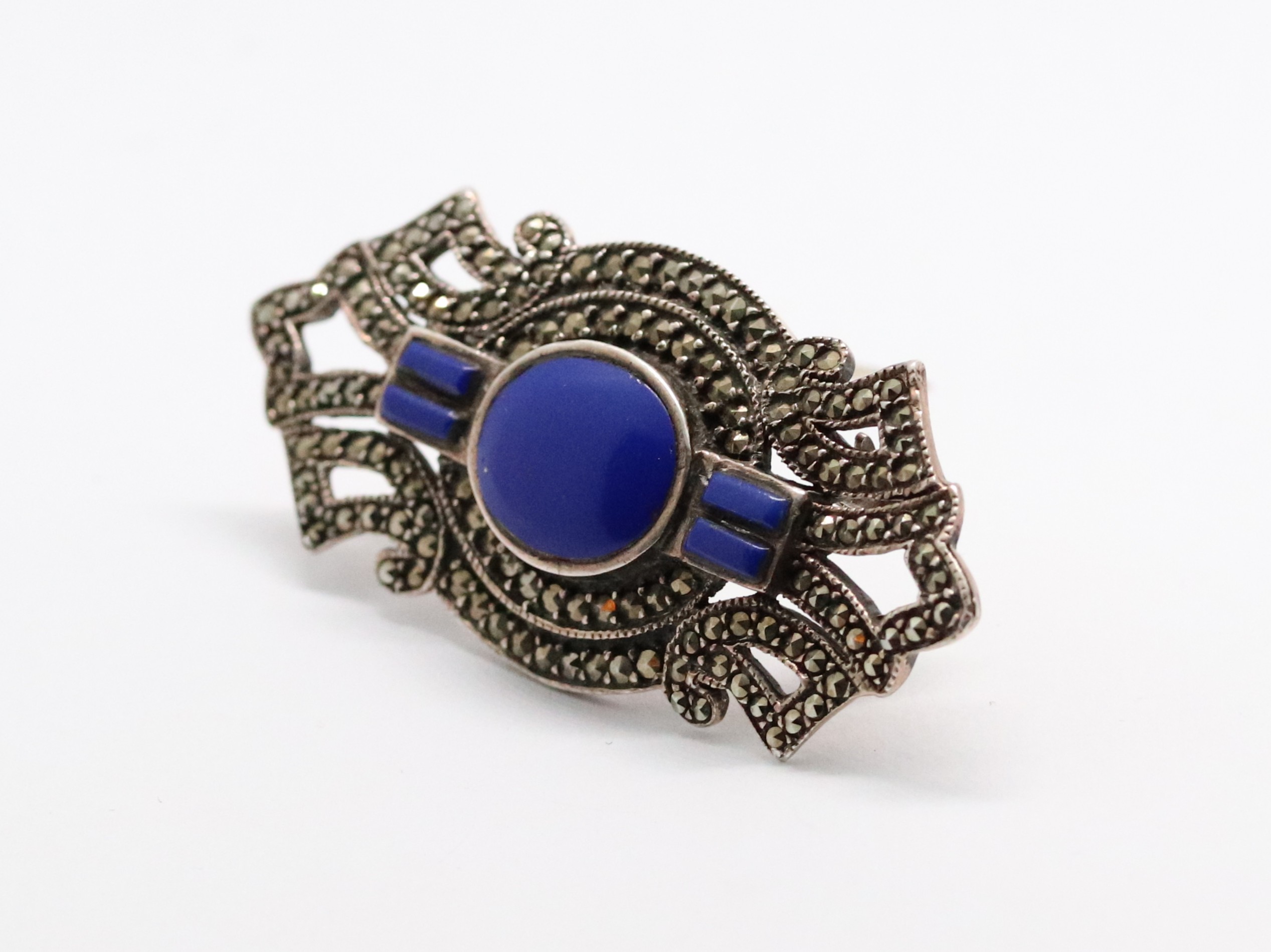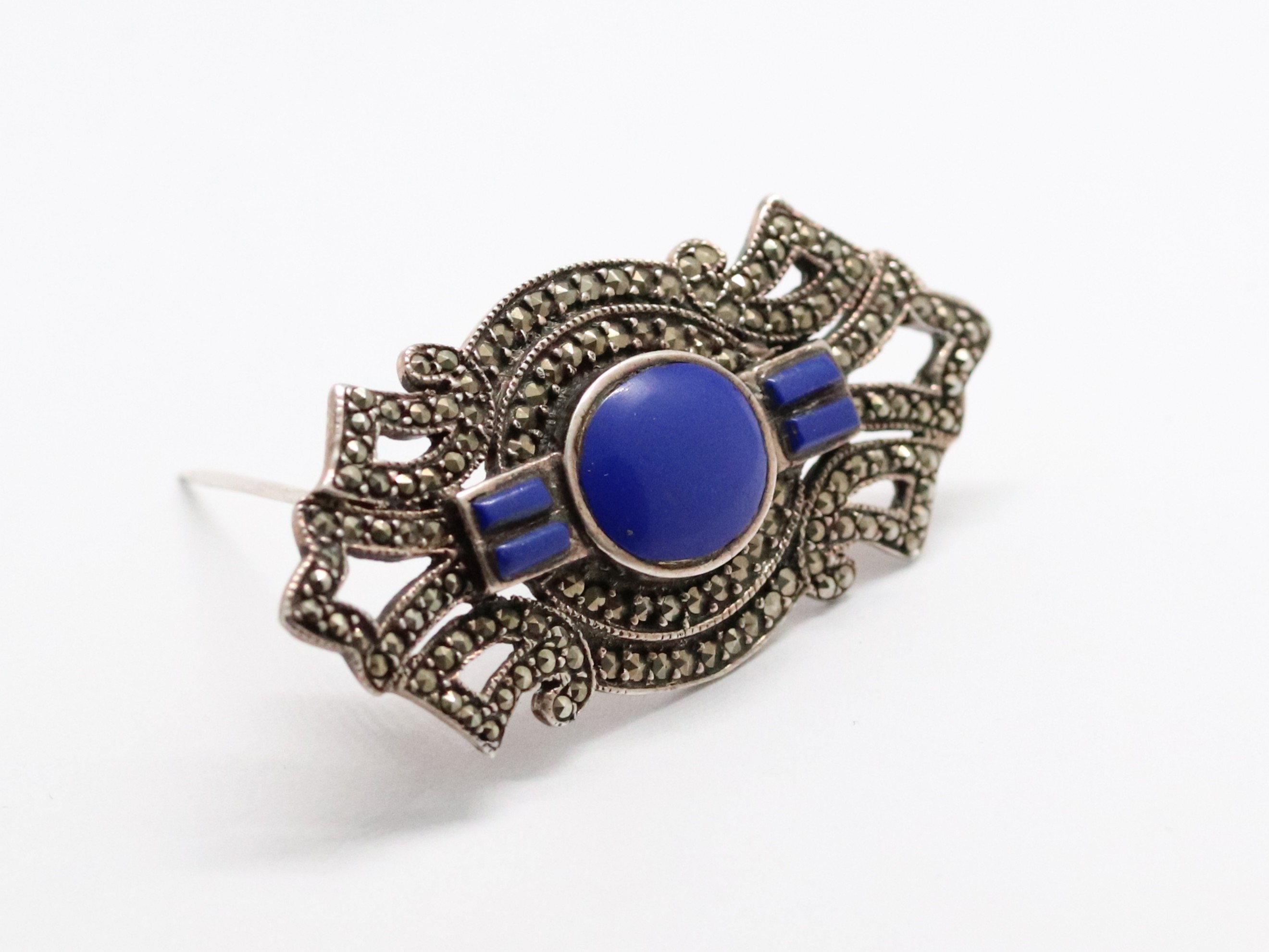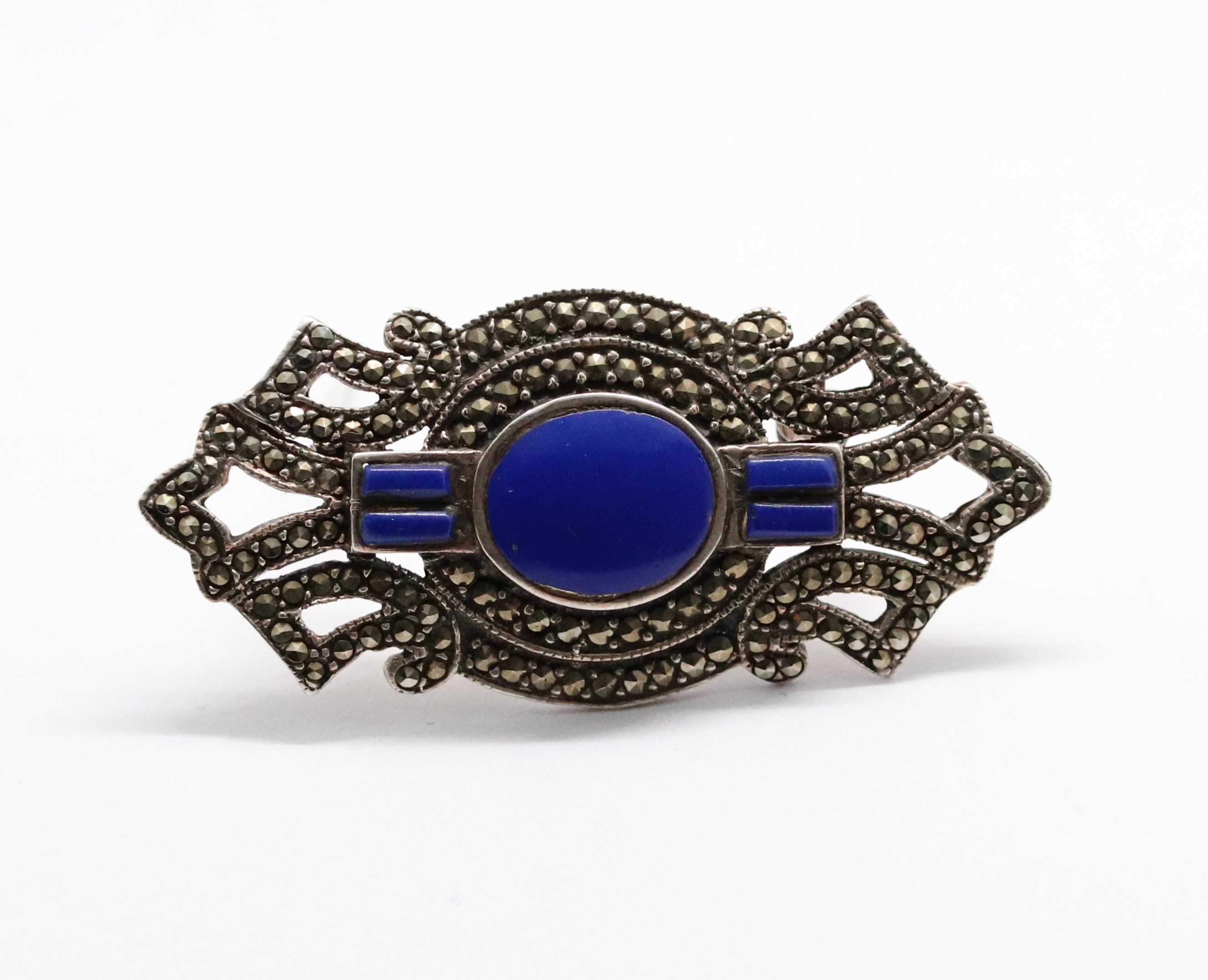 Art deco stříbrná brož s leštěnými lapis lazuli a markazity, Ag btto 9,00g/925/1000, západní Evropa, 30. léta 20. století, atest puncovního úřadu; délka 5 cm, šířka 2,3 cm