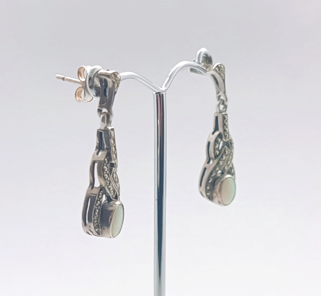 Stříbrné art deco náušnice s australskými opály a markazity, Ag 4,75g/925/1000, puzety z obecného kovu, 30. léta 20. století, atest puncovního úřadu; délka 3,3 cm, šířka 1,1 cm